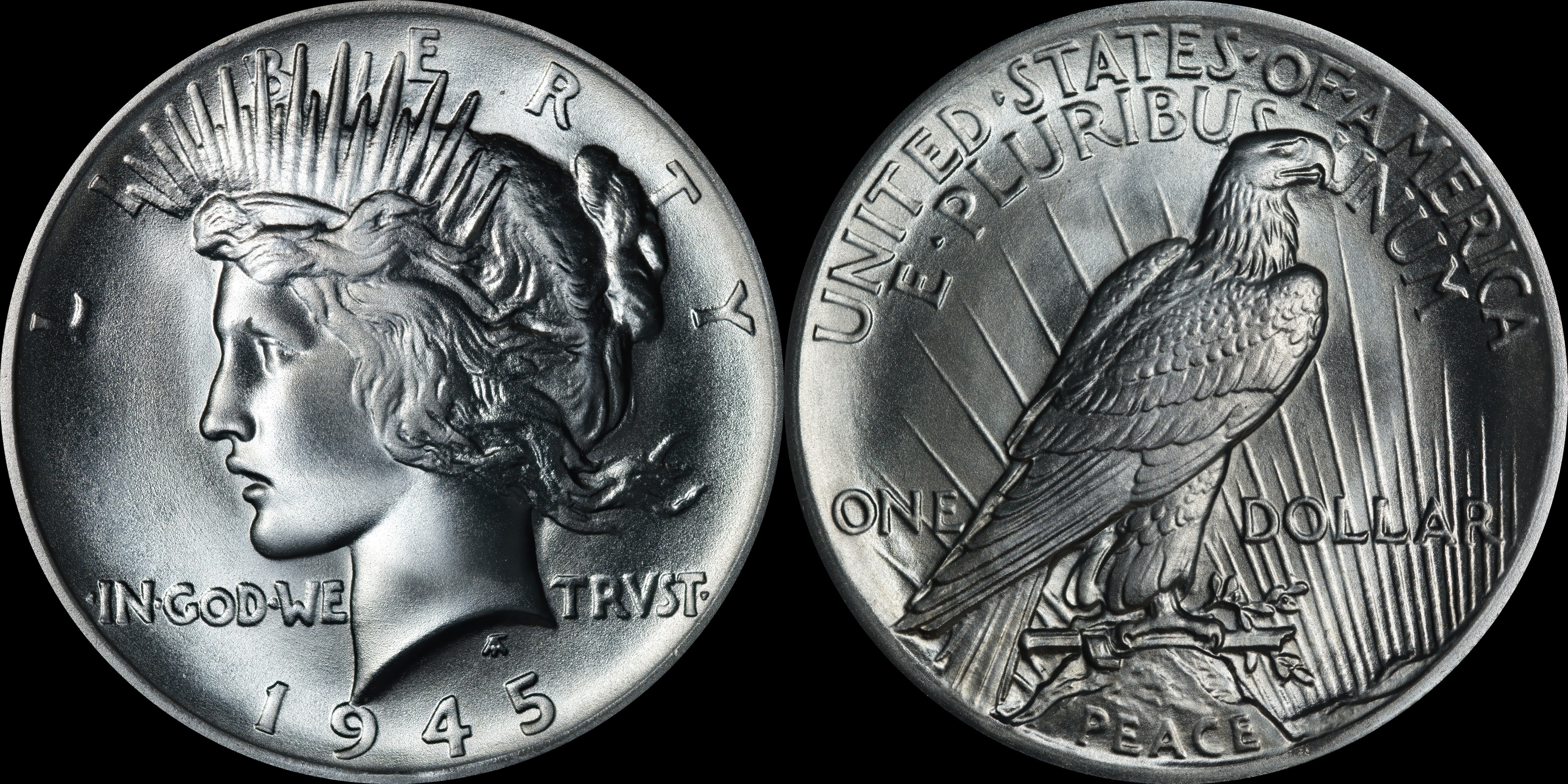 MM_PEACE_1945_1. Daniel Carr. Overstruck on Peace dollar. Die pair 7. Brilliant satin, high grade, high relief, "broken sword" in the eagle's claws.