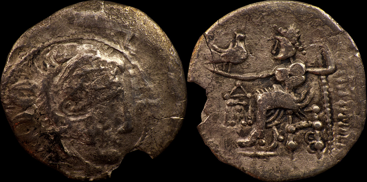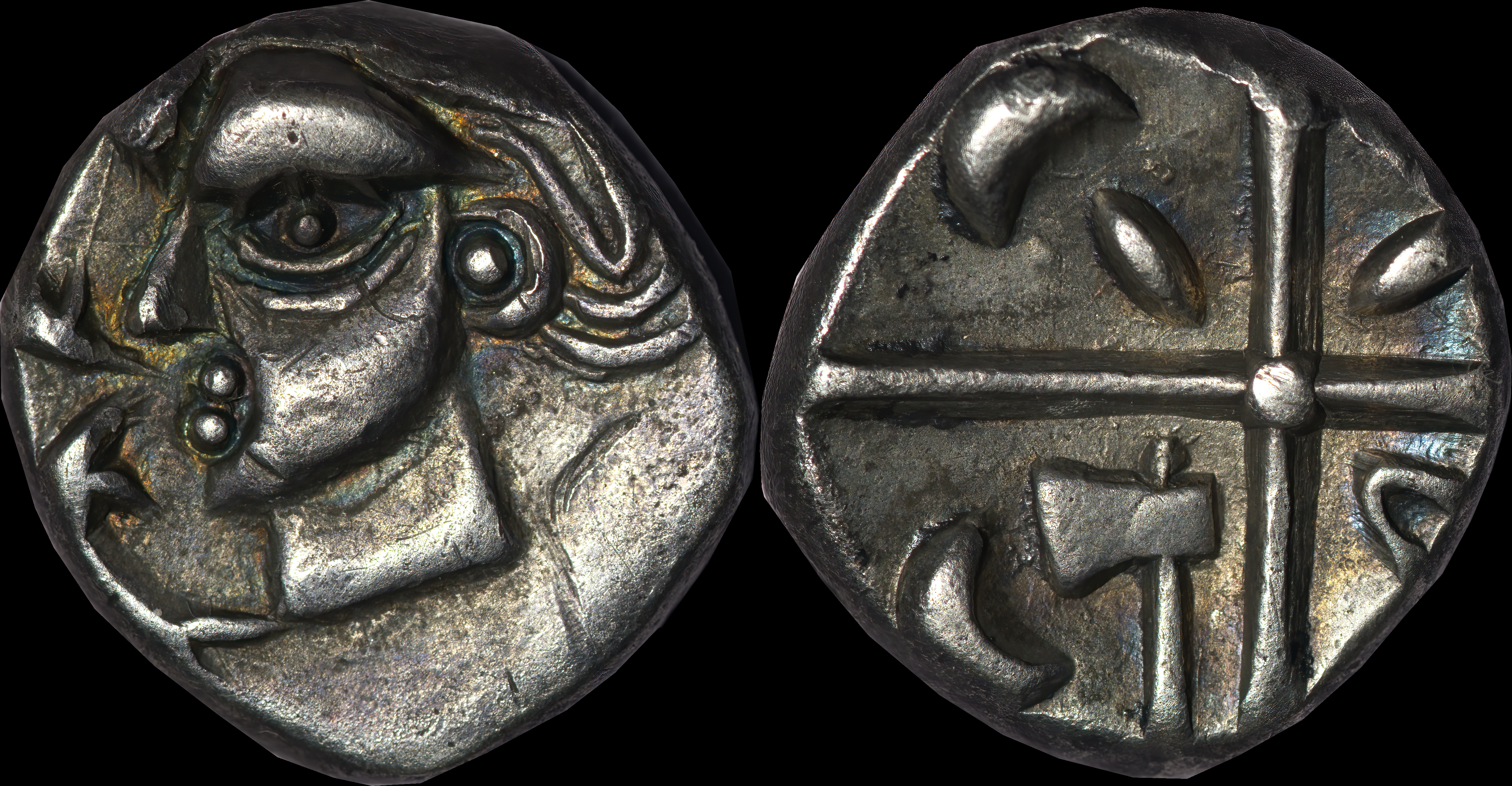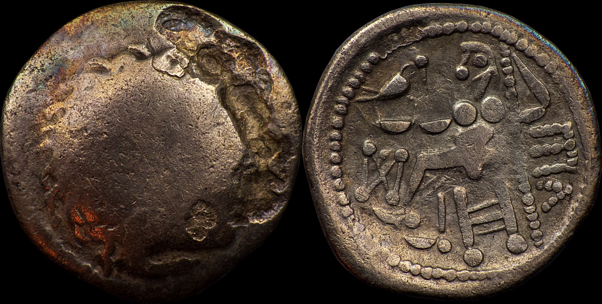 Abstract head of Apollo right. Disjointed, dumpy horse with triple tail with pellet terminals right. Horse's ear made up of two curves forming oval. Wheel below. Charioteer's arm above. Bold pellets in the field. |