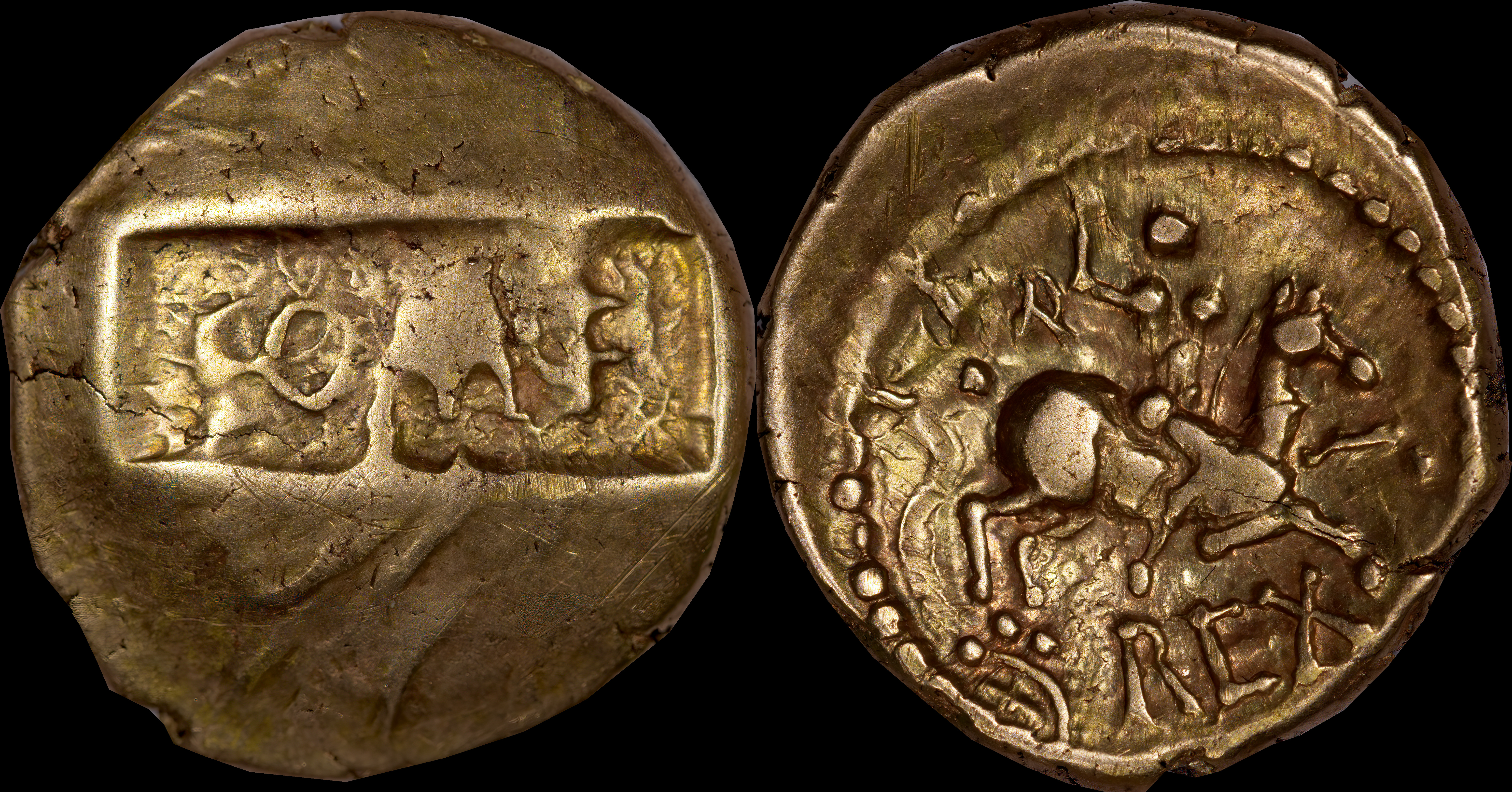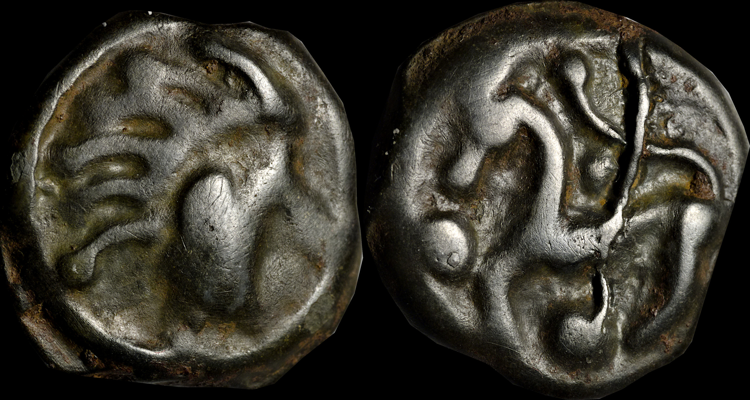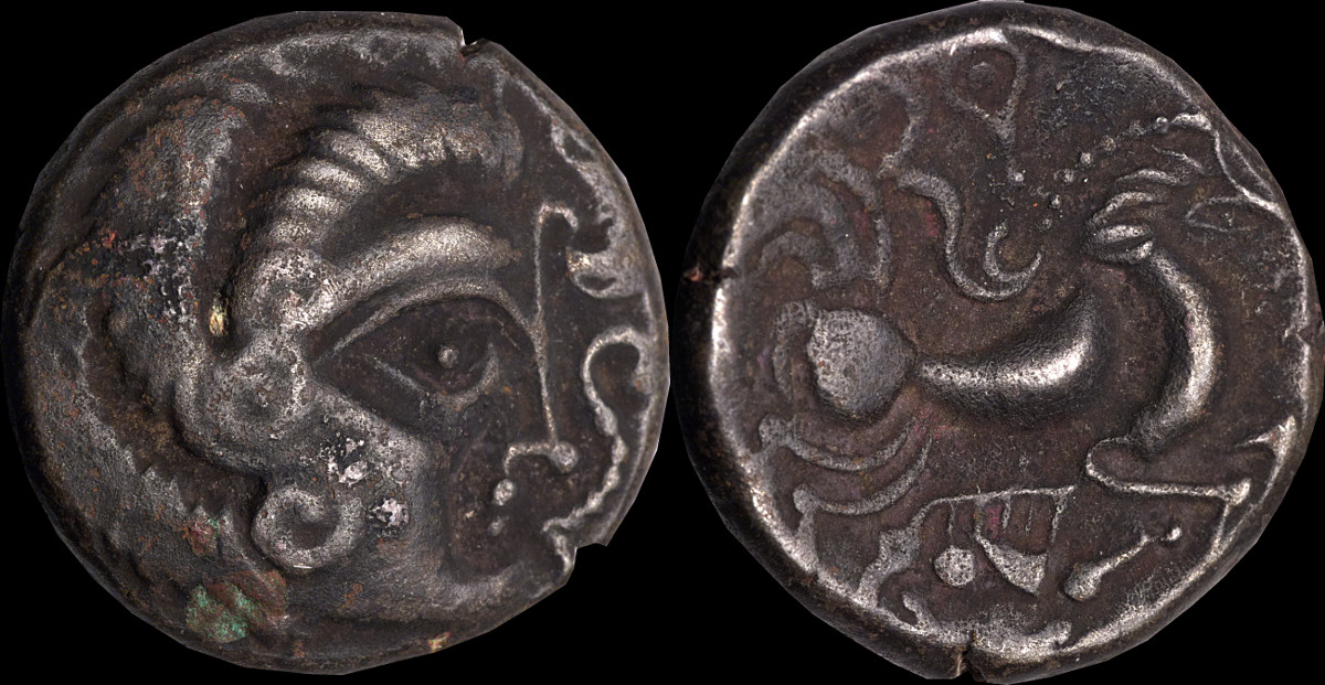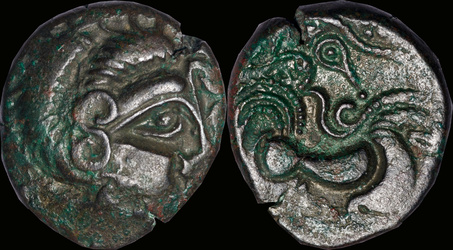 Celtic head right. Horse right with boar below. |