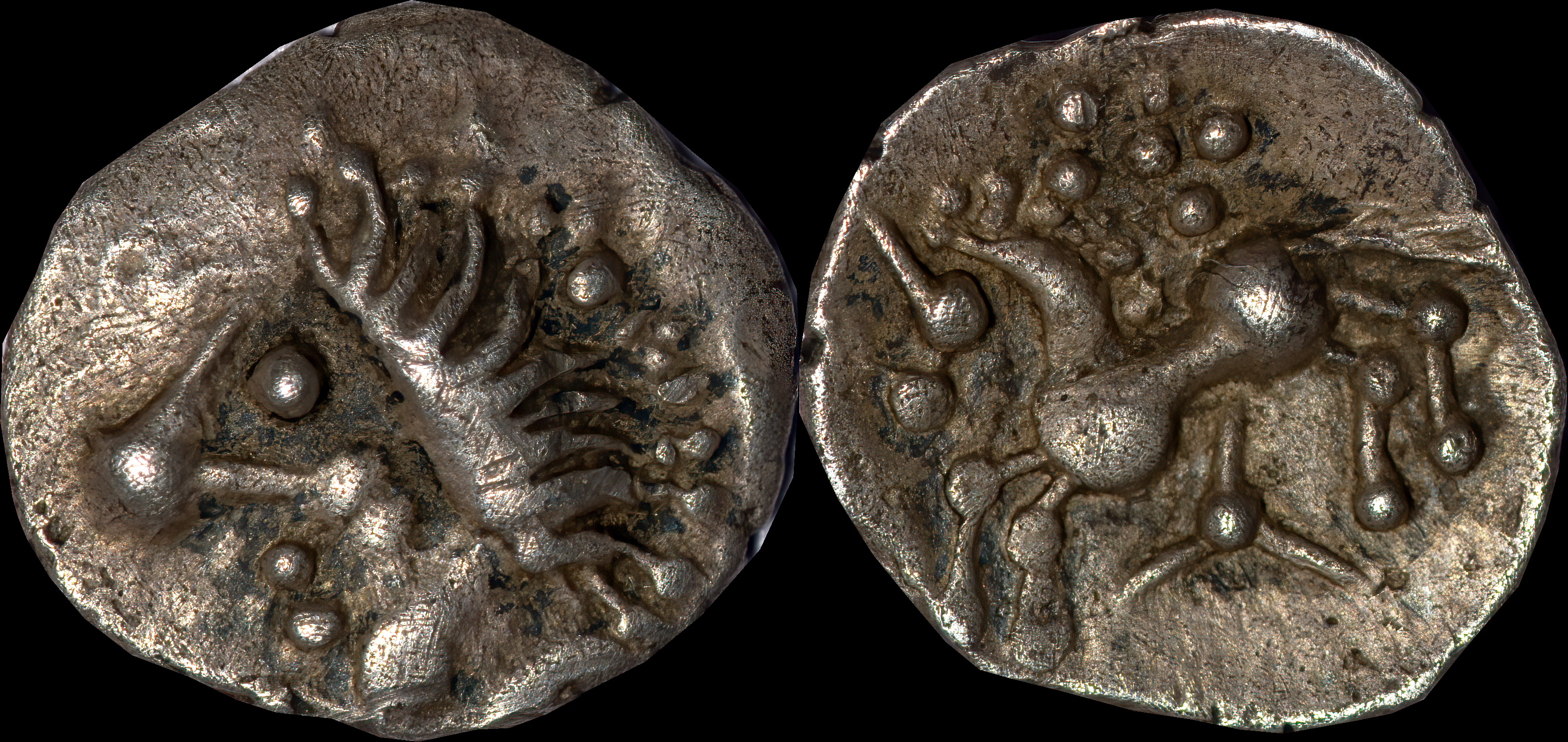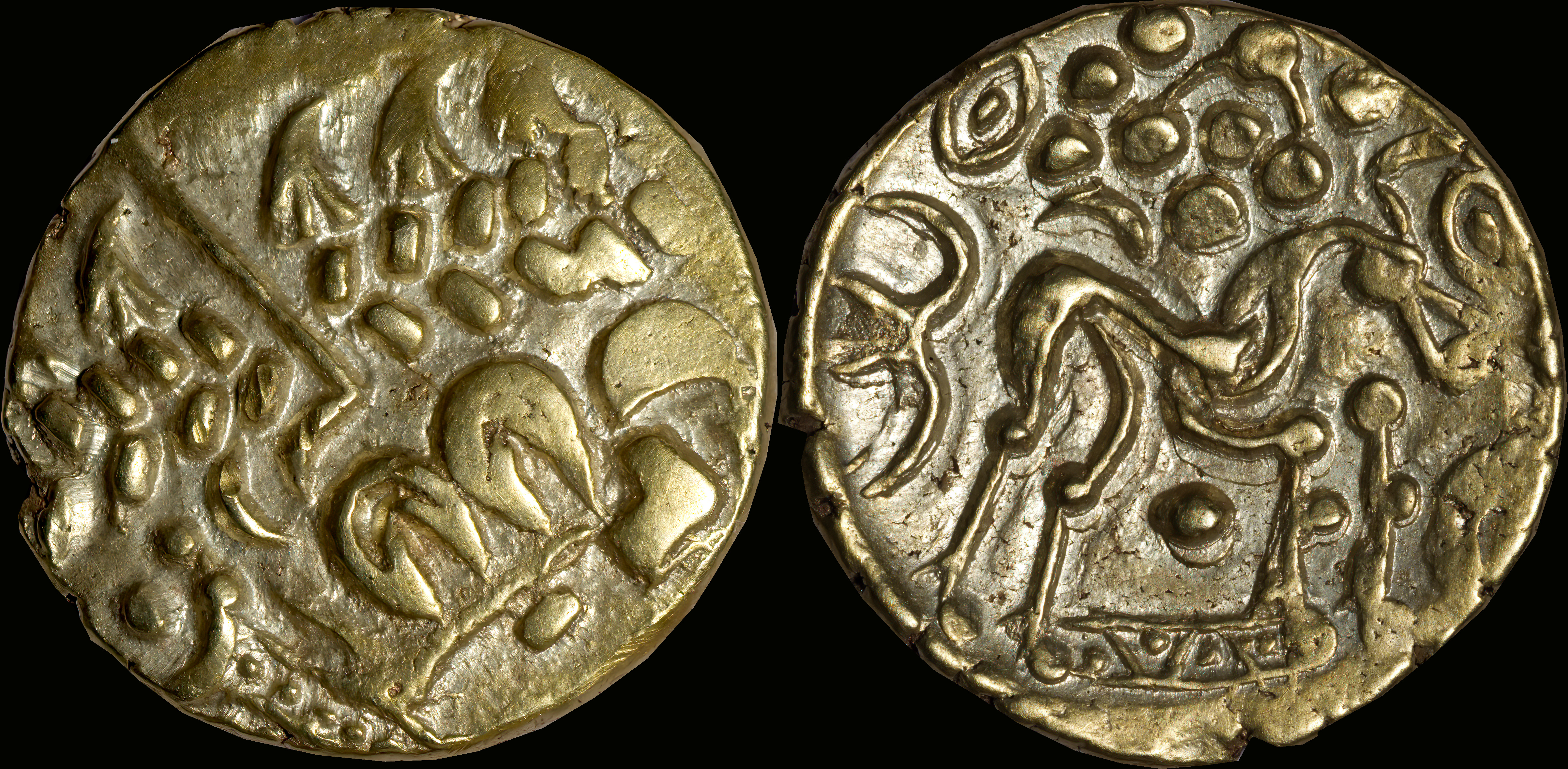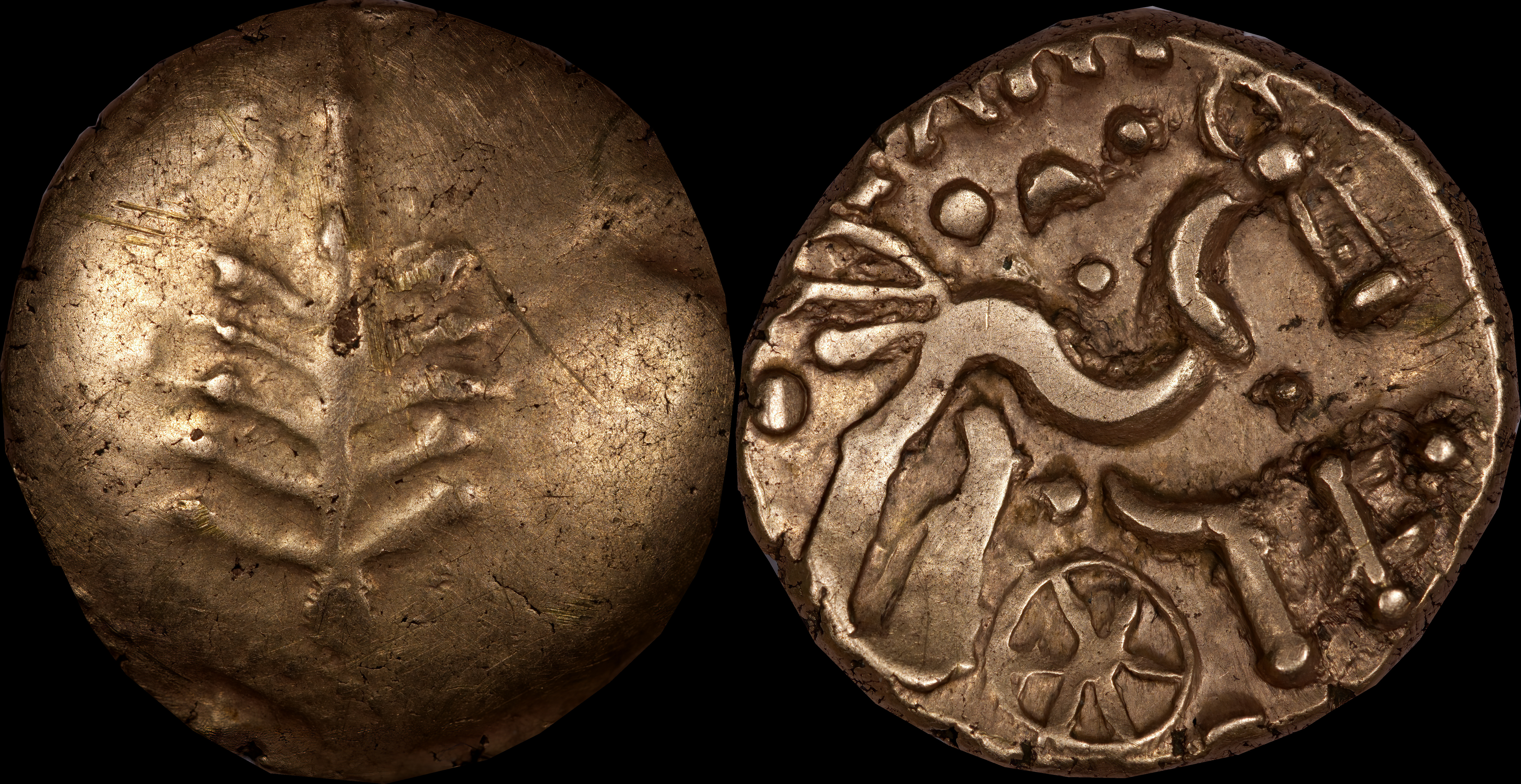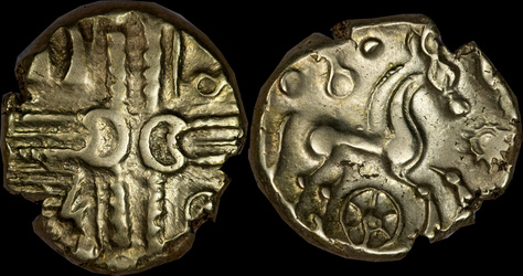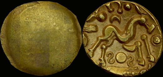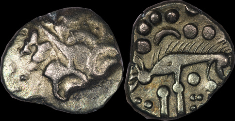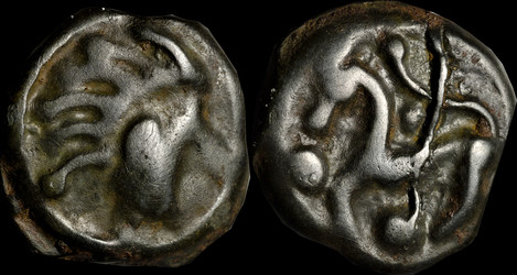 | Allen, Cunobelin โ (dies I/m; unlisted combination), ABC 2798, Van Arsdell 2027-1, Hobbs 1830 (same obv. die in earlier state), S 288. Cunobelin. Cunobelinus Classic, stalk type (Trinovantian X). Unpublished die combination (2025). Ex Trehearne Collection. | |