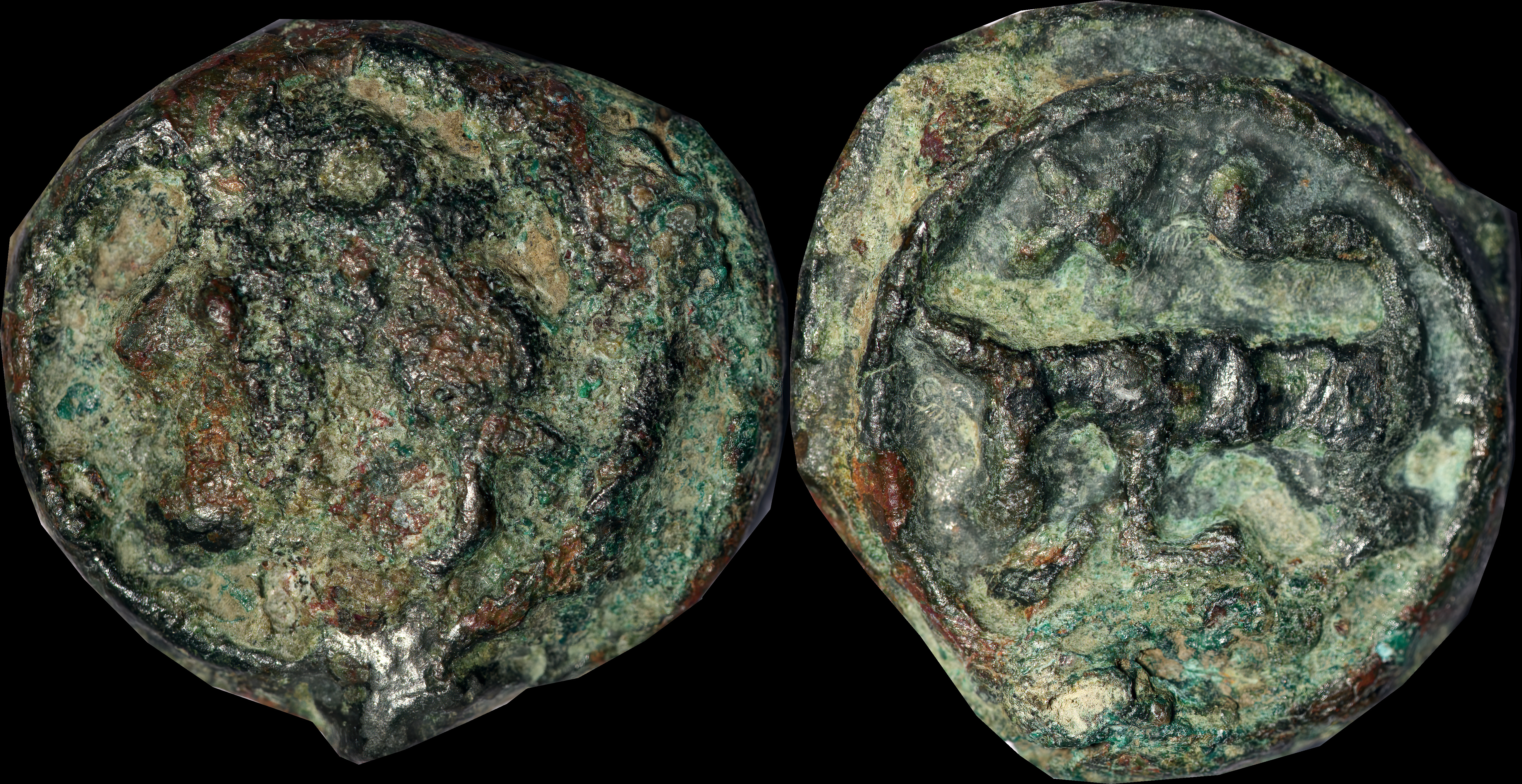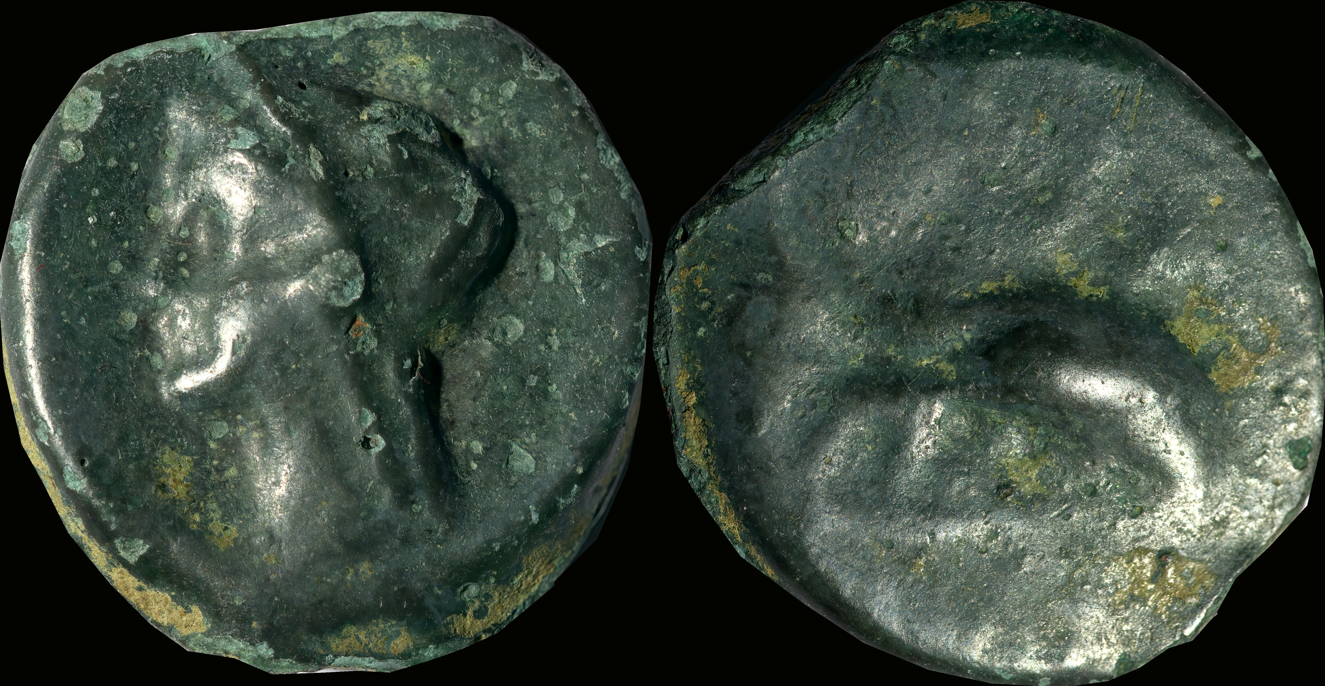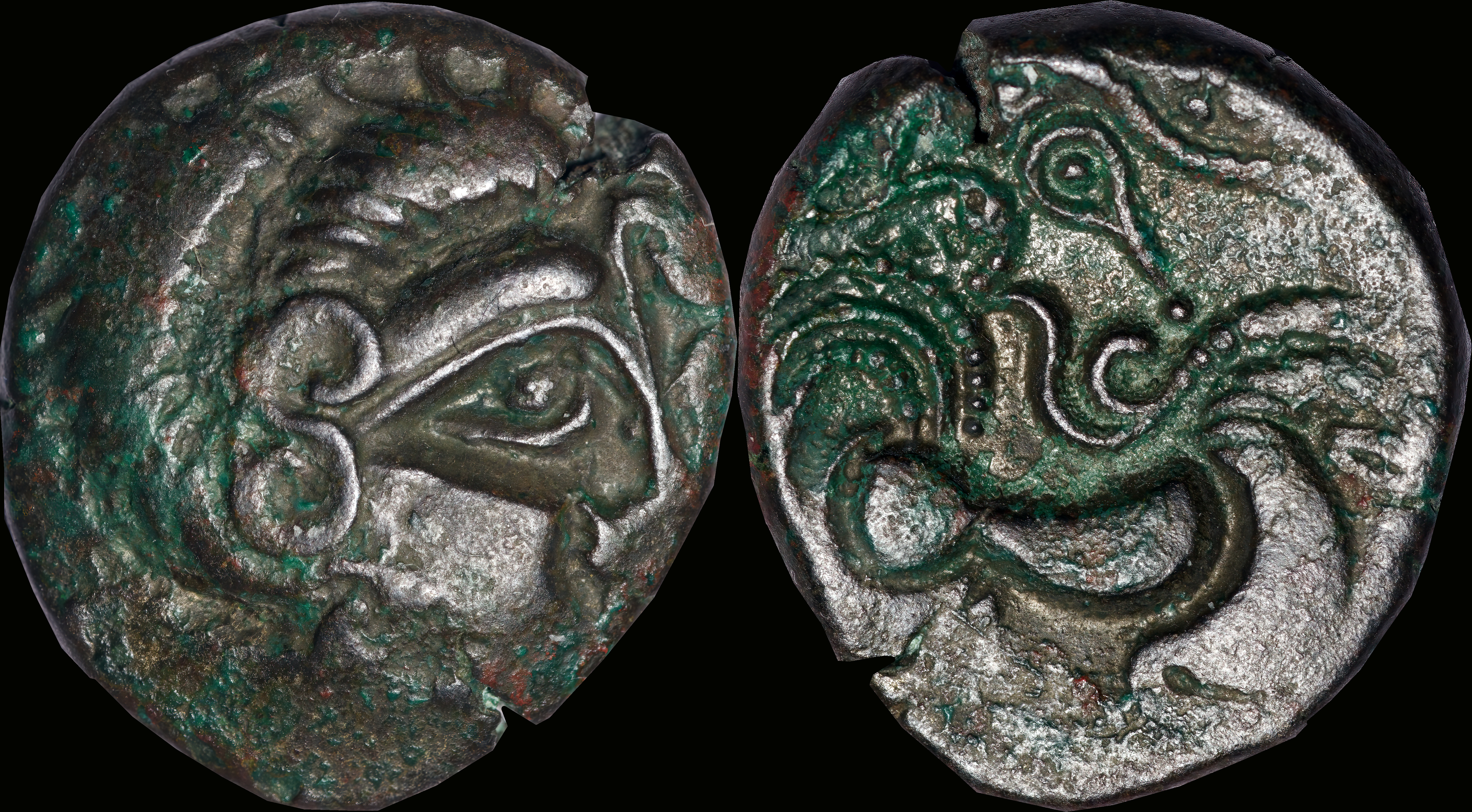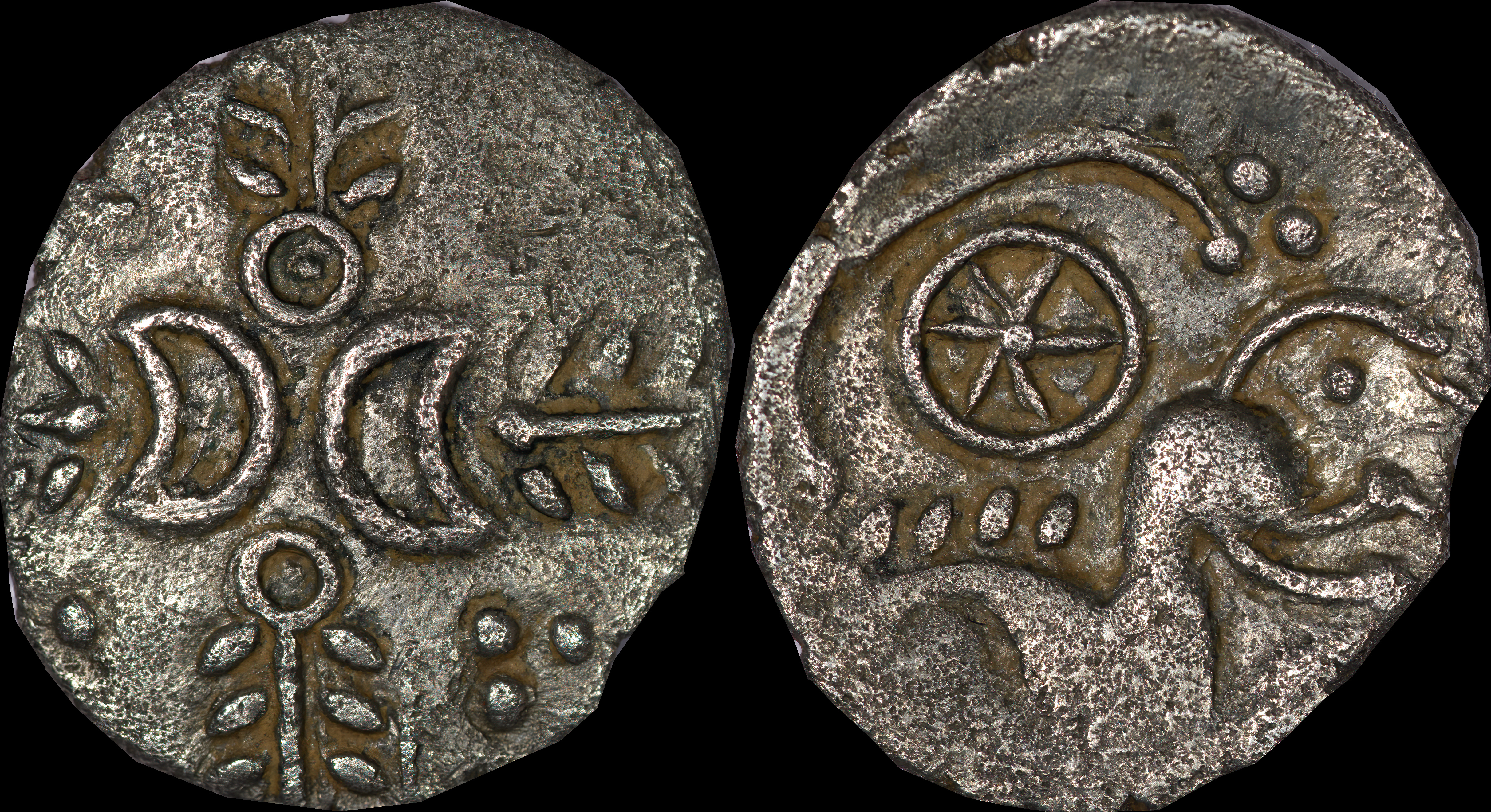 | Allen, Cunobelin โ (dies I/m; unlisted combination), ABC 2798, Van Arsdell 2027-1, Hobbs 1830 (same obv. die in earlier state), S 288. Cunobelin. Cunobelinus Classic, stalk type (Trinovantian X). Unpublished die combination (2025). Ex Trehearne Collection. | |