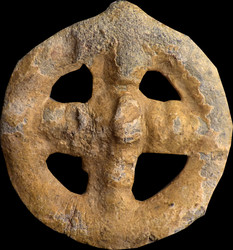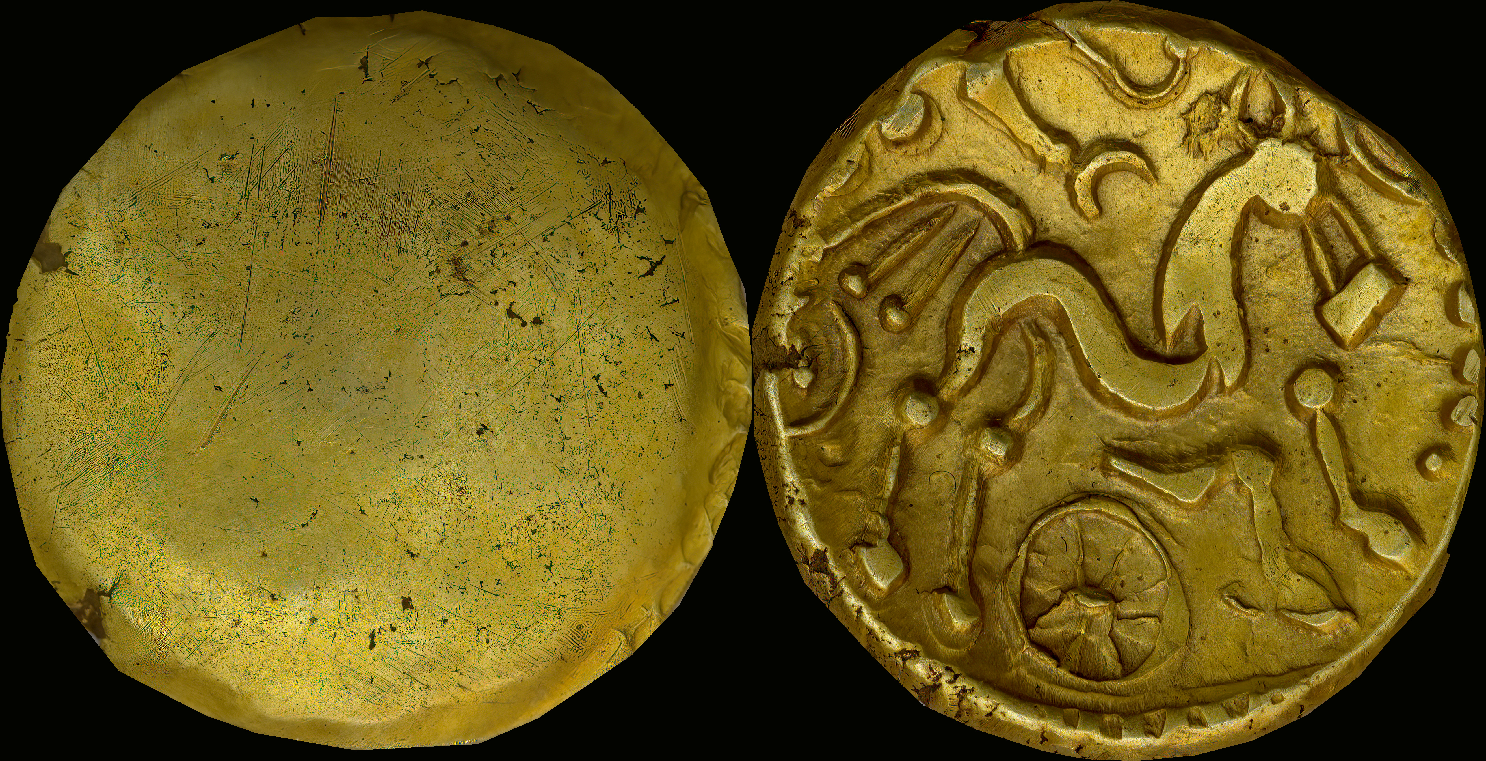 Cruciform design with crossed double wreaths of two corded lines with central line of pellets. Outline linear crescents back-to-back at centre. Horse right, tail made up of a single line. Wing motif above. Six-spoked wheel with axle below. Whorl with ringed pellet at centre in front. Ellipse behind. Wreath (feathered) exergual line. |