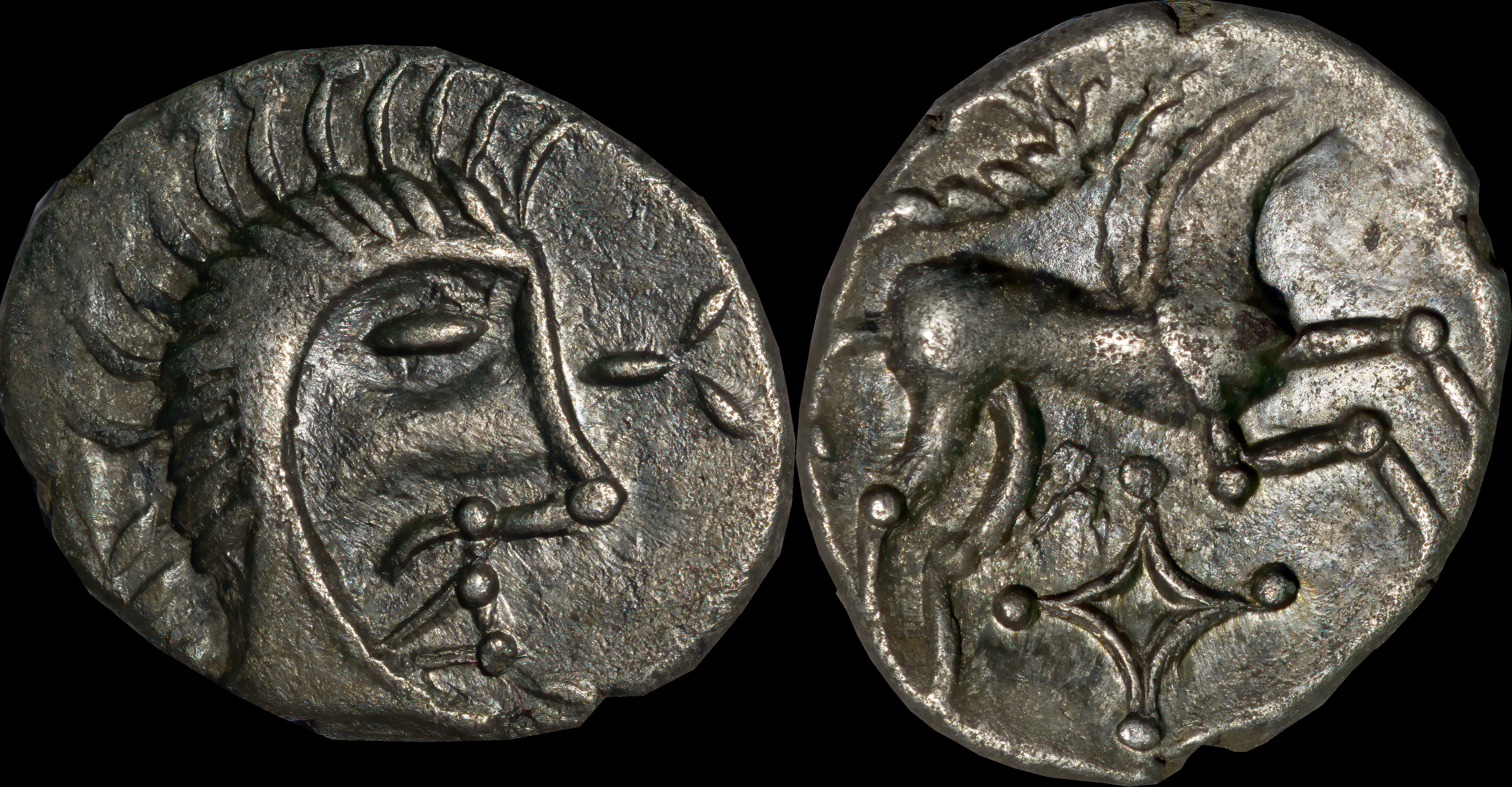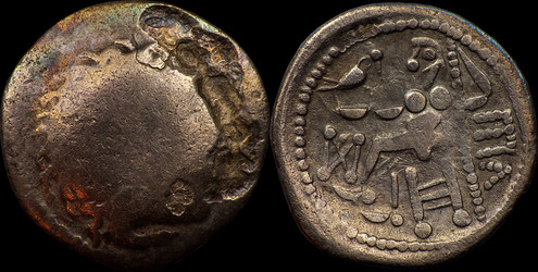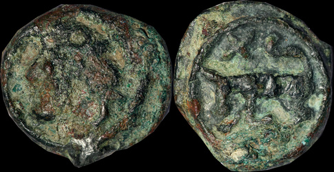 Stylised head right, wreath behind. Horse right with corded mane, pelleted arc and lozenge above, lozenge below. |