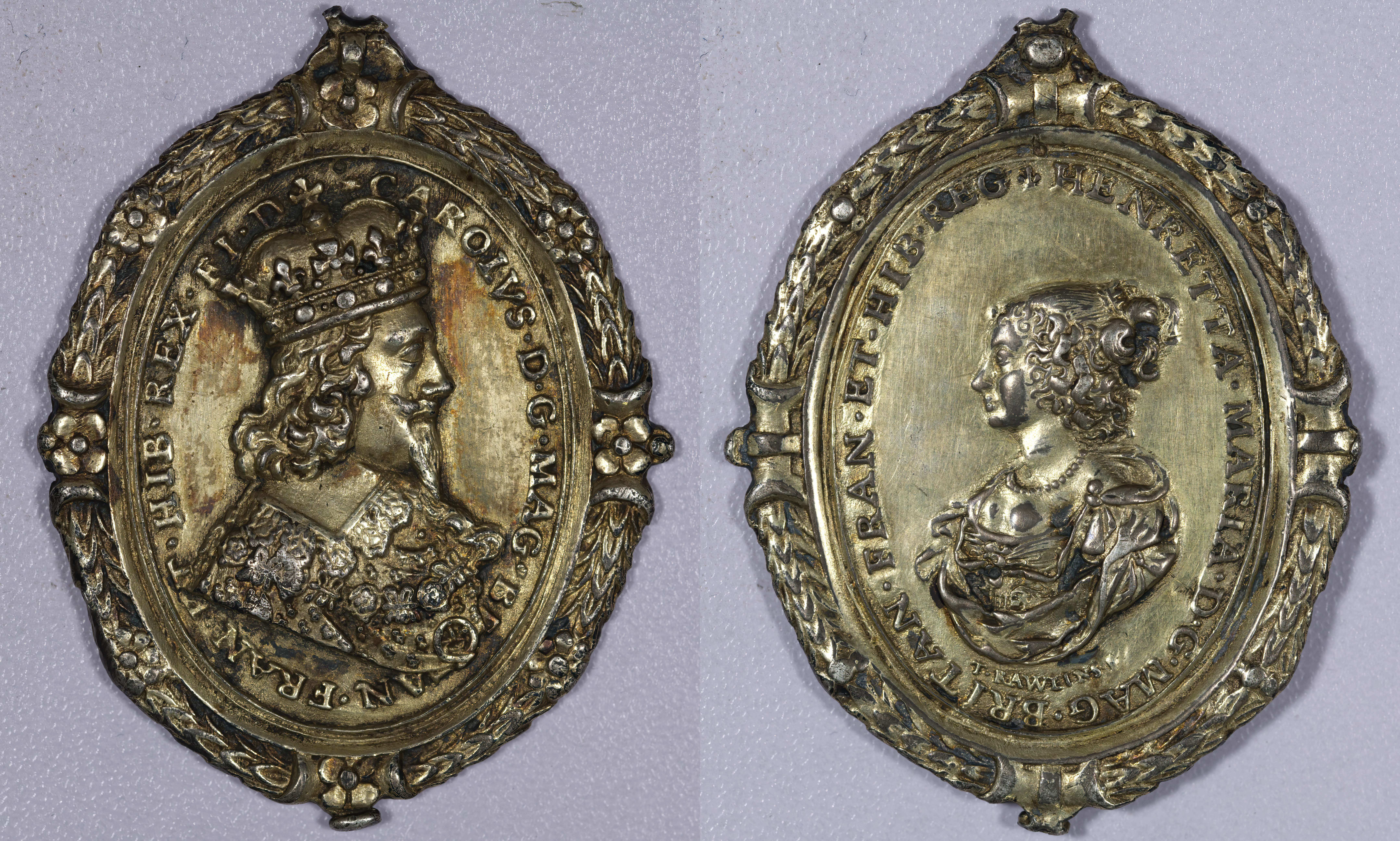 Briot’s horseman, Oxford plume behind, ground line below. Large plume between two Oxford plumes above Declaration, date in script and ox between pellets below. |