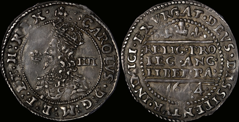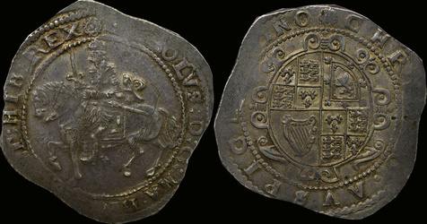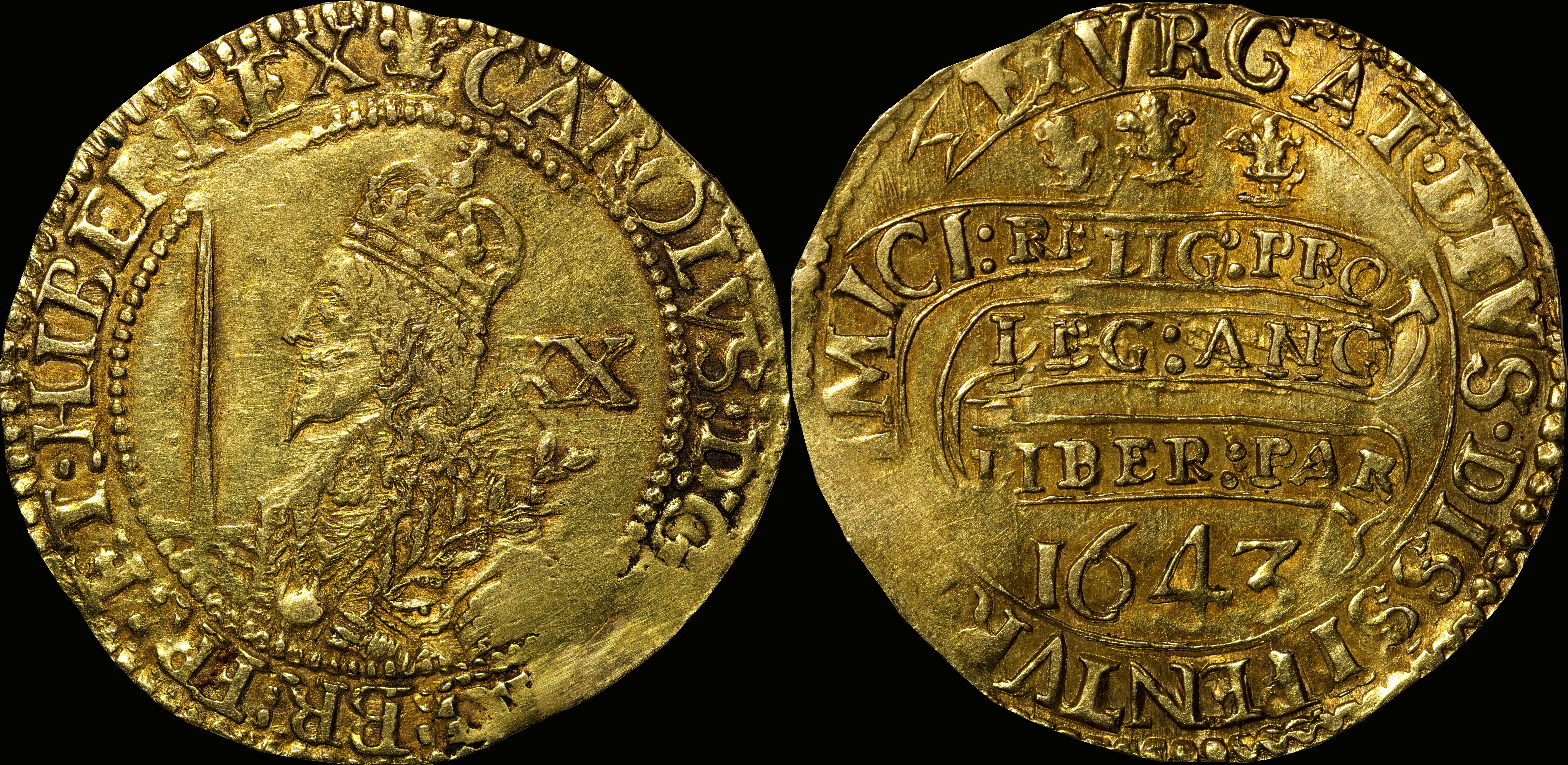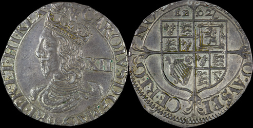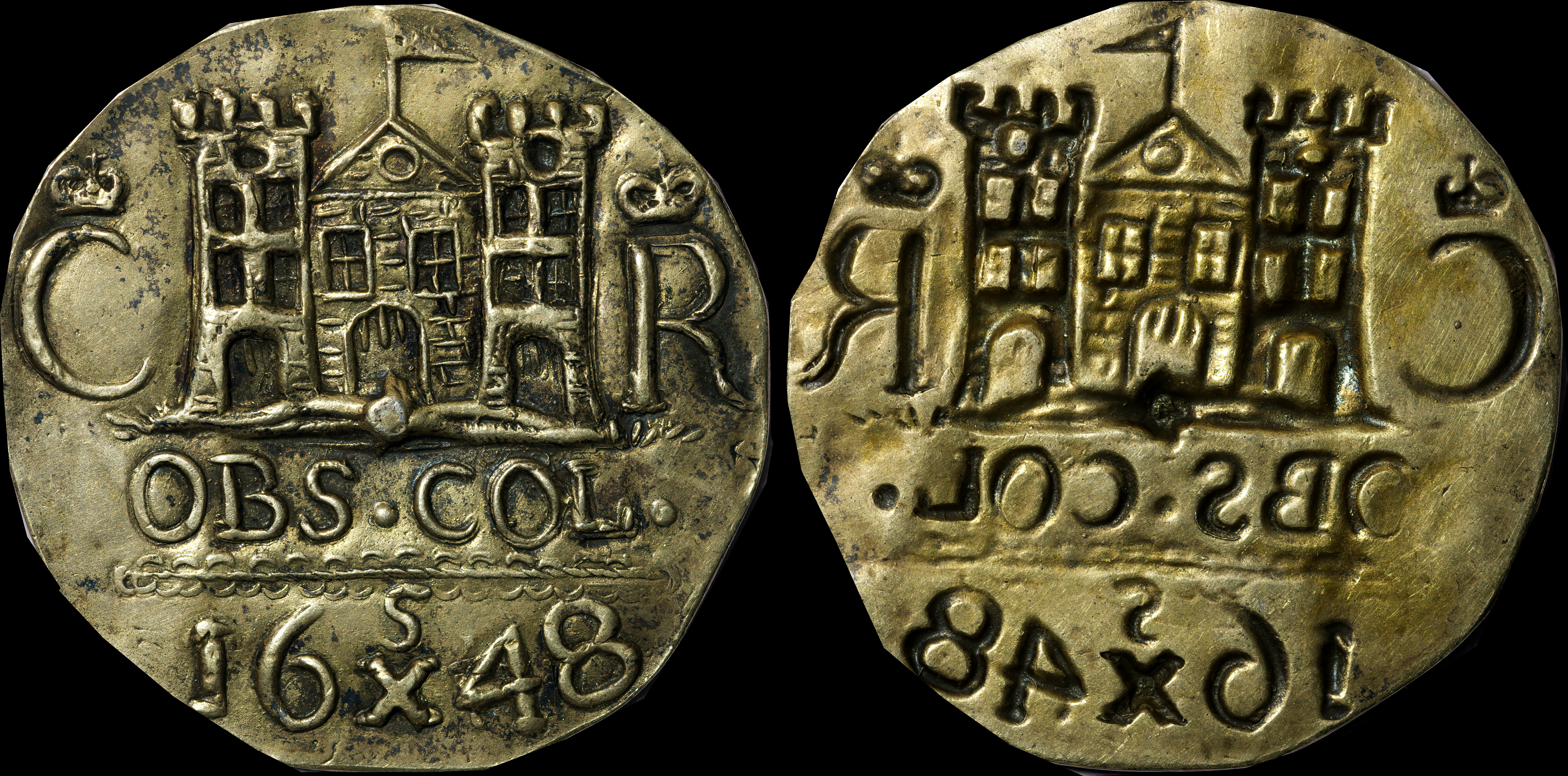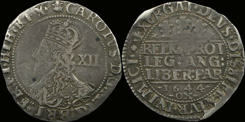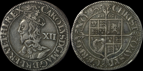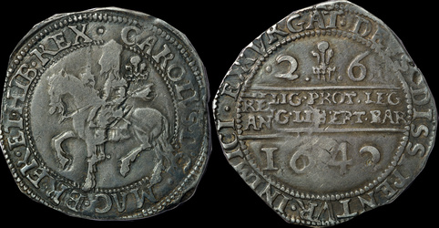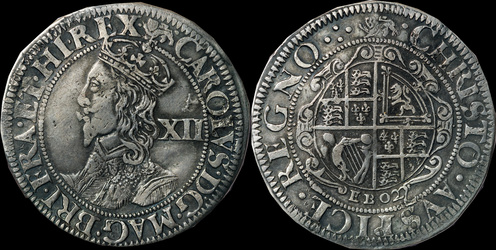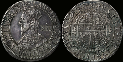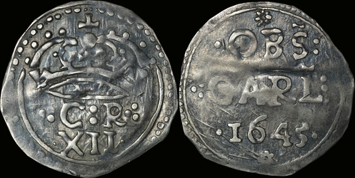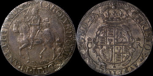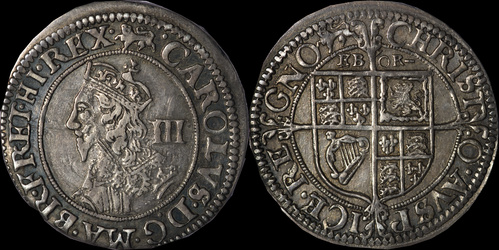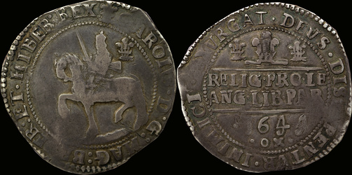 In operation from mid 1644 to June 28, 1645 when the beseiged castle surrendered. Issues can read "OBS CARL" (obsidium → "siege"). Original production is estimated at 2,000-4,000 coins with about 20-30 surviving. Issues include Halfcrowns, Shillings, and Threepences.