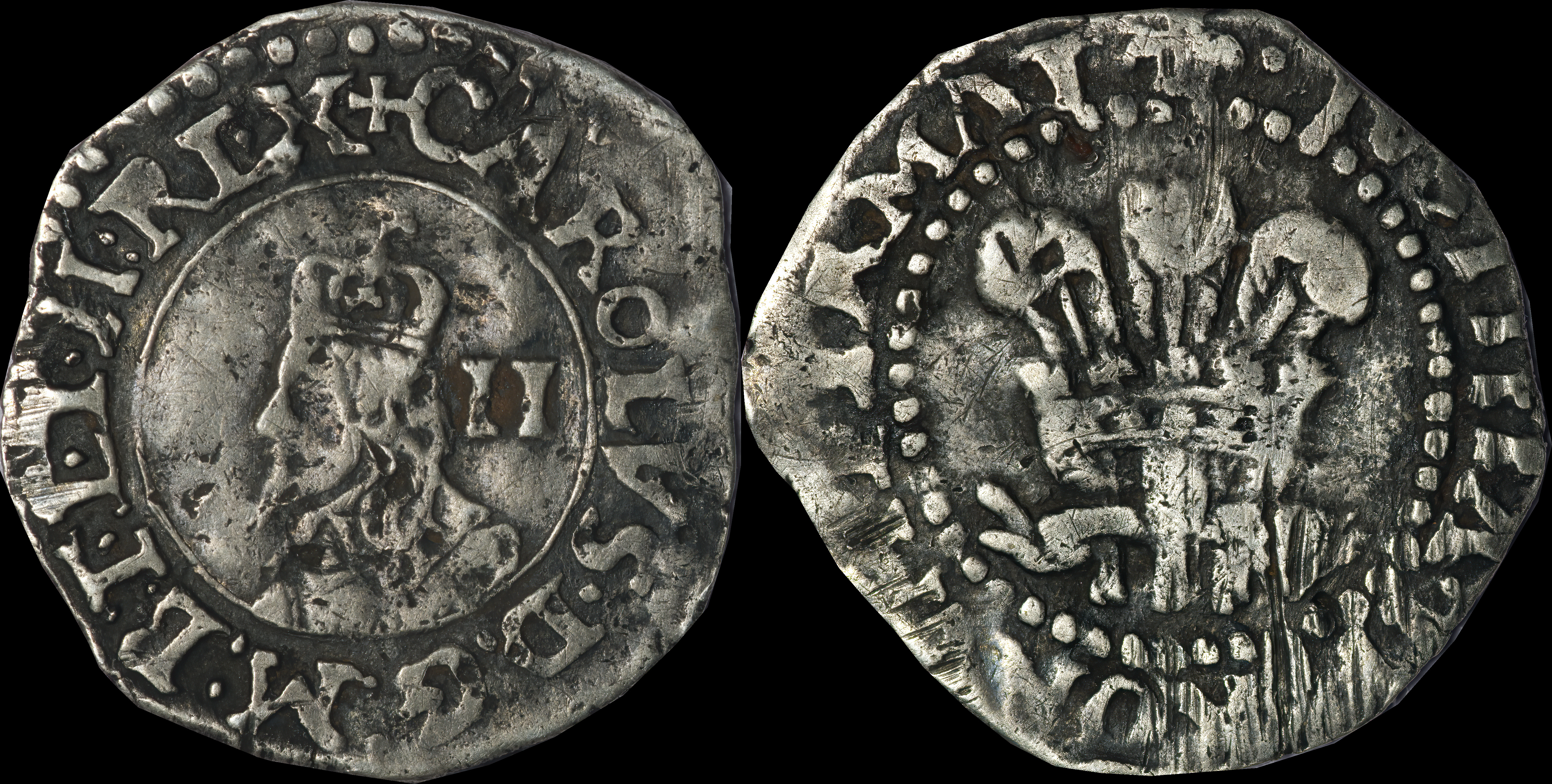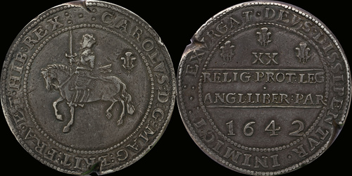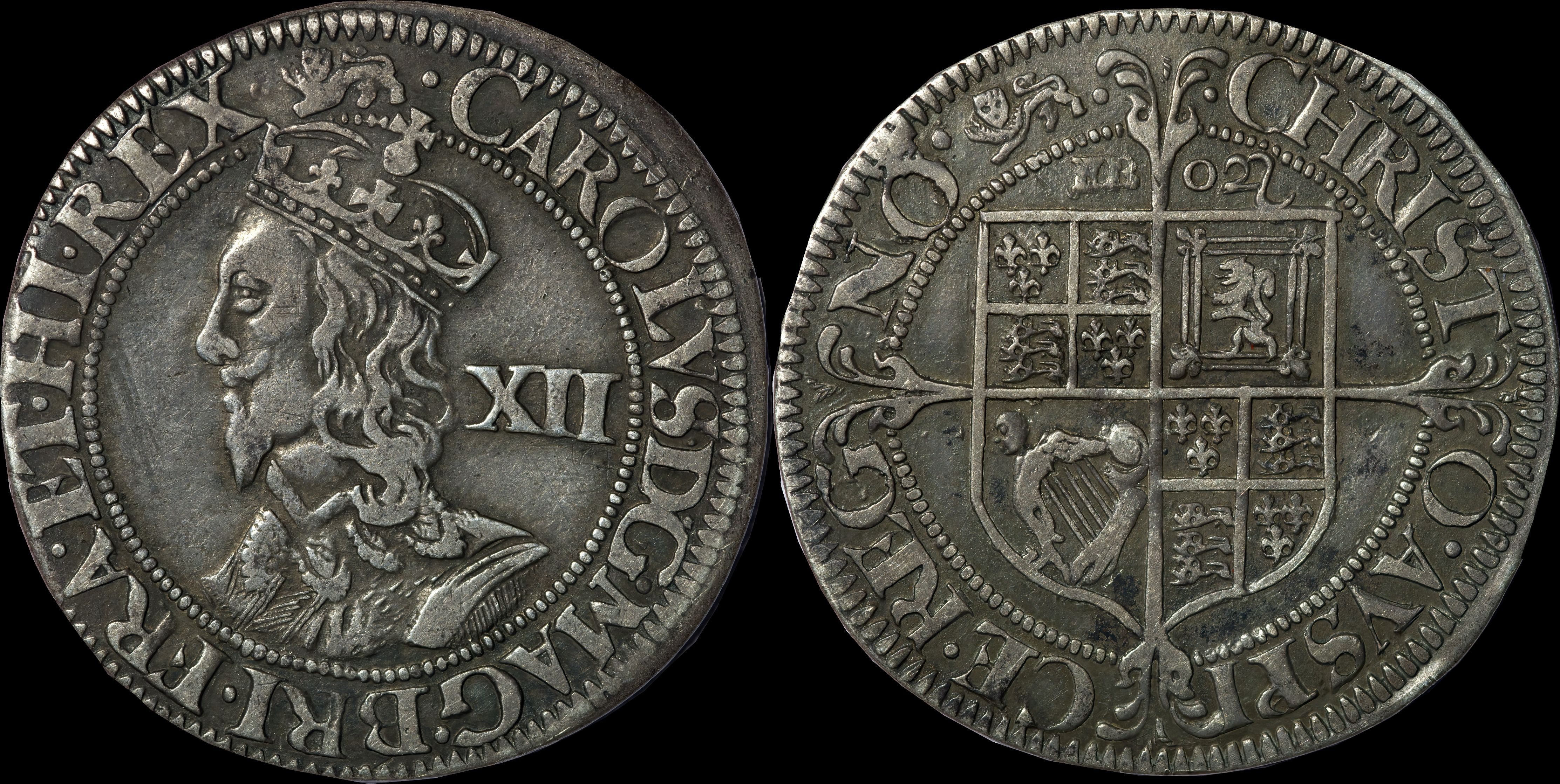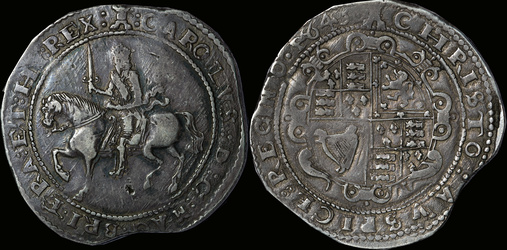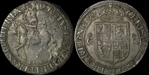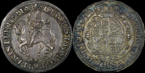 | Bull Oxford 604/D, North 2416, S 2956, PAS: DOR-180F98 = BM 2019 T966/142 this coin. Ansty (Dorset) Civil War Hoard. LL in CAROLLVS, C over G in RELIG. Third discovered of three known (2025). | |
