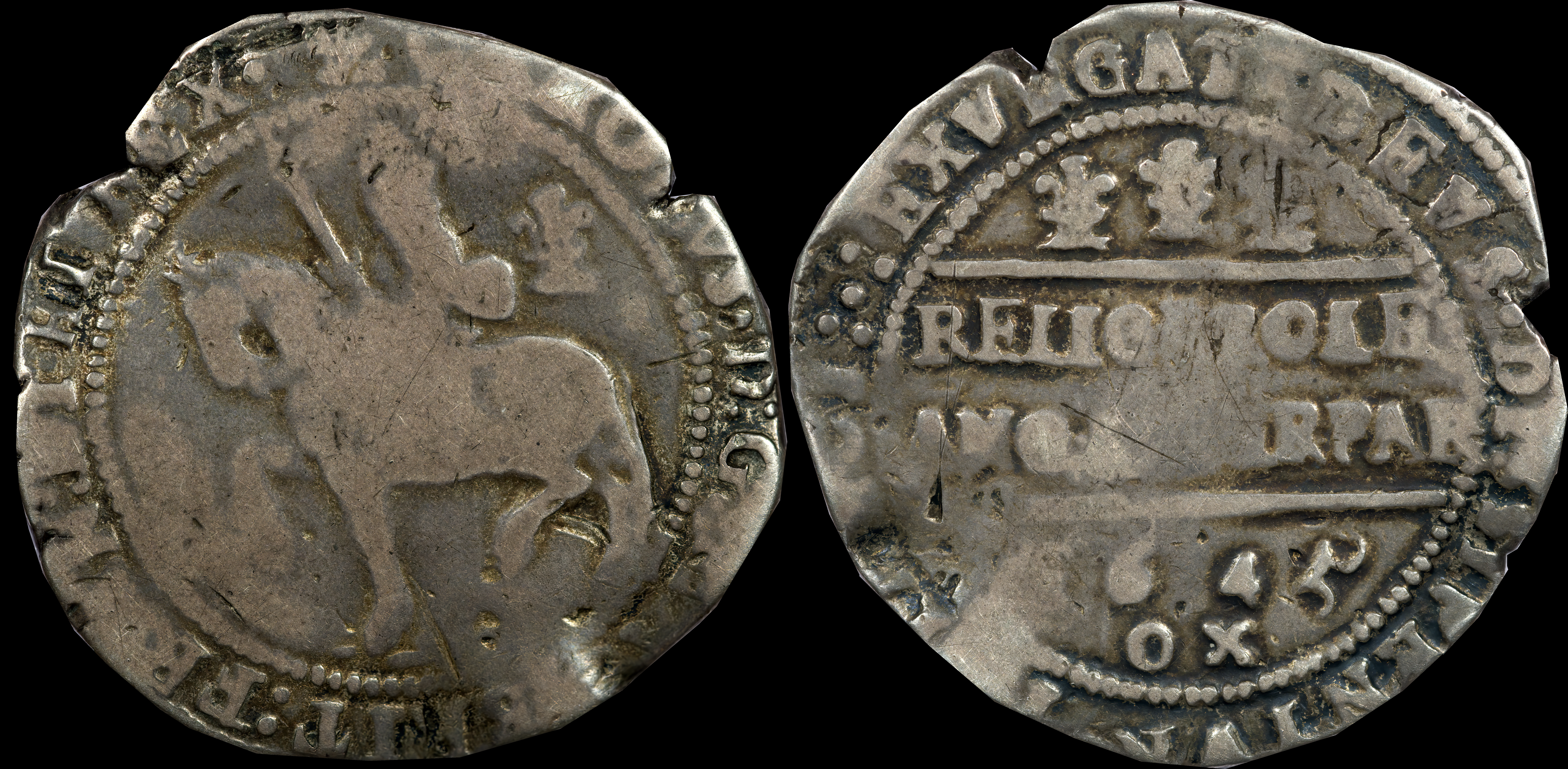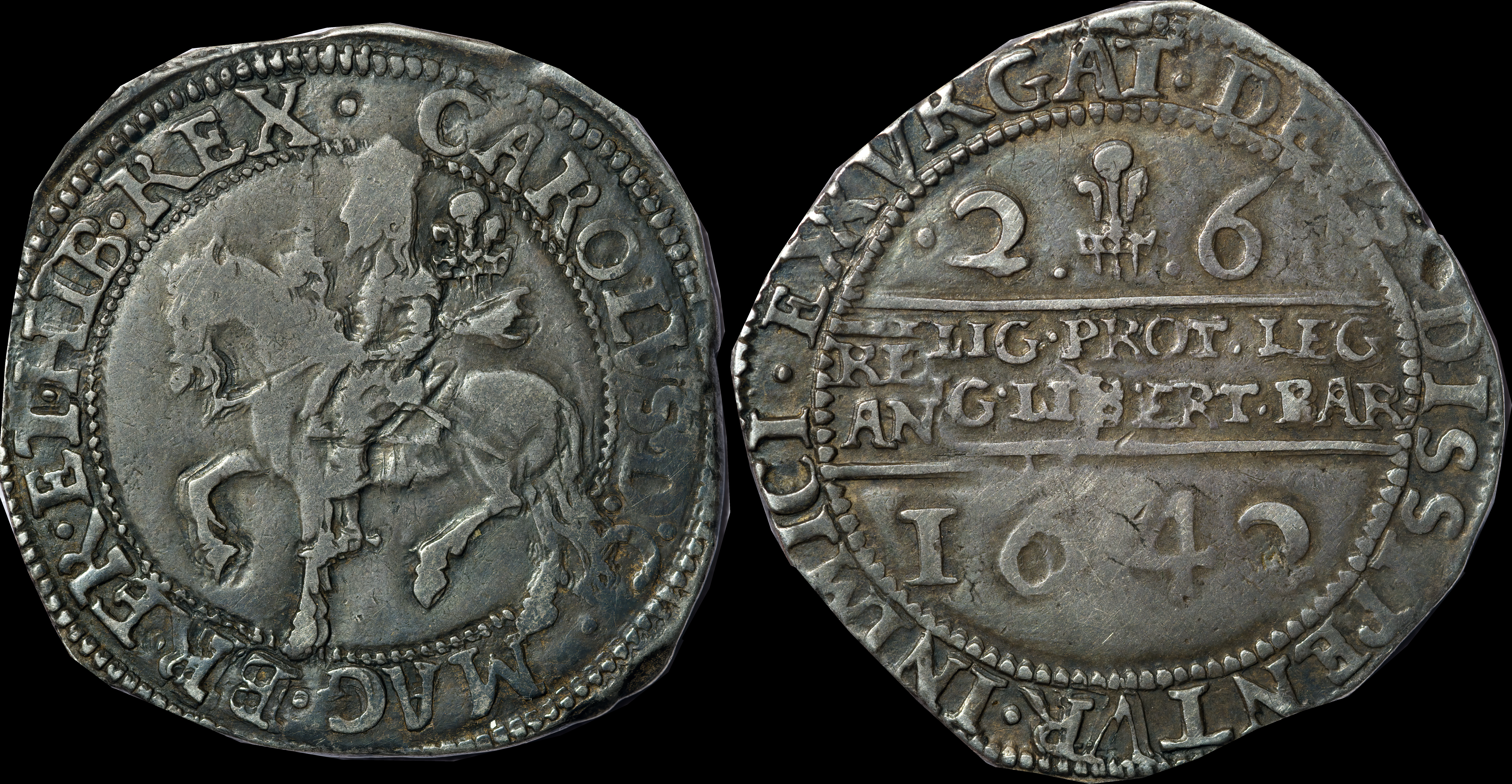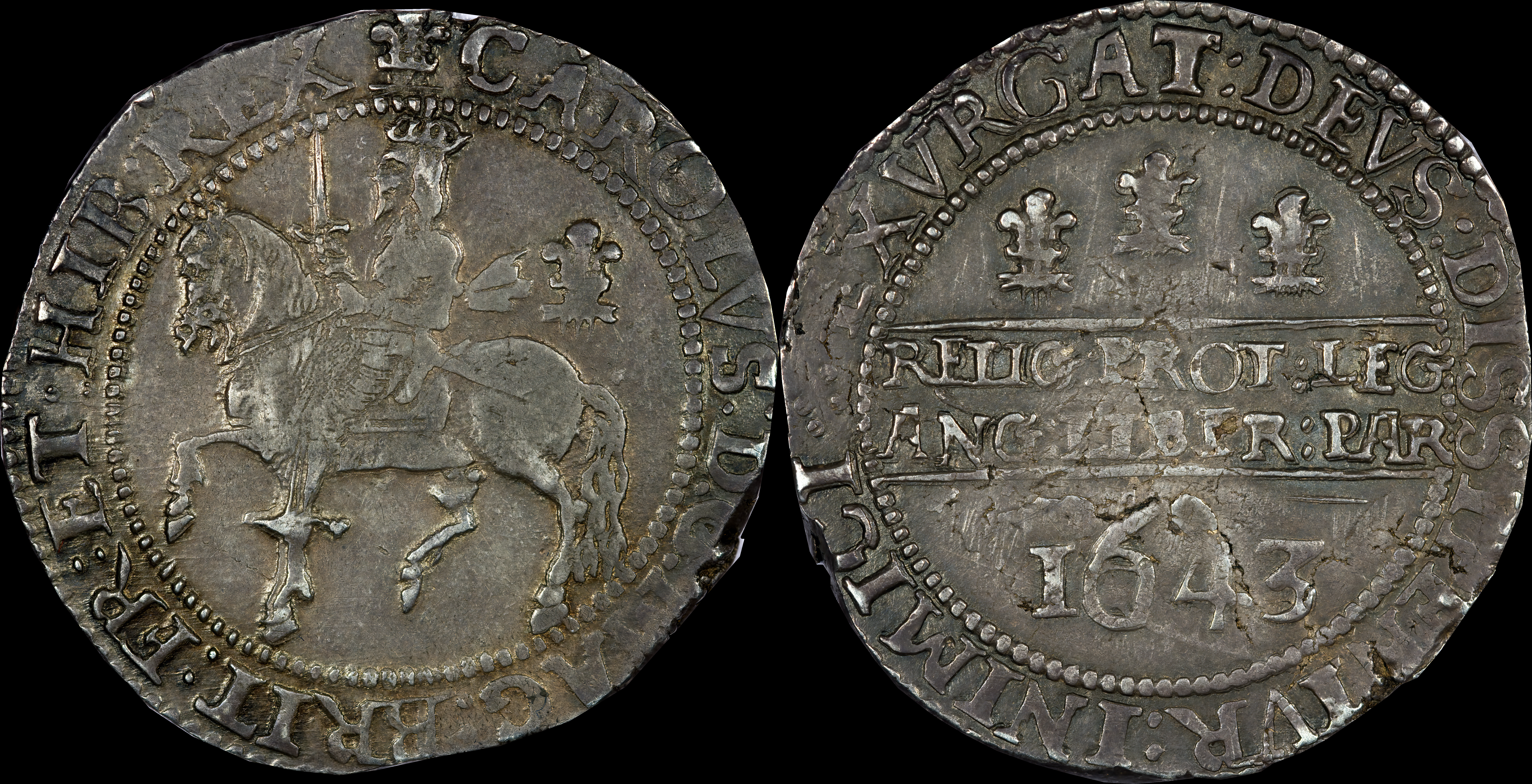 | Bull Oxford 604/D, North 2416, S 2956, PAS: DOR-180F98 = BM 2019 T966/142 this coin. Ansty (Dorset) Civil War Hoard. LL in CAROLLVS, C over G in RELIG. Third discovered of three known (2025). | |