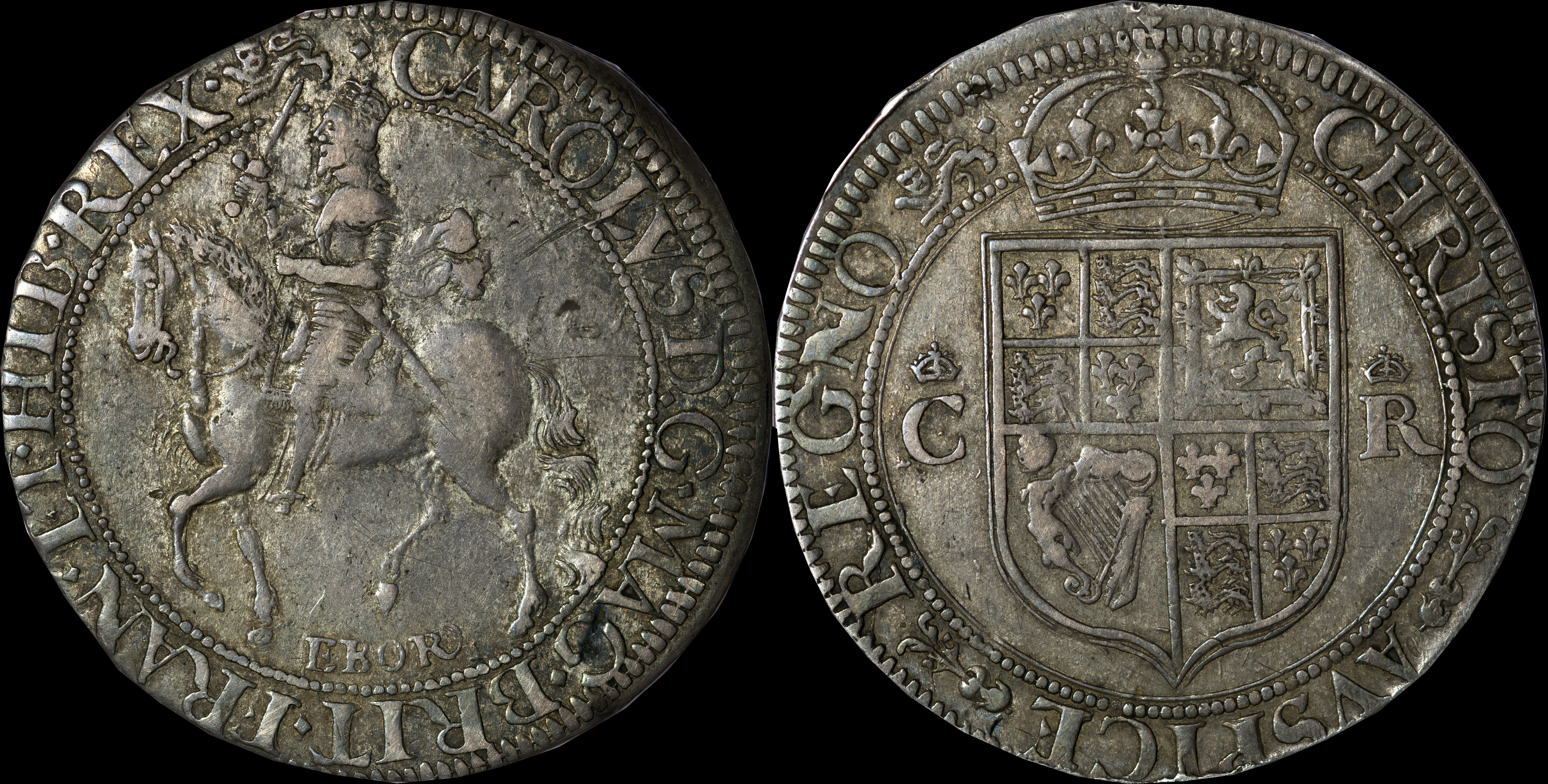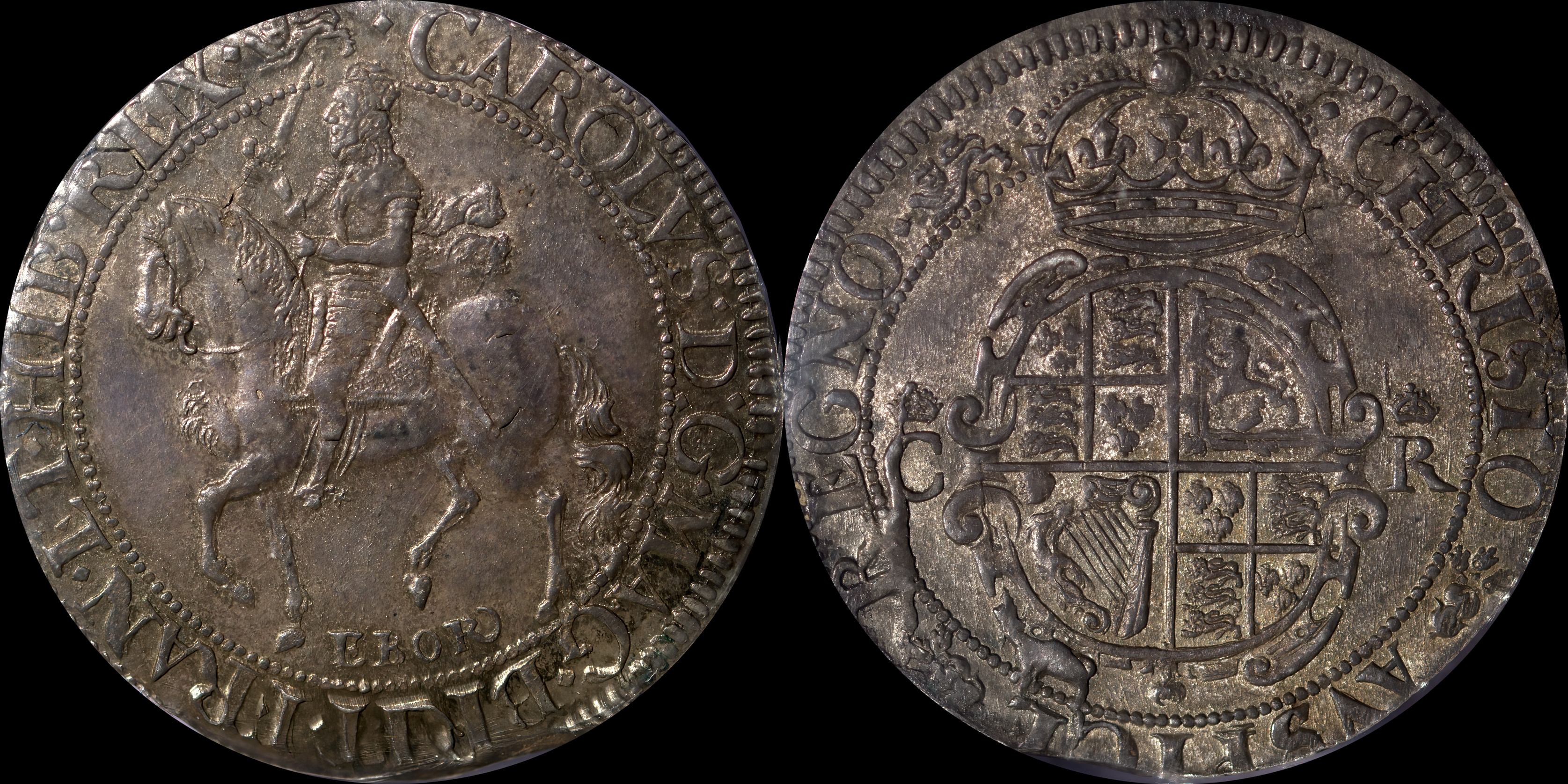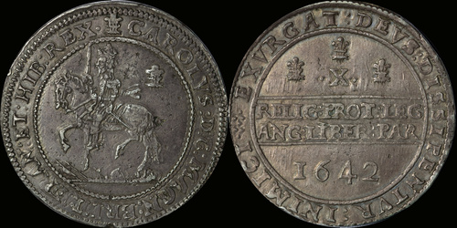 In operation from late 1642 to July 16, 1644 when the town surrendered after a siege. Issues are identified by a lion mintmark or "EBOR" (Eboracum, Latin for York), with dates 1643-44. Original production is estimated at 25,000-50,000 coins with about 600-900 surviving. Issues include Halfpounds, Crowns, Halfcrowns, Shillings, Sixpences, Groats and Threepences.