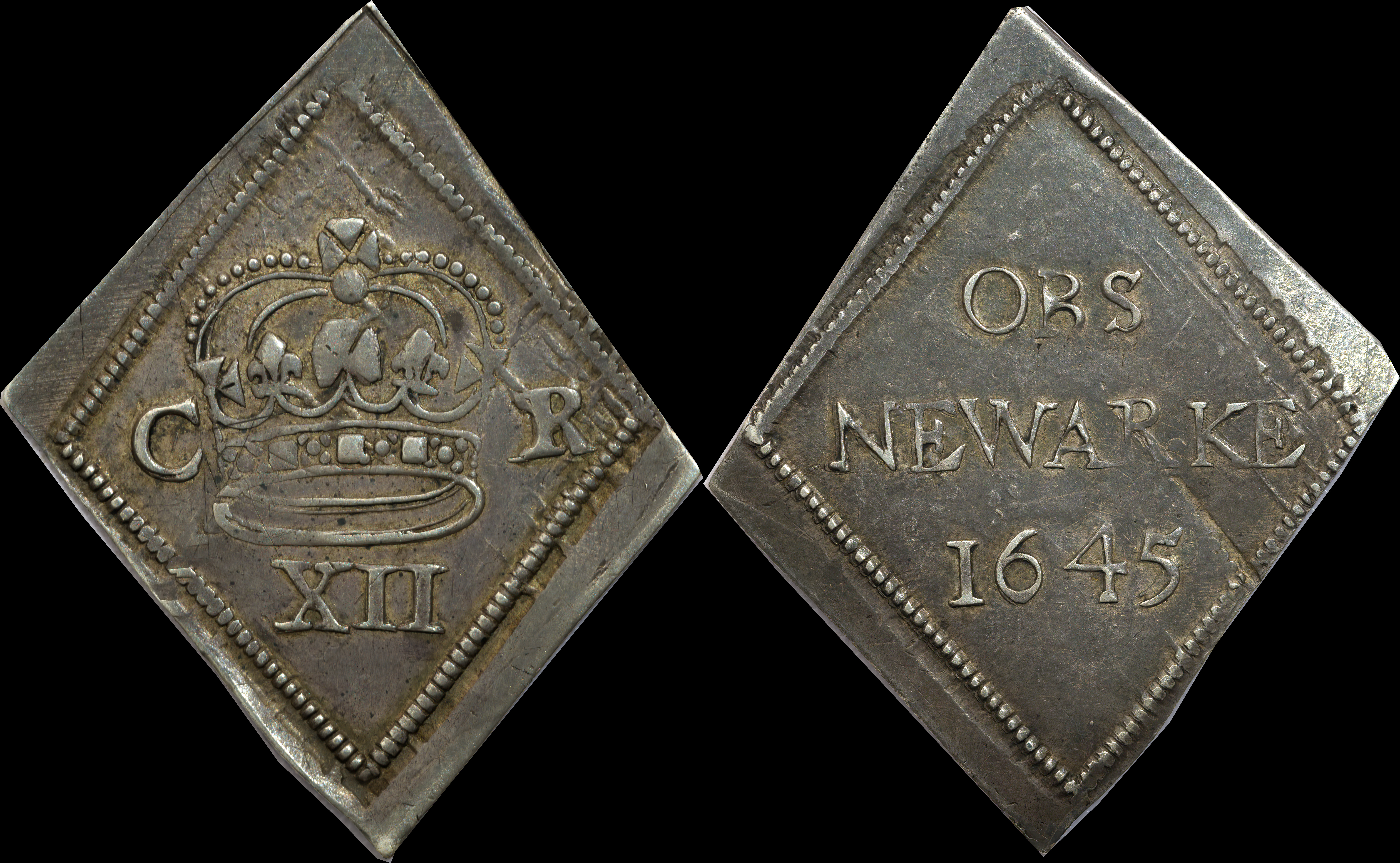 In operation from late 1645 to May 6, 1646 when the town surrendered. Issues can read "OBS NEWARK(E)" (obsidium → "siege"). Original production is estimated at 5,000-10,000 coins with about 100-200 surviving. Issues include Halfcrowns, Shillings, Ninepences, and Sixpences.
