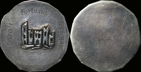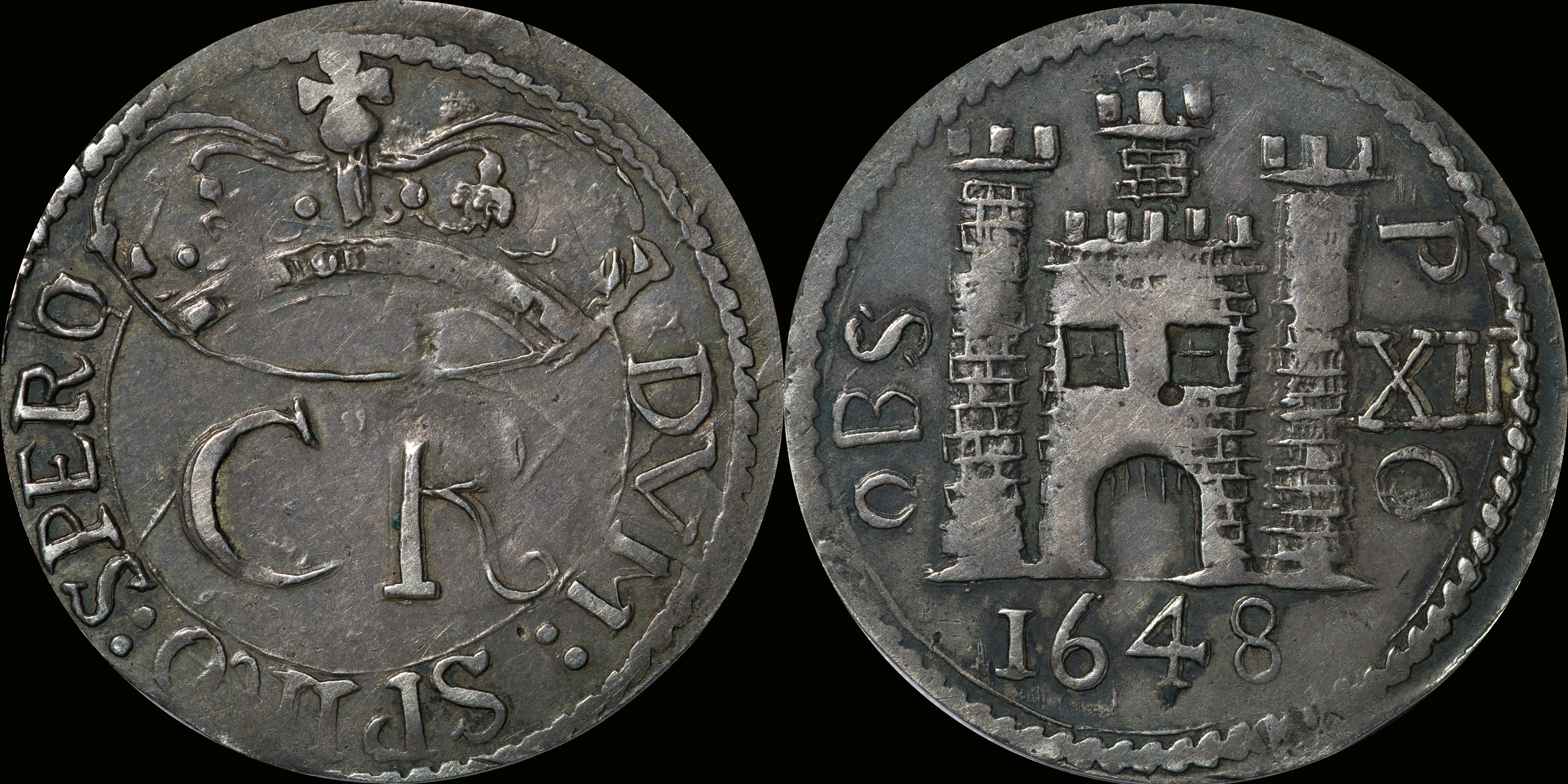 In operation from early 1648 to early 1649 during an 11 month siege, surrendering December 22, 1648. Issues are generally lozenge or octagonal pieces with a crude representation of the castle and a denomination, but appear to also have struck the Fortuna issues without a denomination. Original production is estimated at 250-500 pieces with a denomination, with about 15-22 surviving. Issues include Halfcrowns, Shillings, and a very low number of gold pieces.