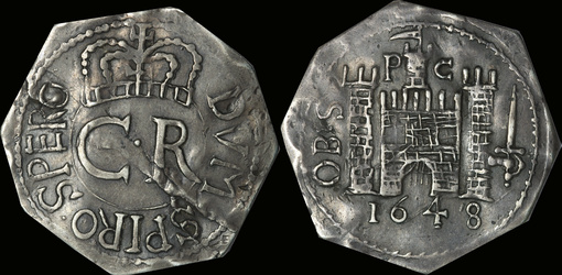 In operation from June 1648 to March 25, 1649, past the execution of Charles I in support of Charles II. Issues can read "OBS PC" (obsidium → "siege"). Original production is estimated at 300-600 coins with about 8-12 surviving. Issues include Halfcrowns and Shillings.