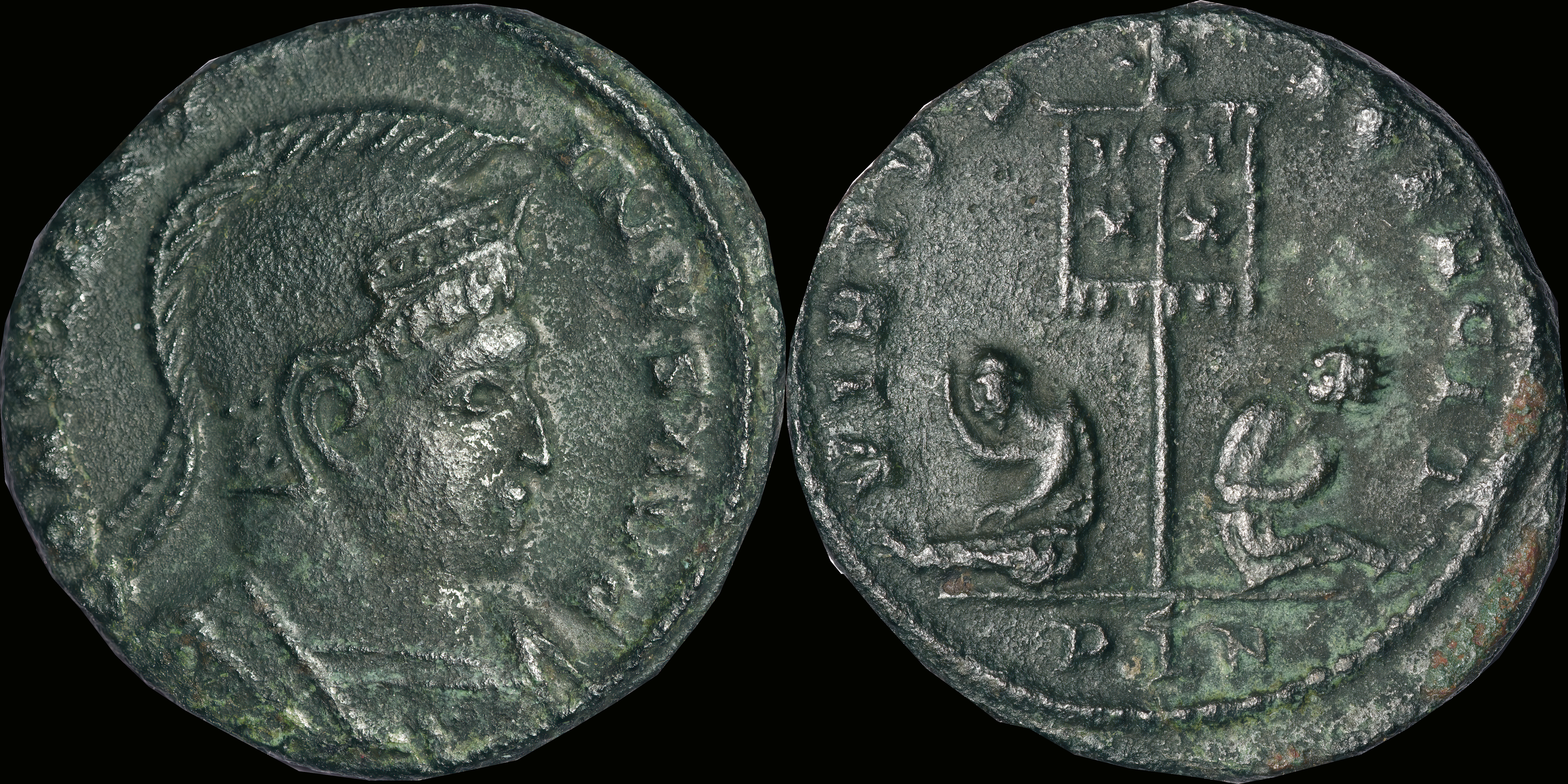 CONSTANTINVS IVN NOB C CAESARVM NOSTRORVM P LON (crescent) |
