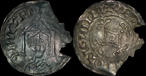 ... ON GIVEIDouble quadrilateral, with incurved sides, annulet at centre and fleur at each limb.