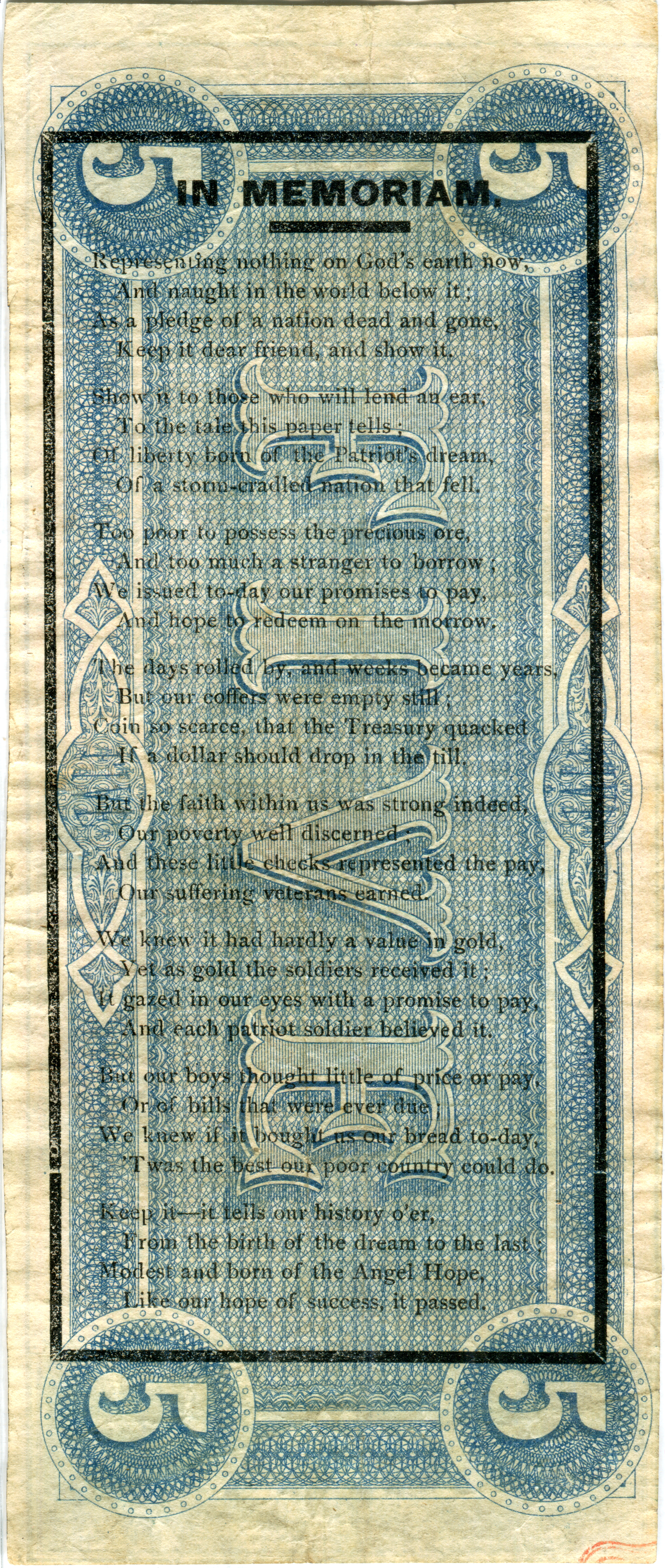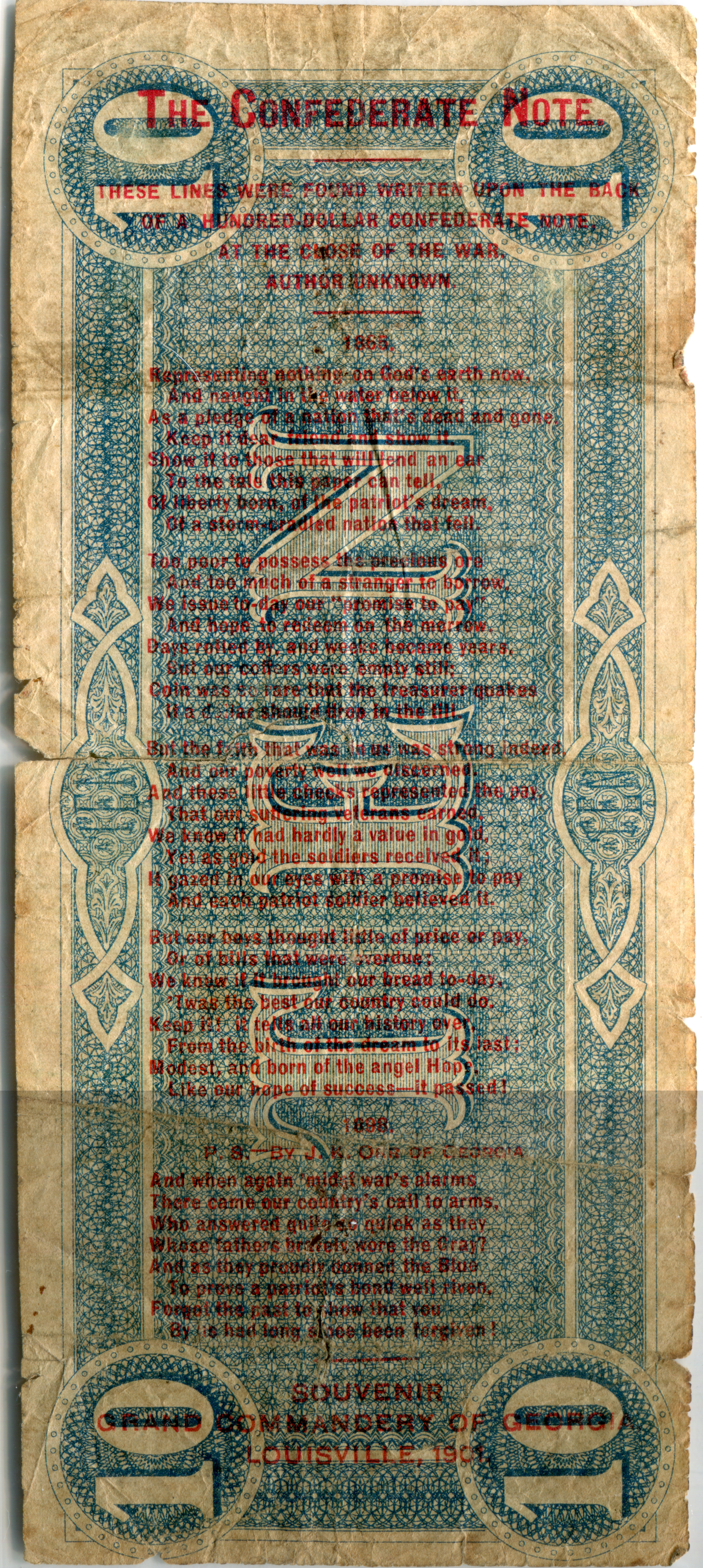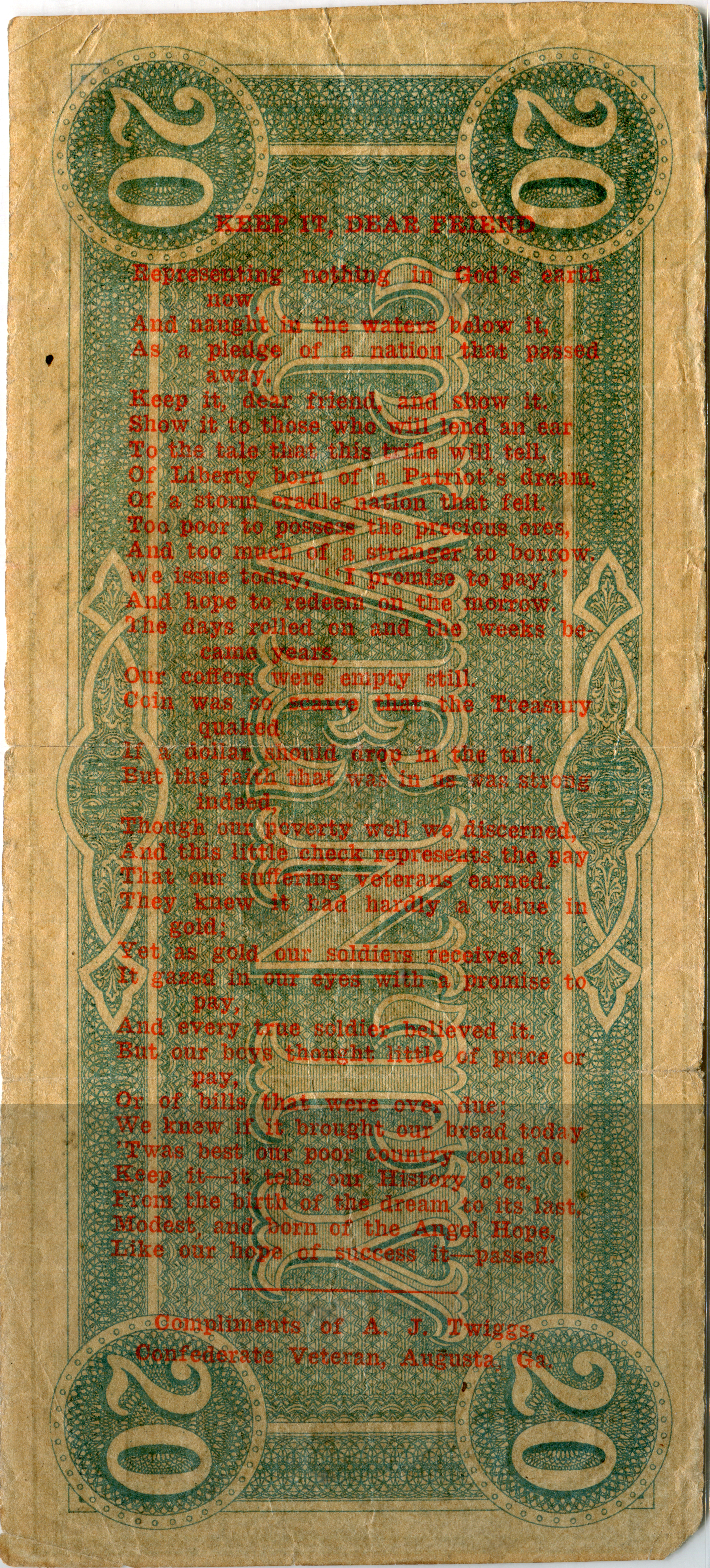 T-67. Poem overprinted on a T-67 note. Compliments of A.J. Twiggs, Confederate Veteran, Augusta, Georgia.