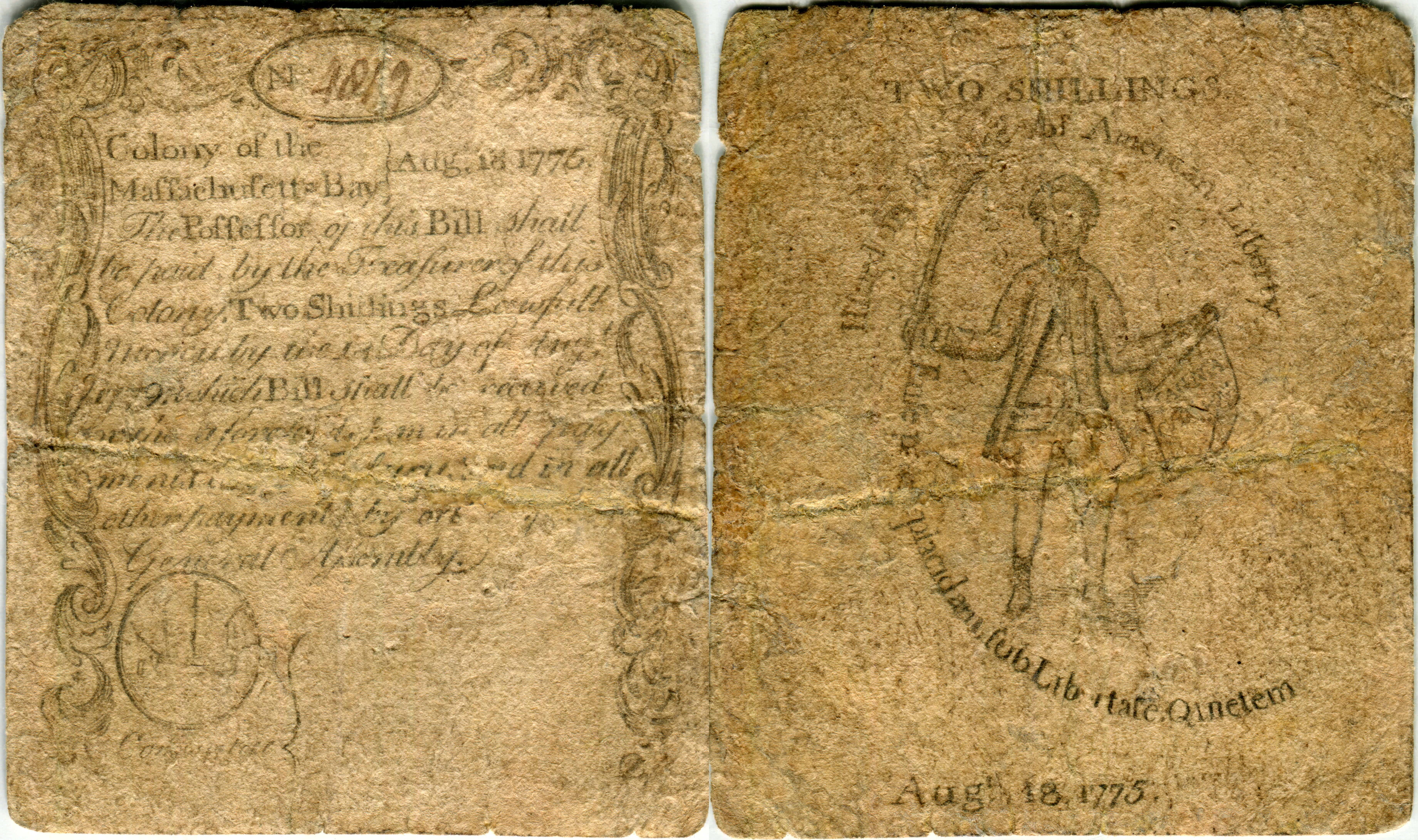 Massachusetts. August 18, 1775. 10,000 printed. Contemporary sewn repair. Engraved and printed by Paul Revere.