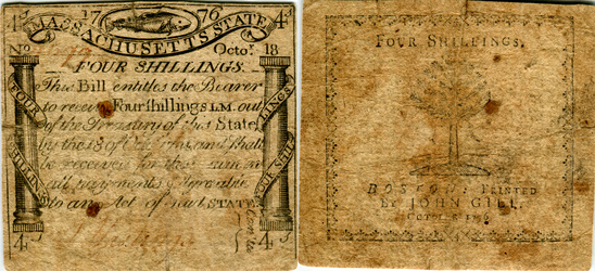 Massachusetts. October 18, 1776. 5,143 printed. Front engraved and printed by Paul Revere ("codfish" note).