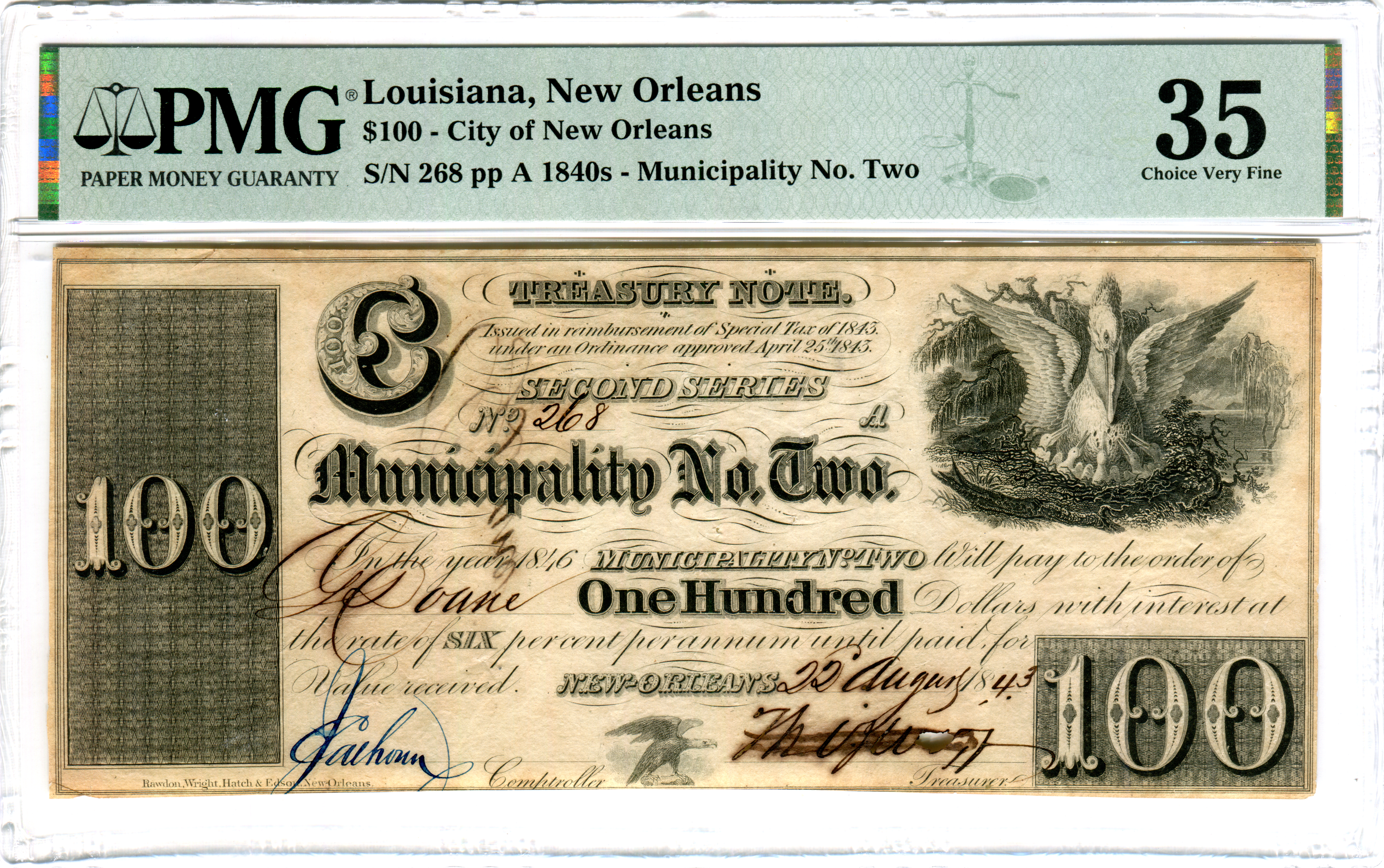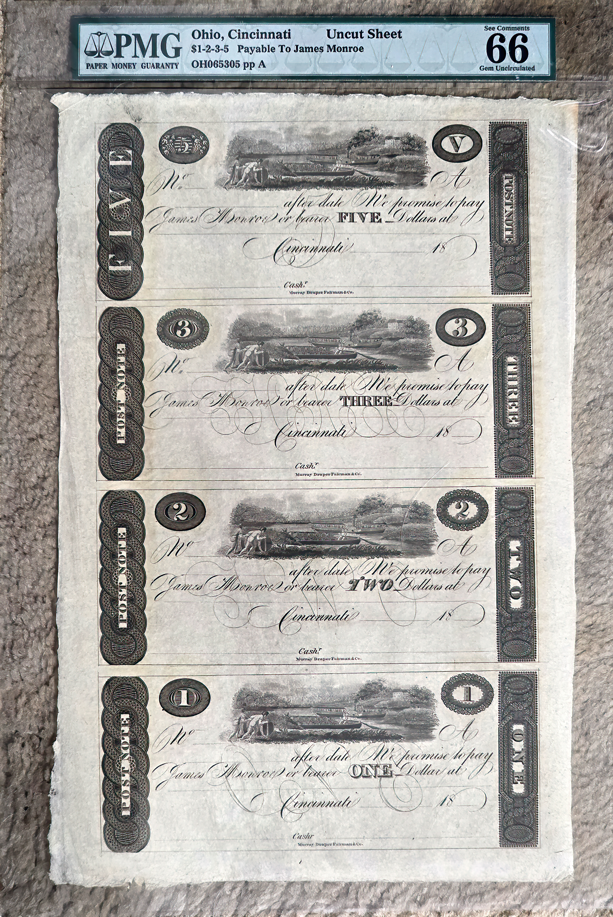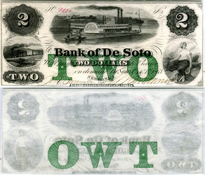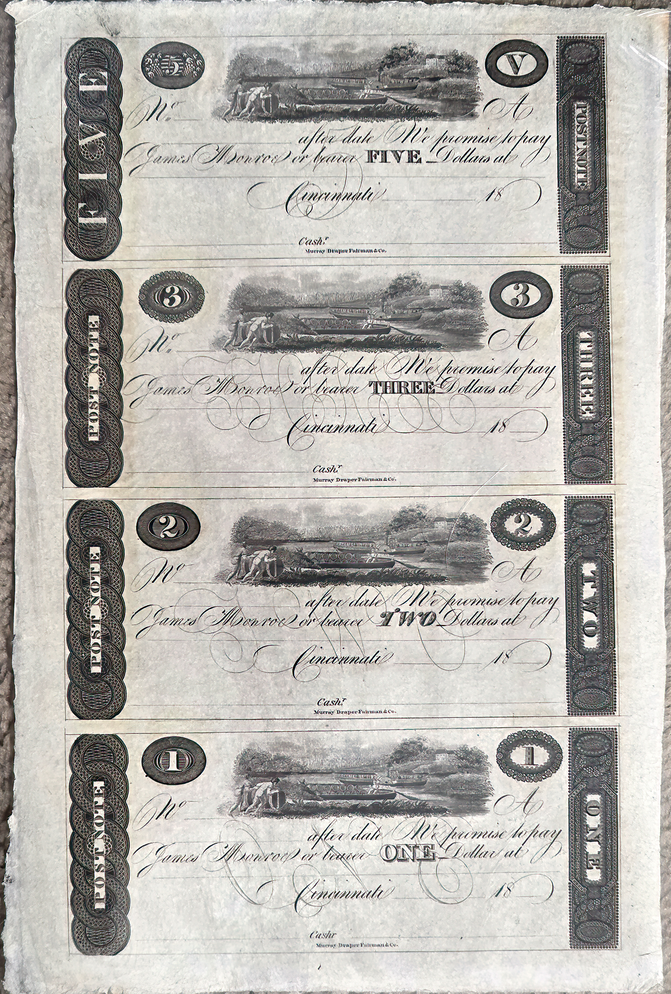 Natchez, Mississippi. Printed on a sheet of unused $2 and $3 notes from Natchez.