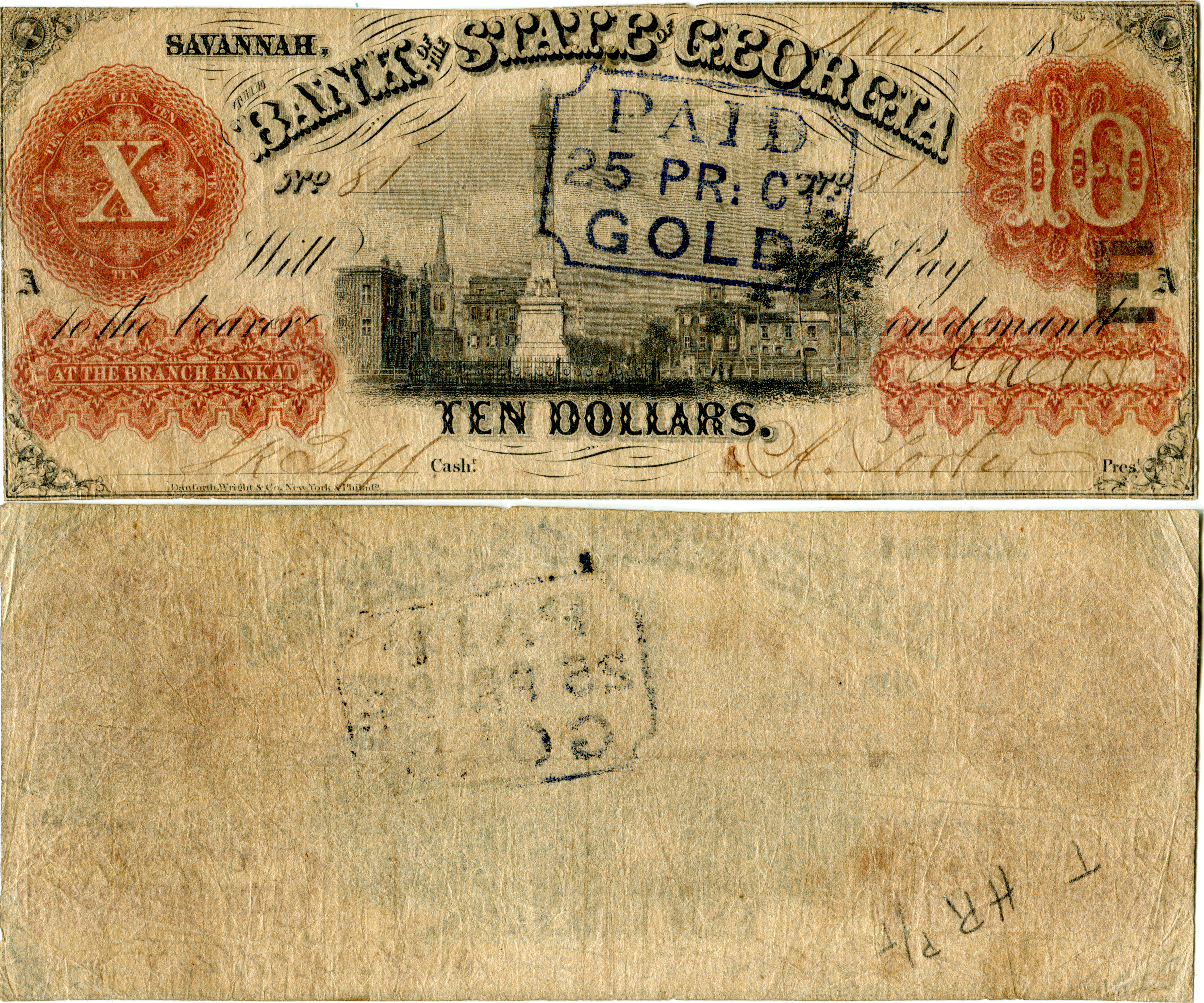 Savannah, Georgia. Bank of the State of Georgia. "PAID 25 PR. CT. GOLD" stamp