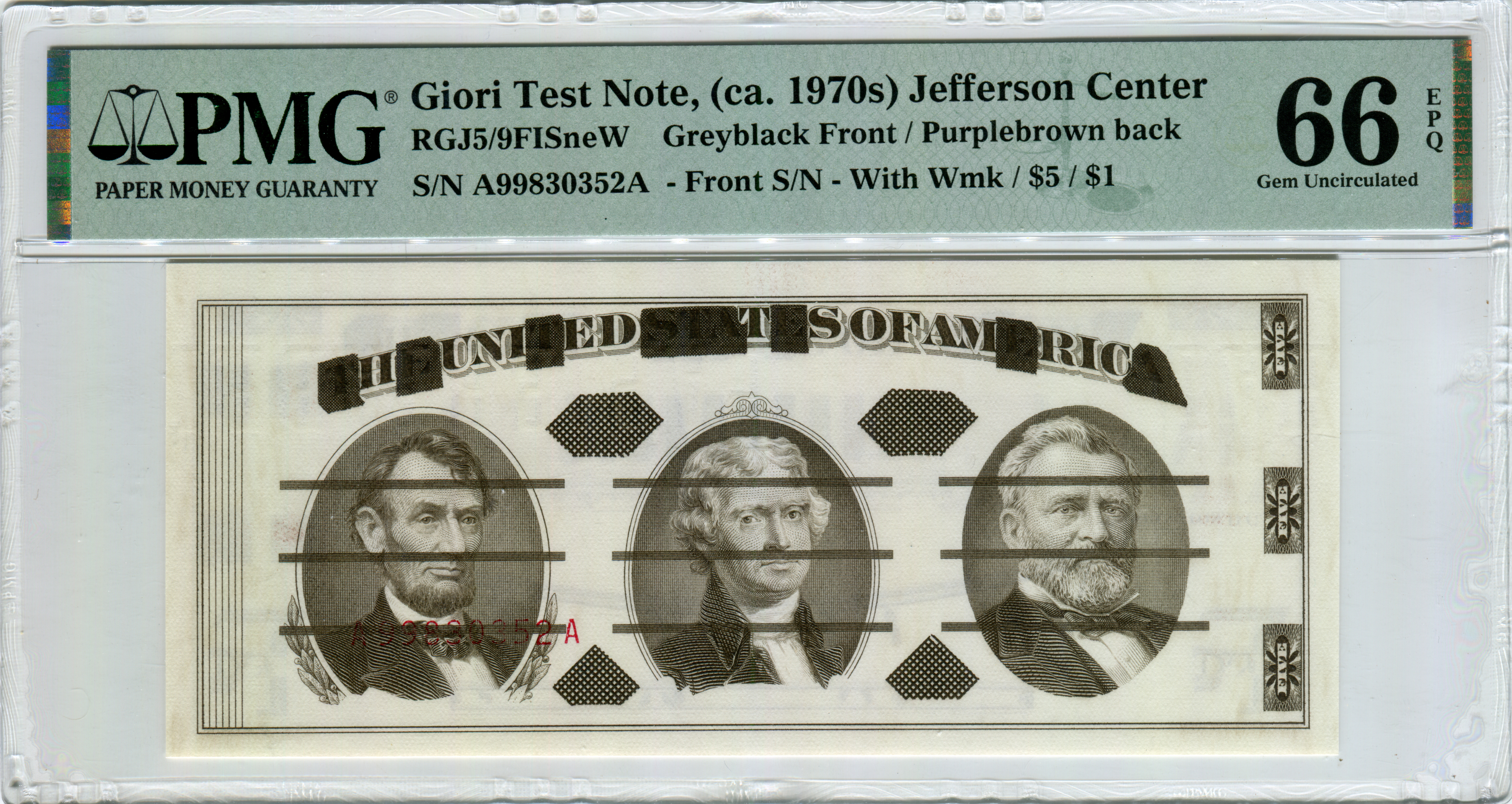 RGJ5/9FISneW. Greyblack / Purplebrown, Jefferson center, serial number, watermark.
