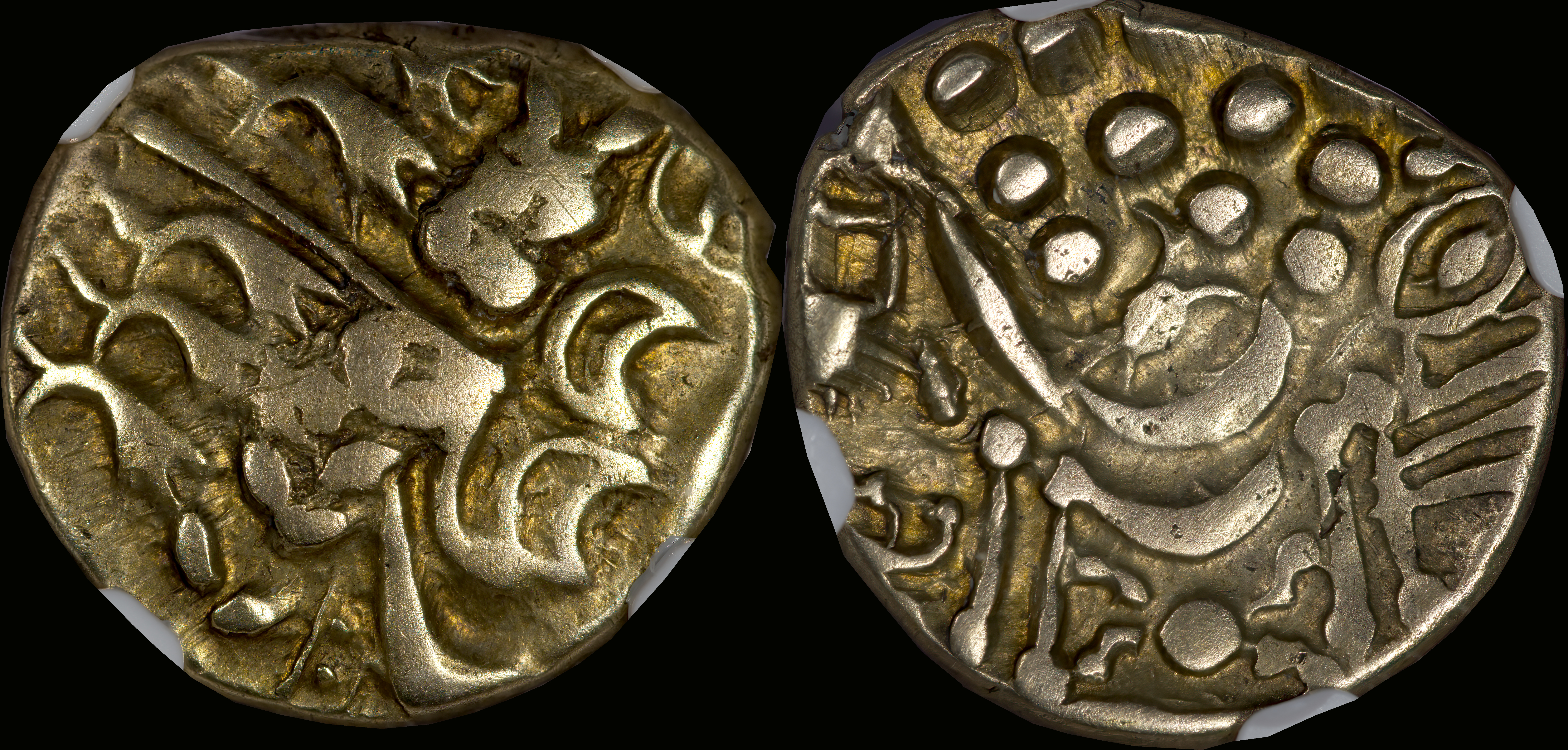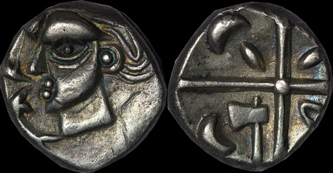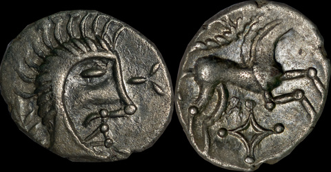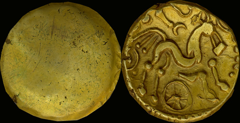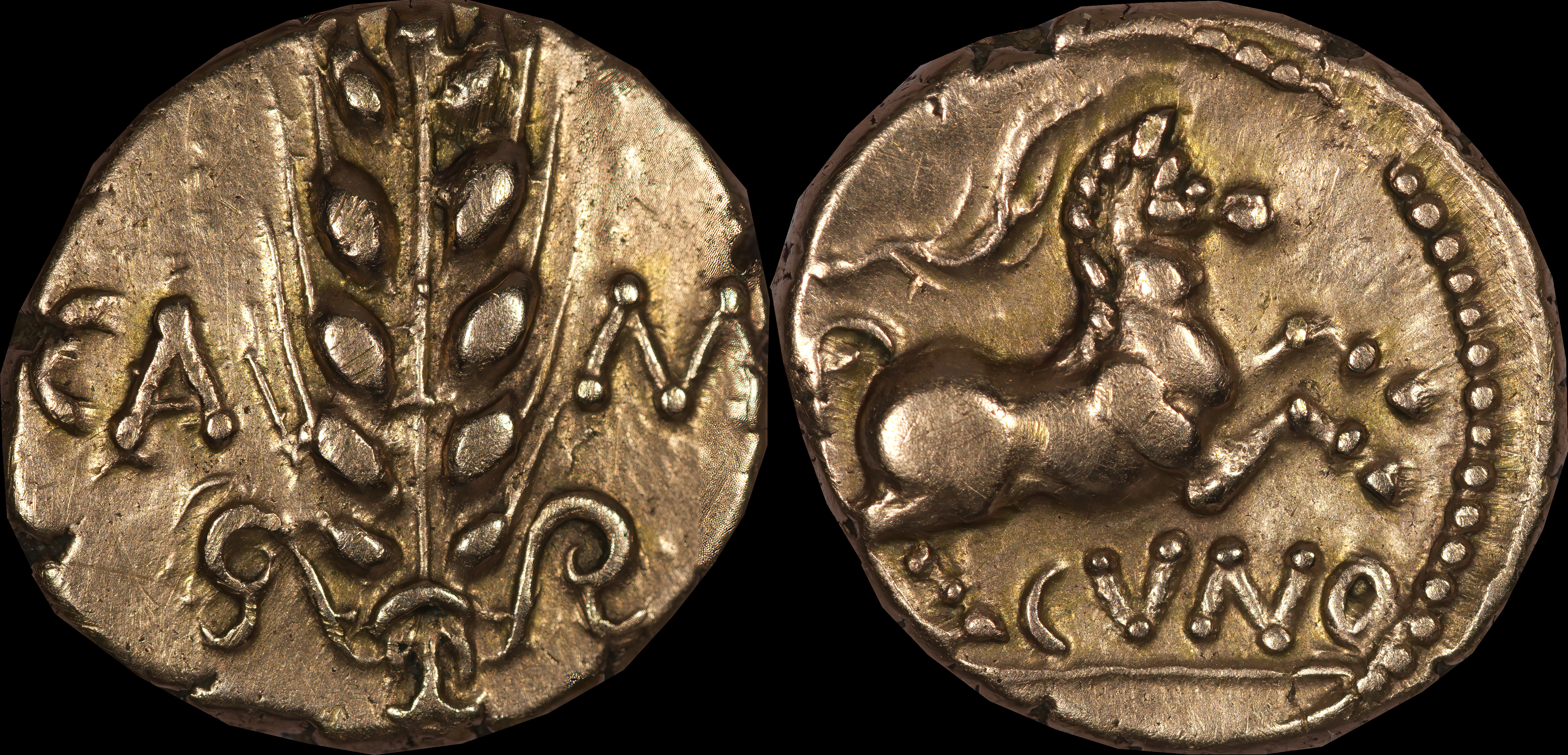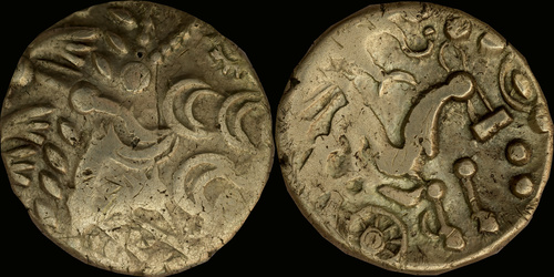 | Allen, Cunobelin โ (dies I/m; unlisted combination), ABC 2798, Van Arsdell 2027-1, Hobbs 1830 (same obv. die in earlier state), S 288. Cunobelin. Cunobelinus Classic, stalk type (Trinovantian X). Unpublished die combination (2025). Ex Trehearne Collection. | |
