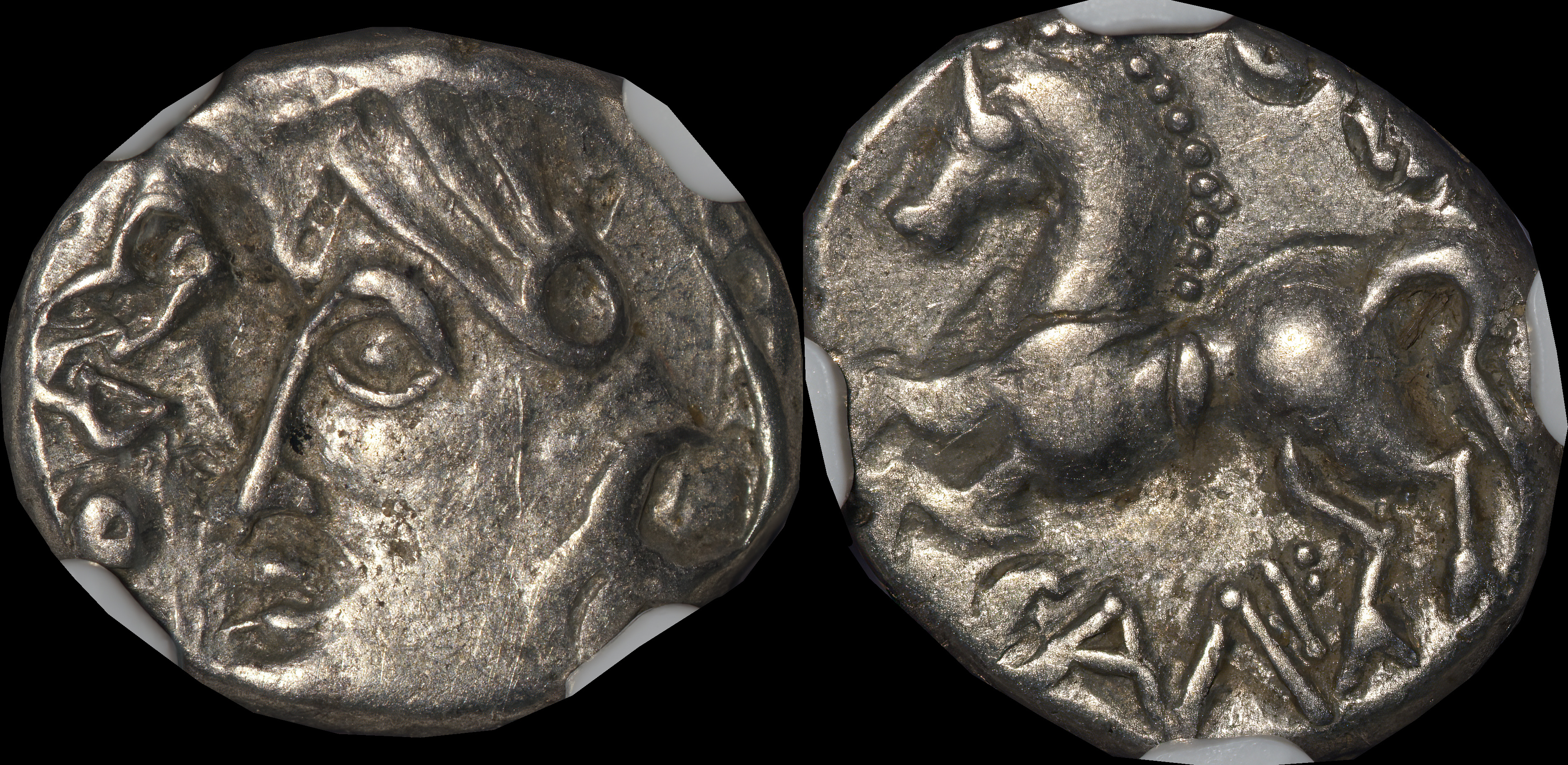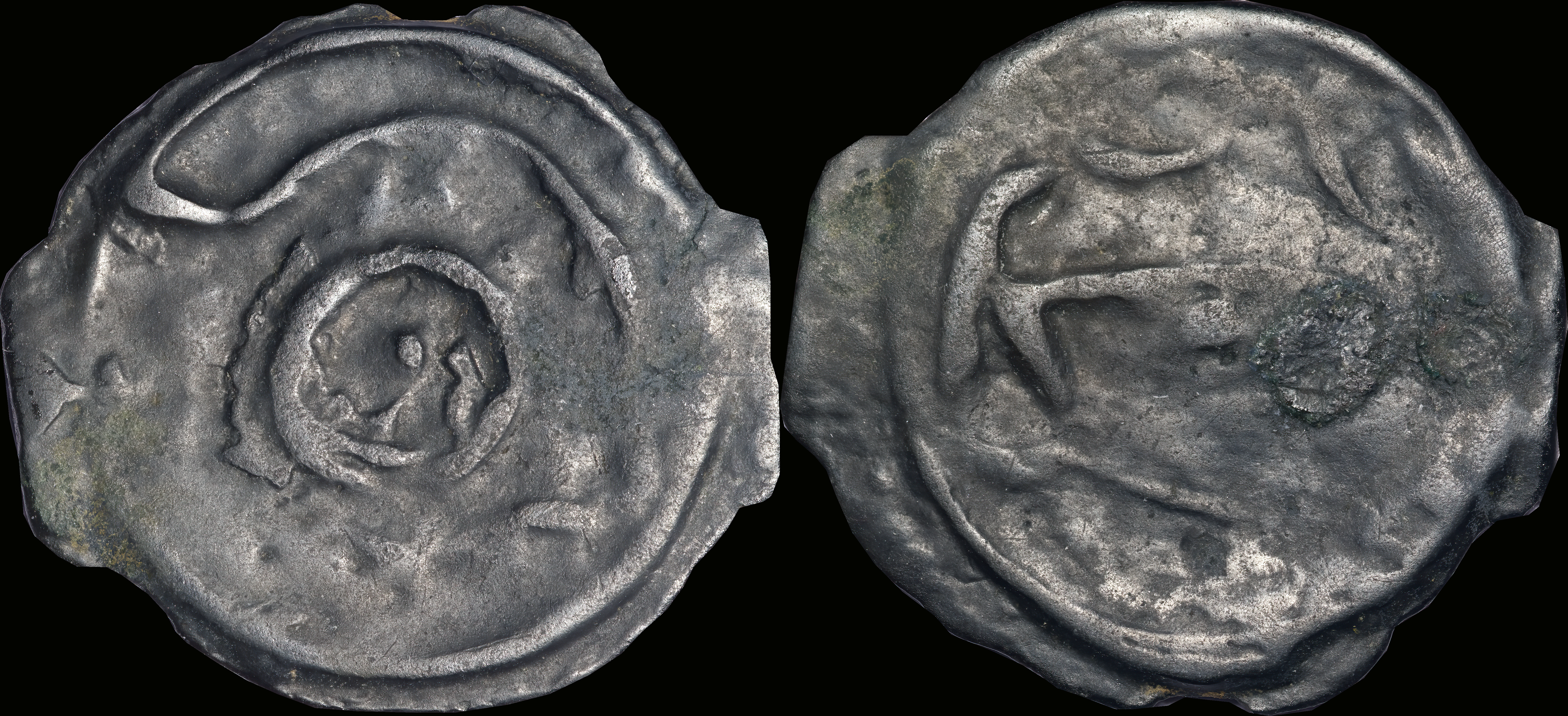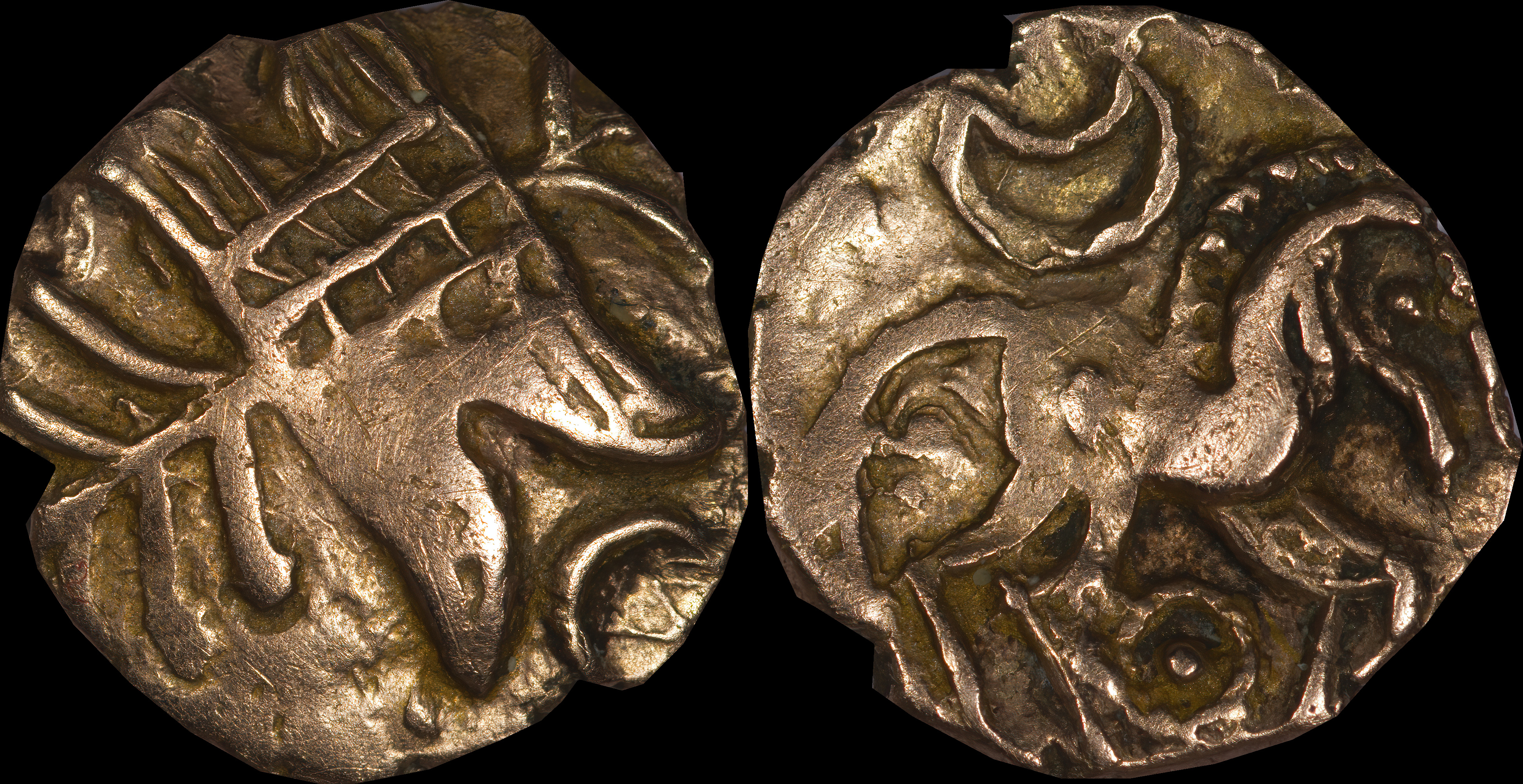| Allen, Cunobelin โ (dies I/m; unlisted combination), ABC 2798, Van Arsdell 2027-1, Hobbs 1830 (same obv. die in earlier state), S 288. Cunobelin. Cunobelinus Classic, stalk type (Trinovantian X). Unpublished die combination (2025). Ex Trehearne Collection. | |