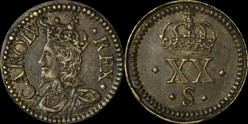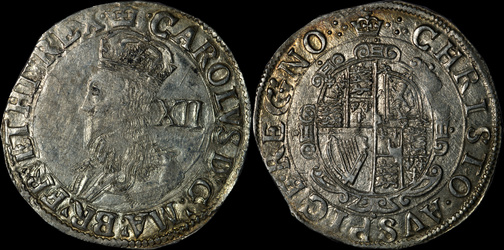 | Triangle mintmark. Ex Messing hoard. A in CAROLVS is missing the crossbar. | |