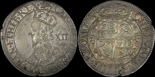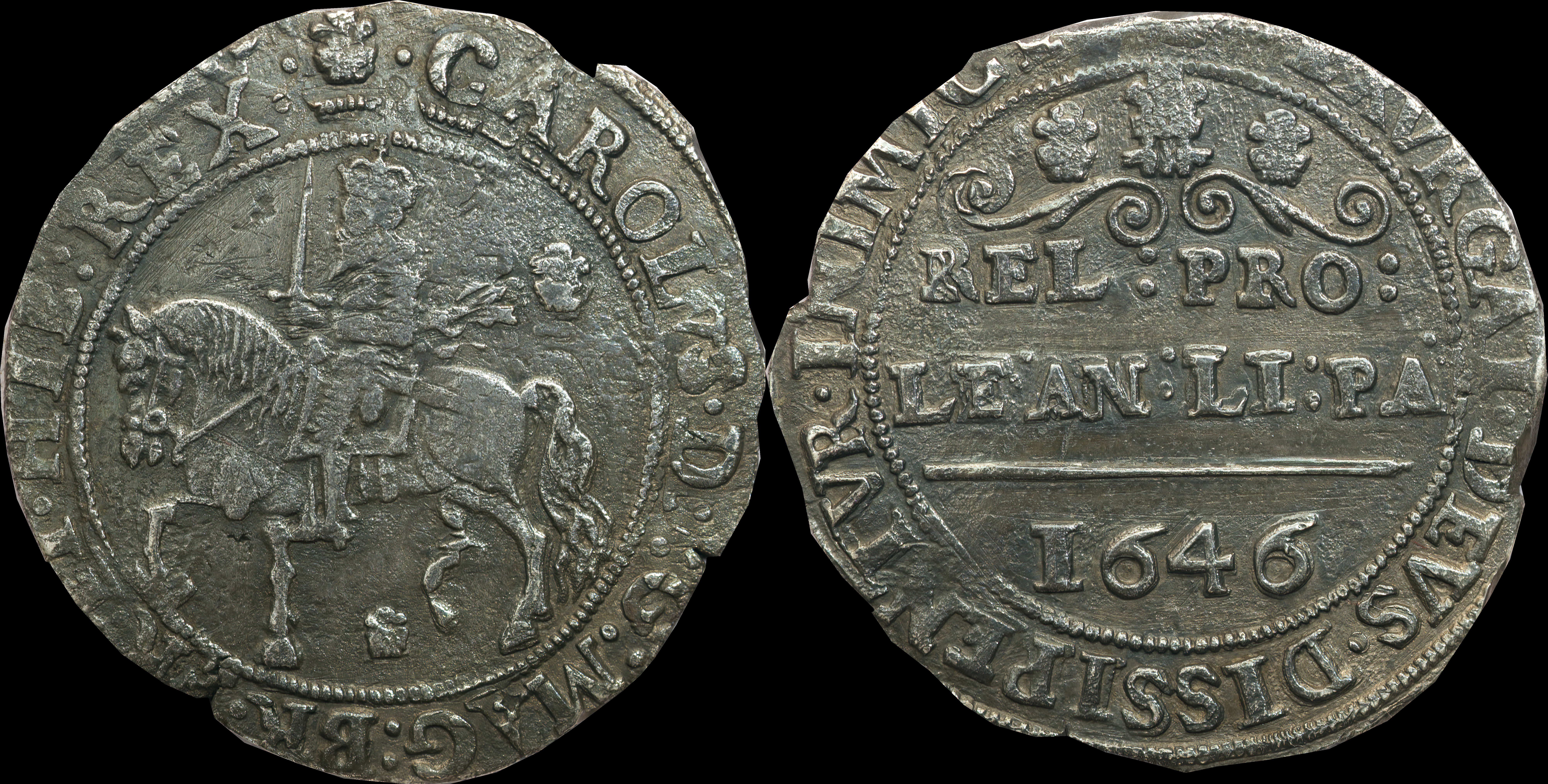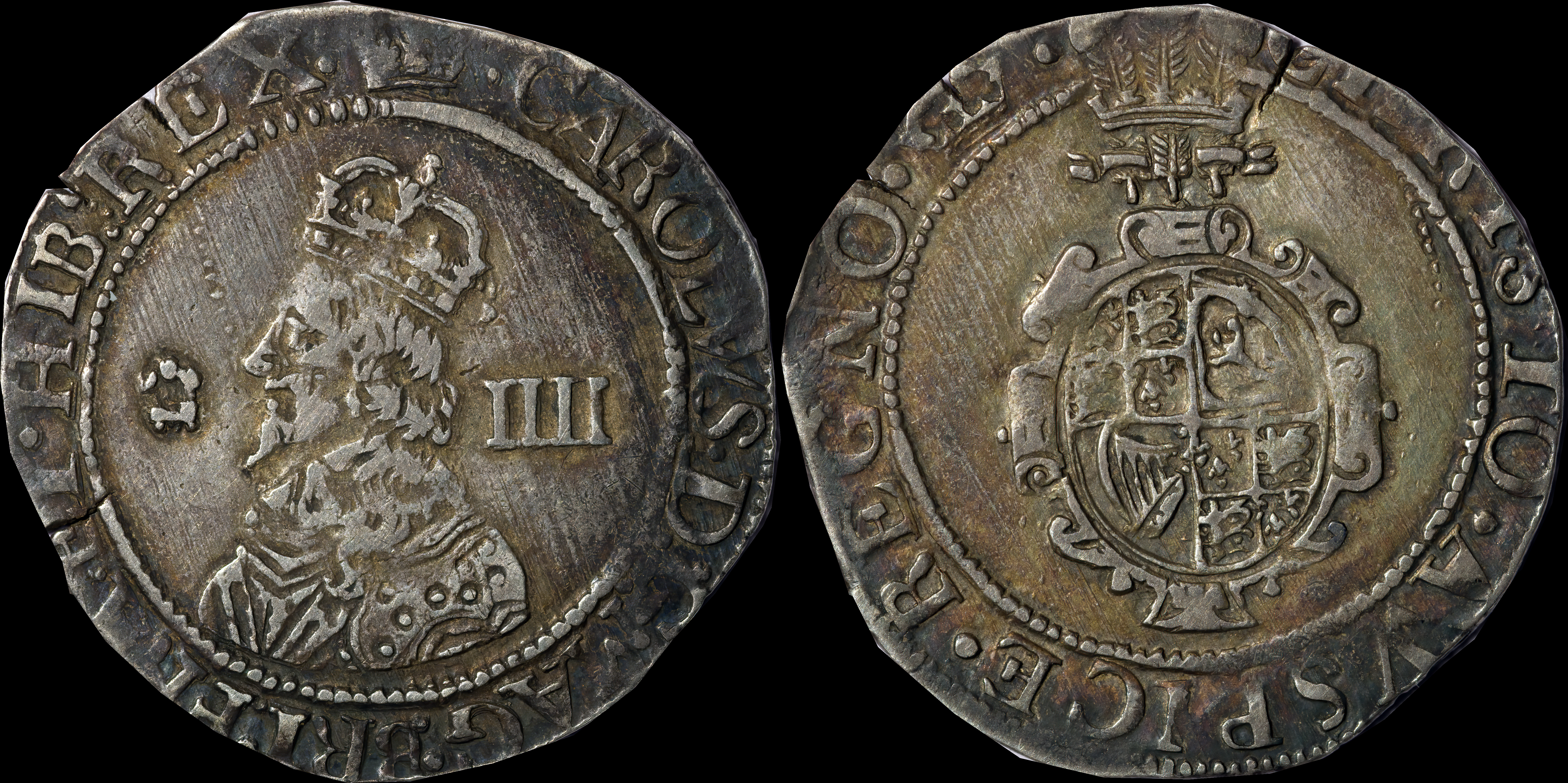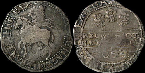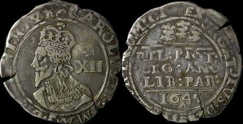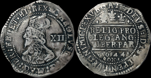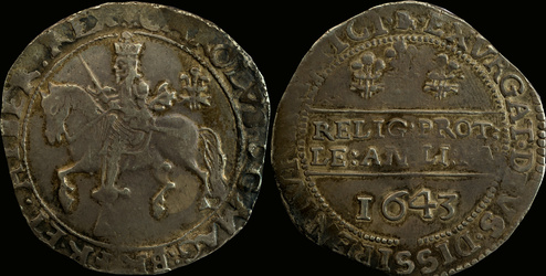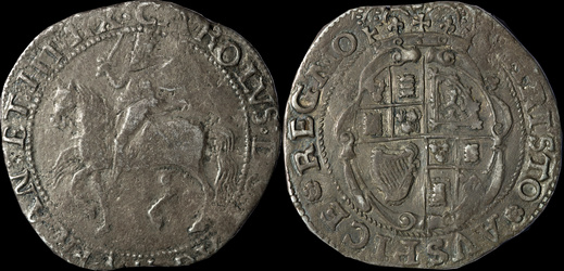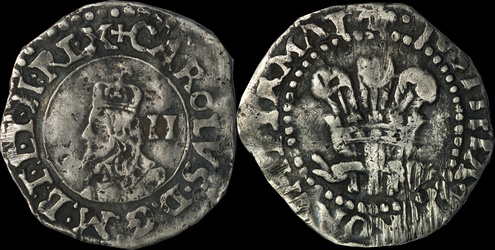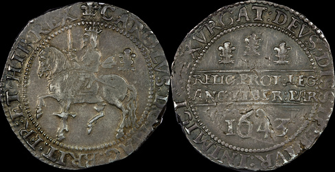In operation from mid 1644 to June 28, 1645 when the beseiged castle surrendered. Issues can read "OBS CARL" (obsidium → "siege"). Original production is estimated at 2,000-4,000 coins with about 20-30 surviving. Issues include Halfcrowns, Shillings, and Threepences.