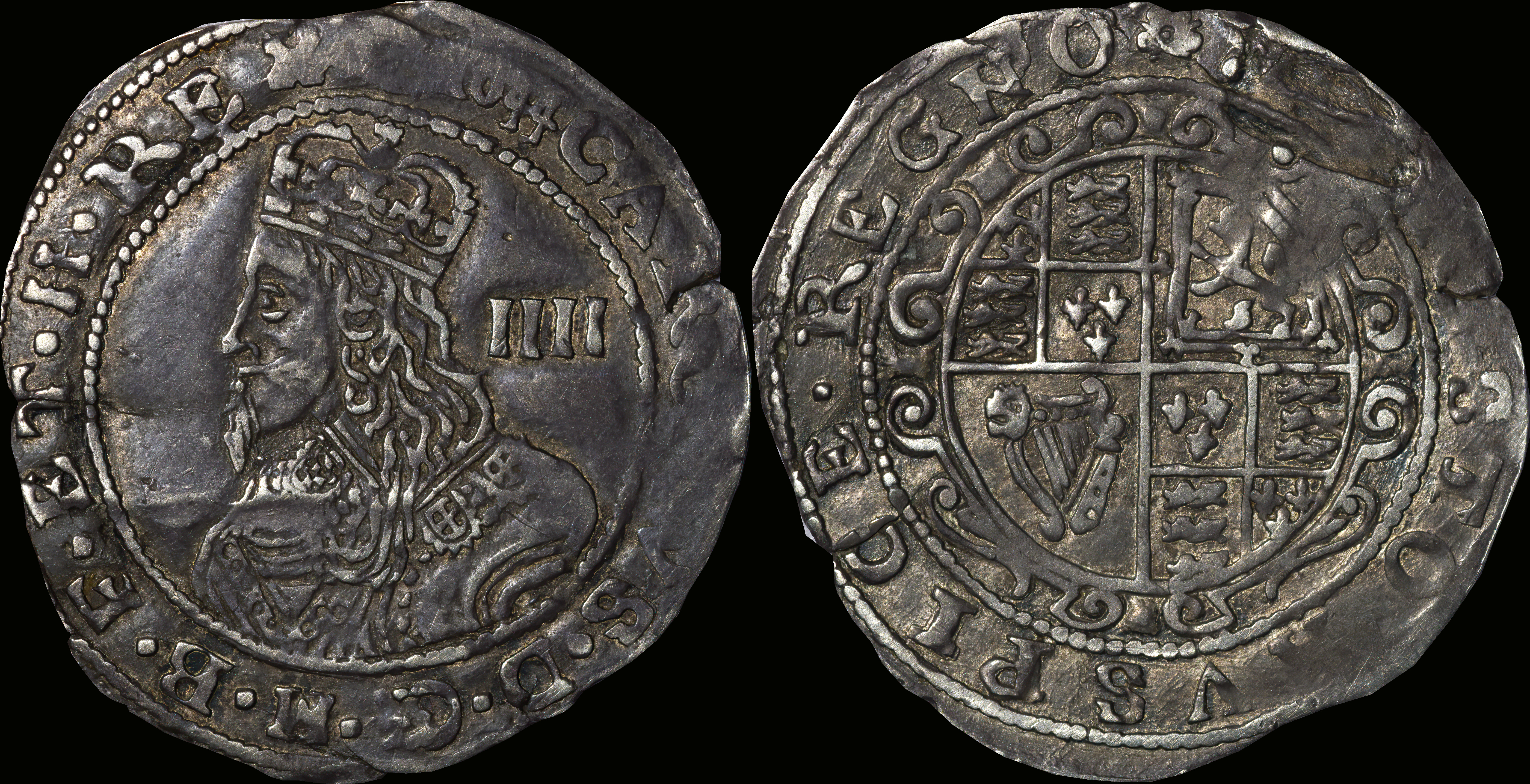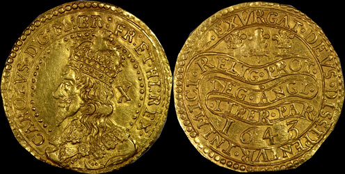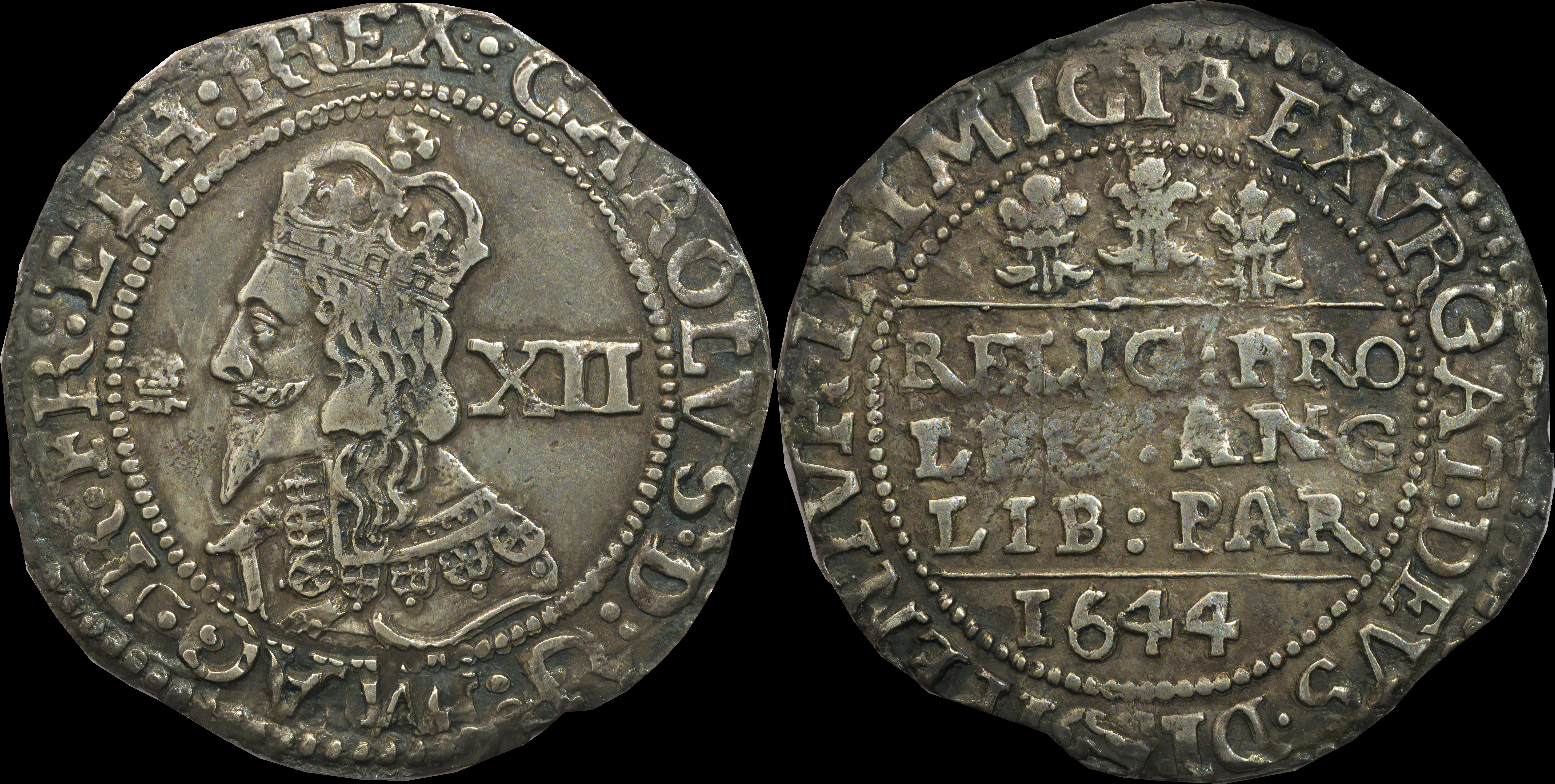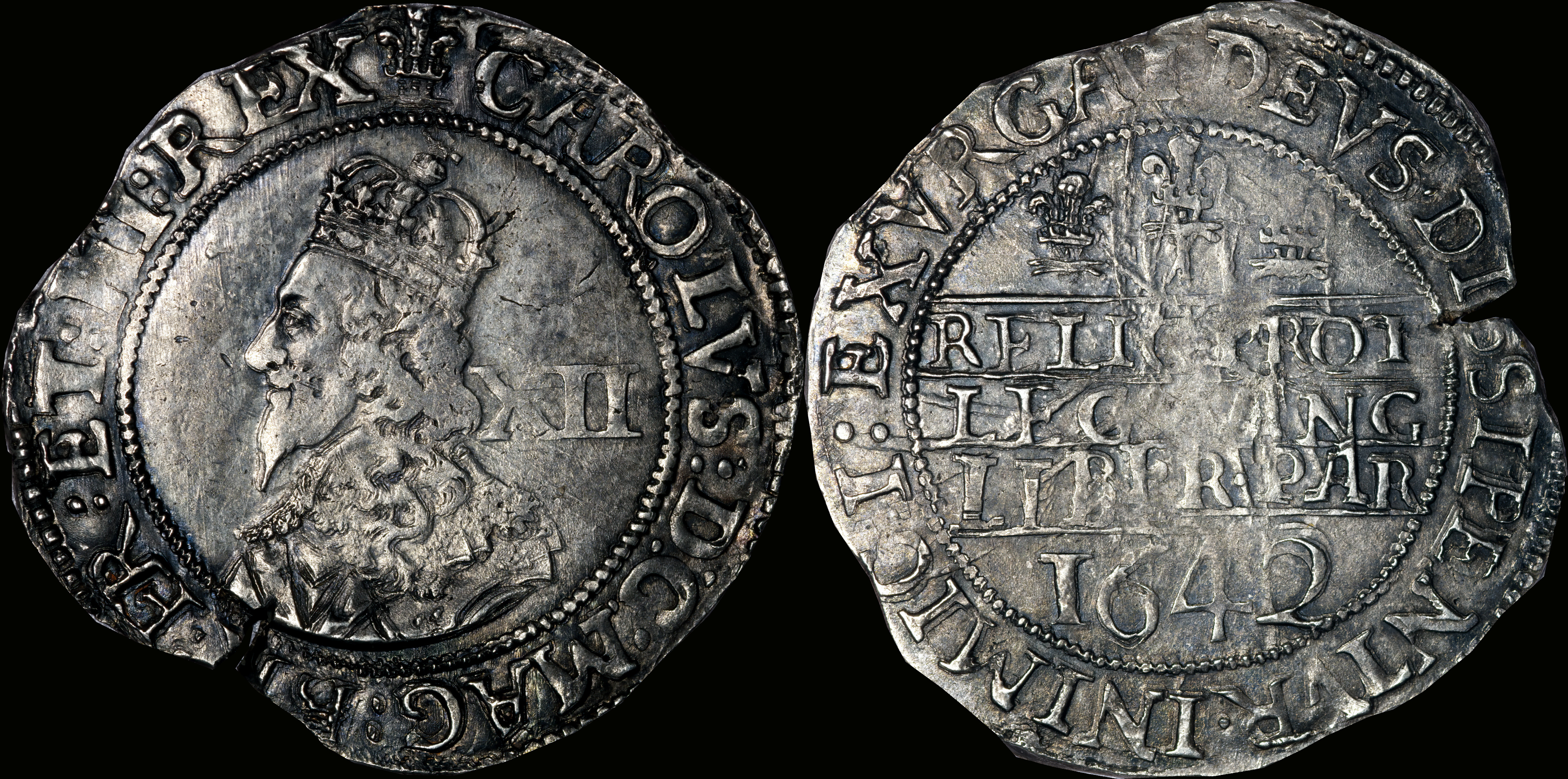 In operation from mid 1644 to June 28, 1645 when the beseiged castle surrendered. Issues can read "OBS CARL" (obsidium → "siege"). Original production is estimated at 2,000-4,000 coins with about 20-30 surviving. Issues include Halfcrowns, Shillings, and Threepences.