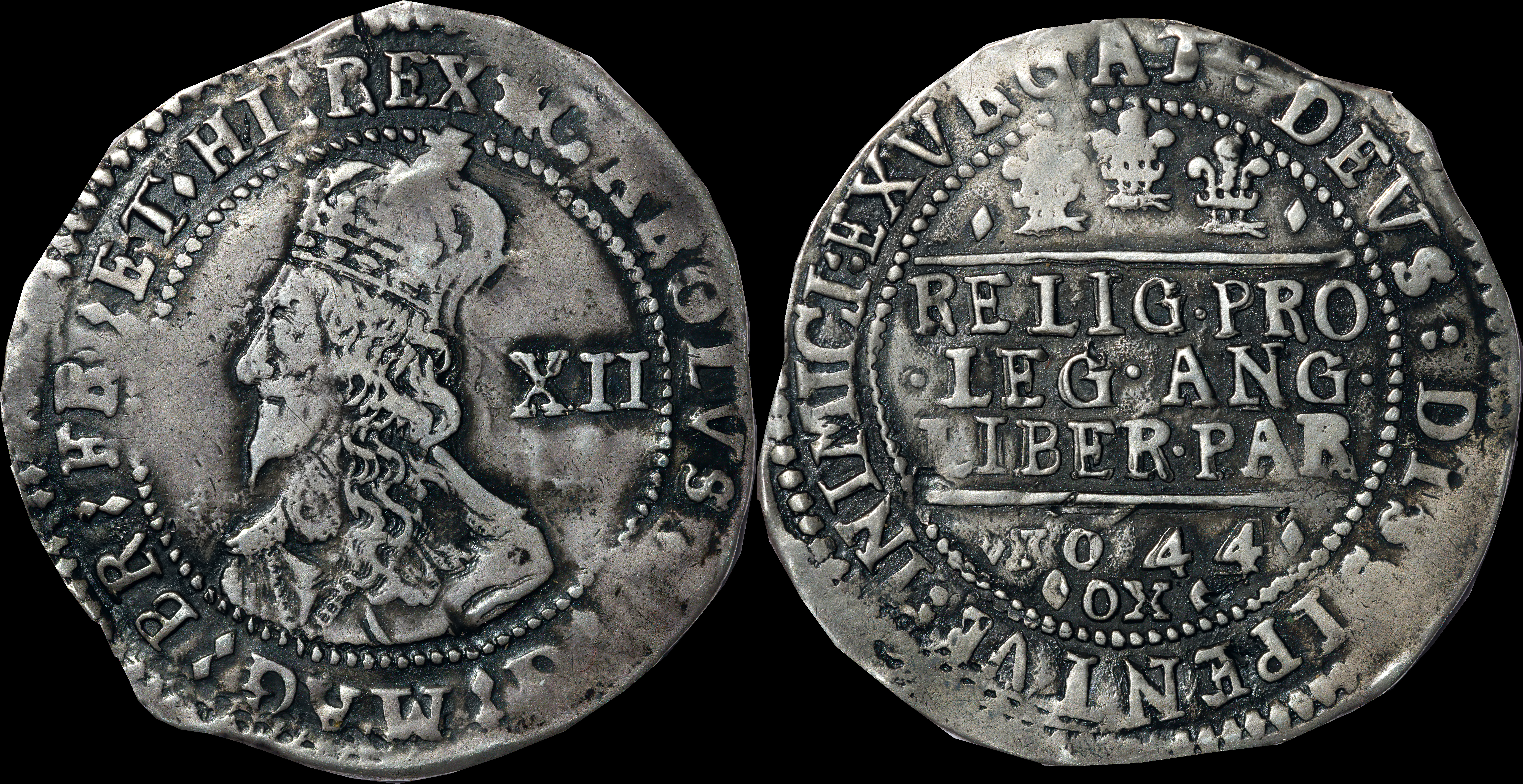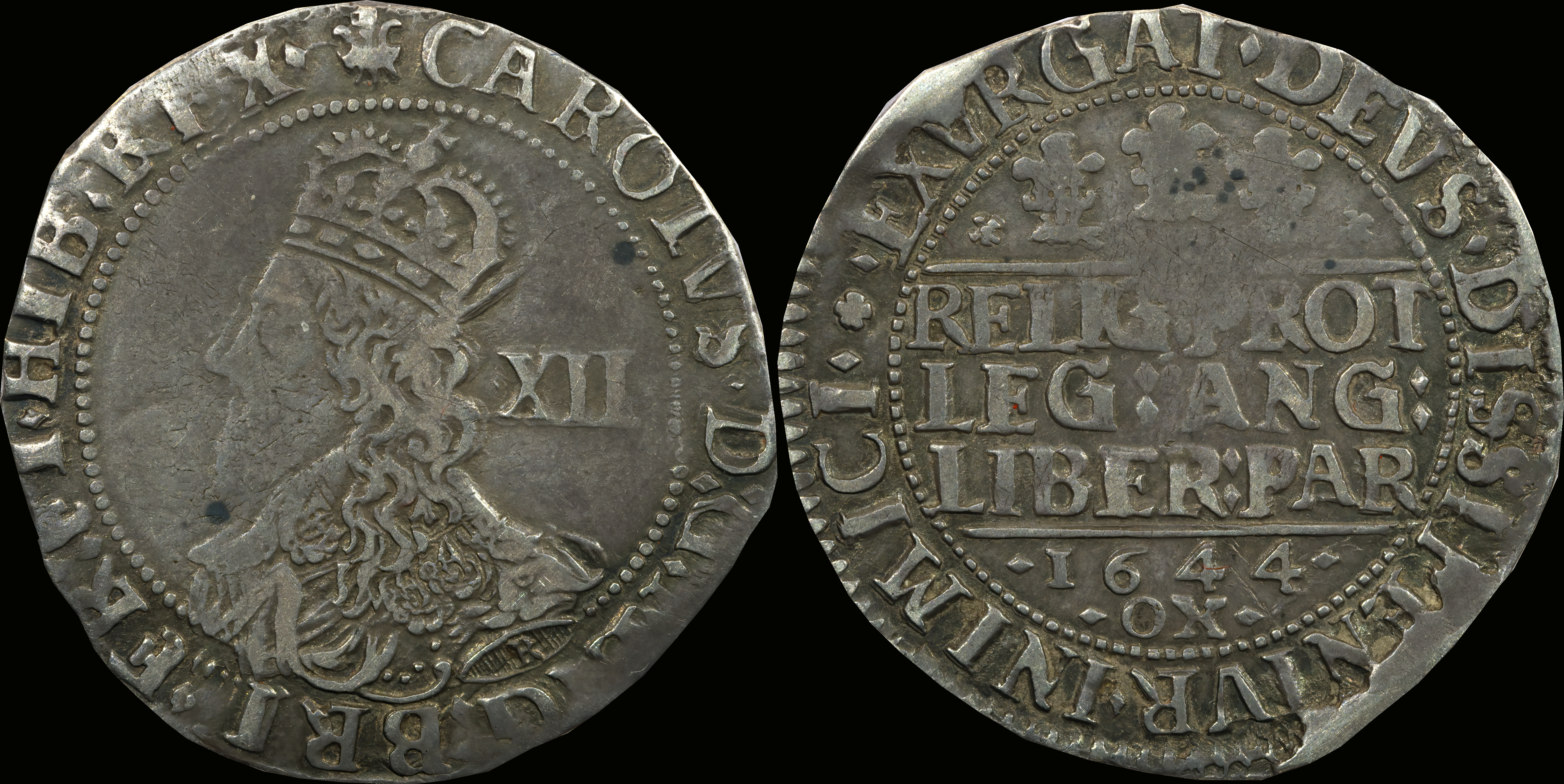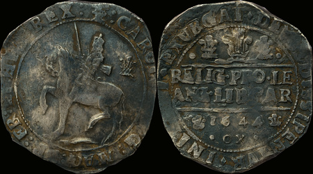 In operation from January 1643 to June 24, 1646 when the town surrendered. Issues are identified by an "OX" mintmark, plume or book privy marks, and with dates from 1642-46. Original production is estimated at 200,000-300,000 coins with about 4,000-6,000 surviving. Issues include Pounds, Half Pounds, Crowns, Halfcrowns, Shillings, Sixpences, Groats, Threepences, Halfgroats, Pennies, gold Triple Unites, Unites, and Double Crowns.