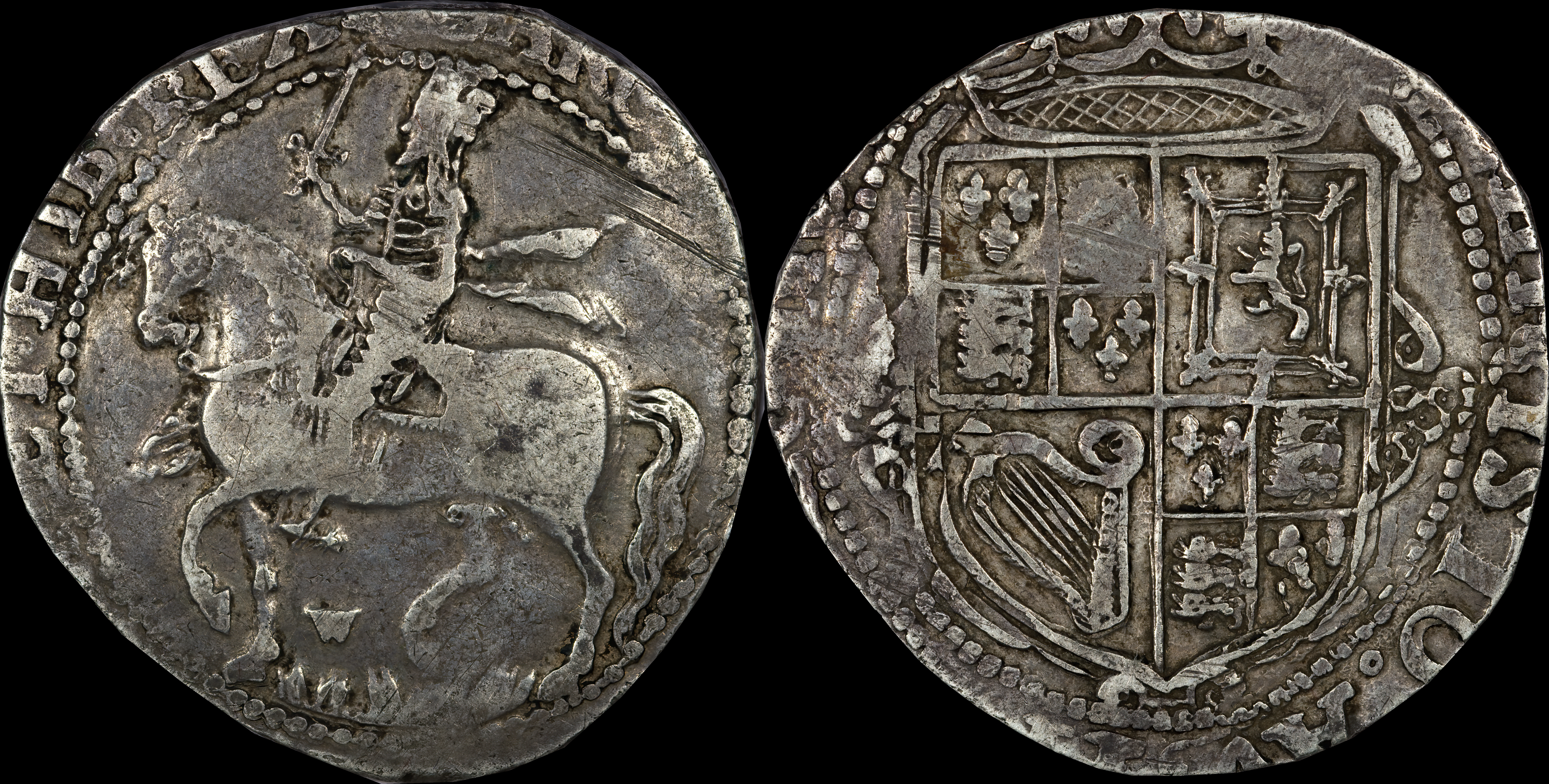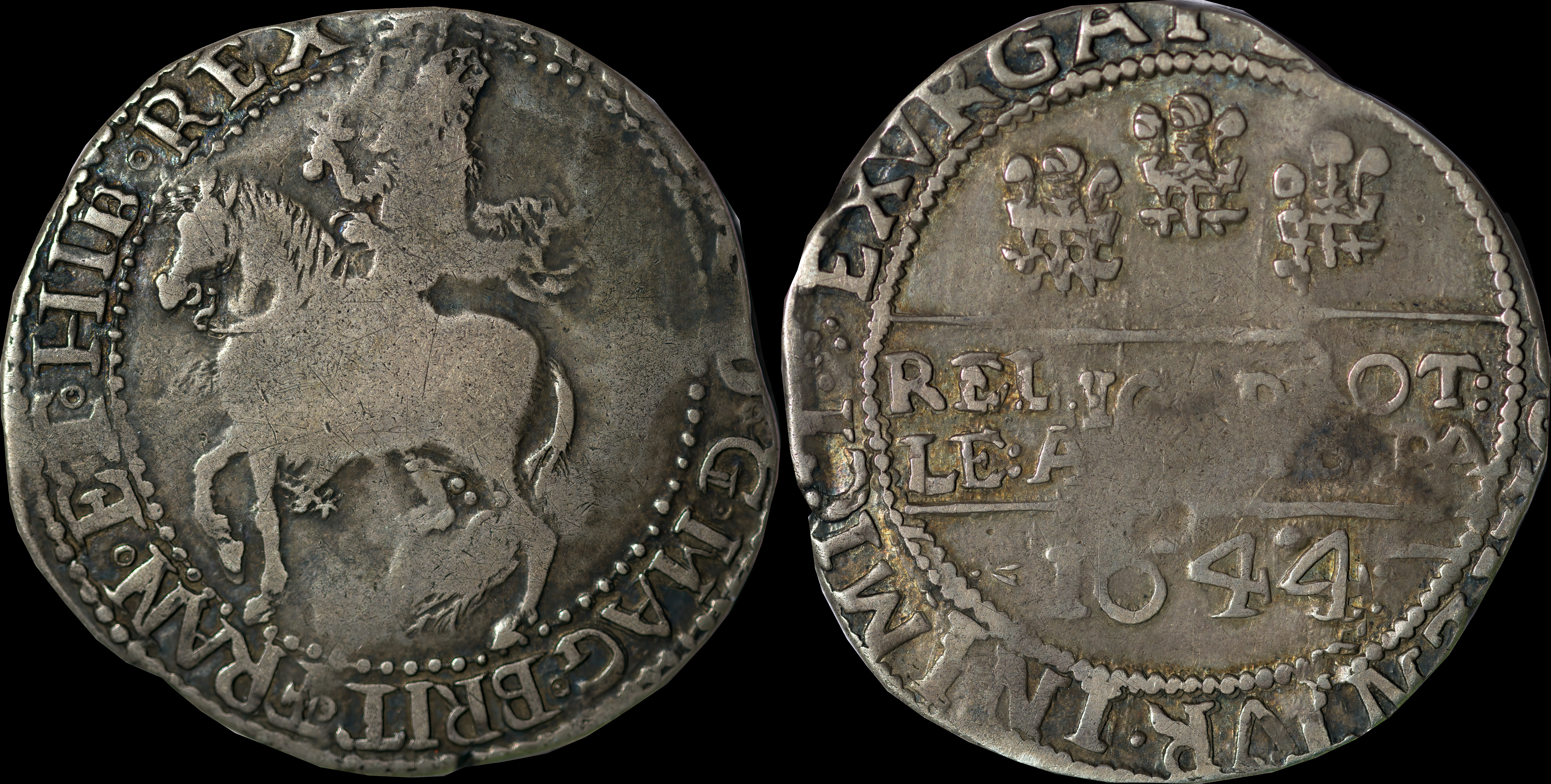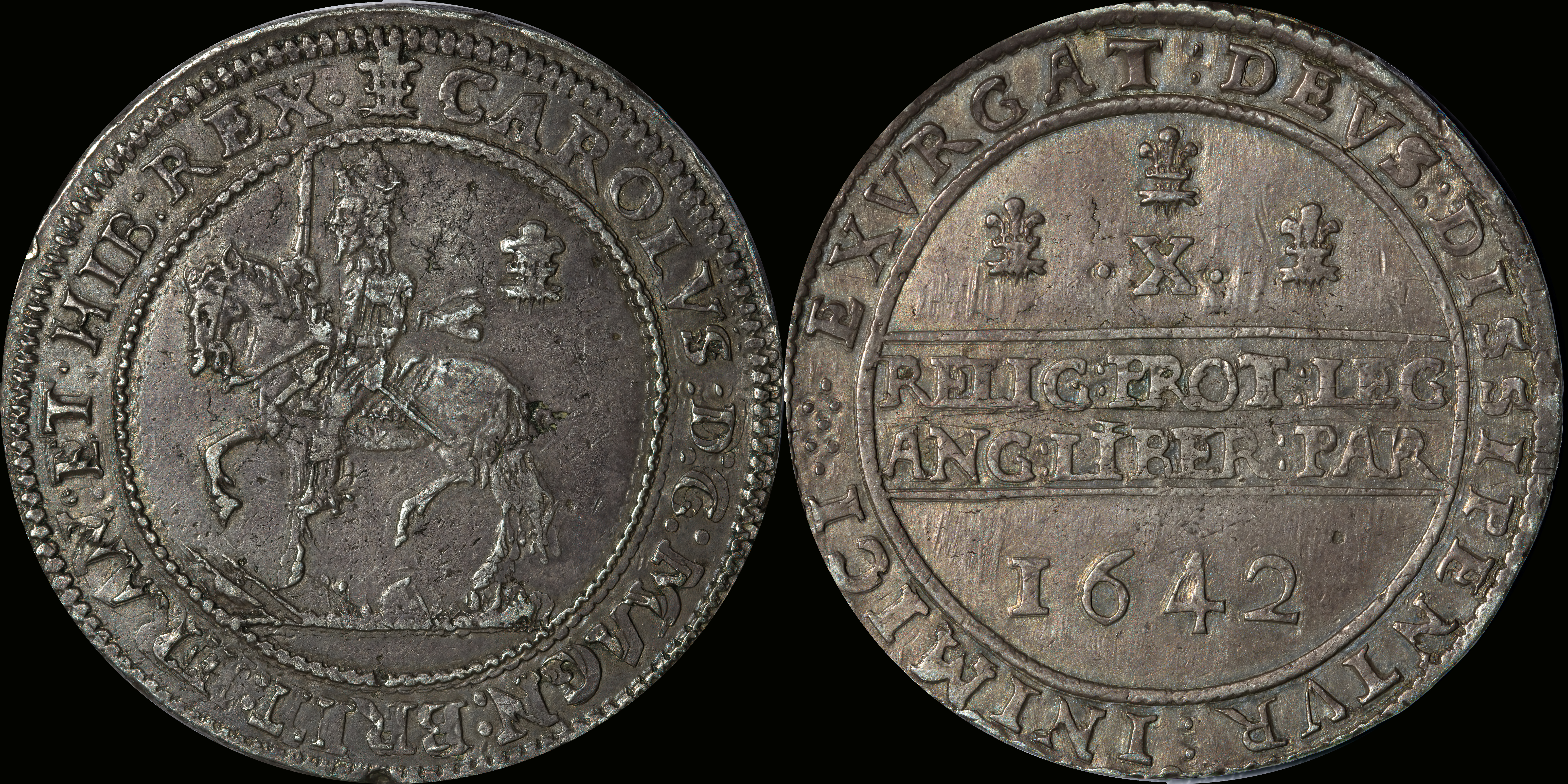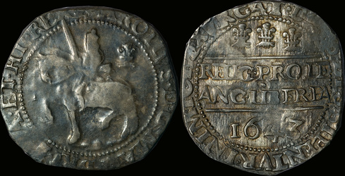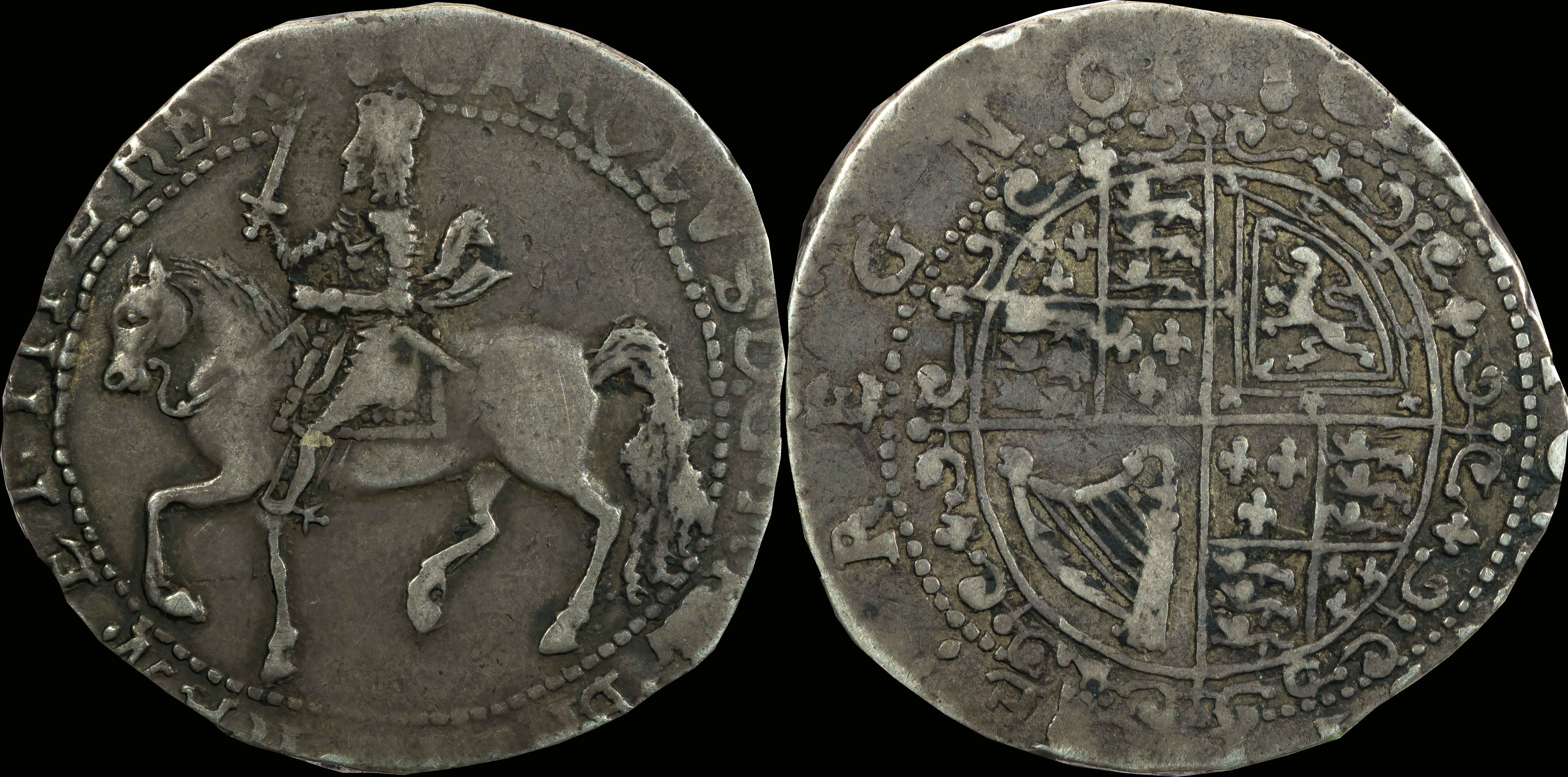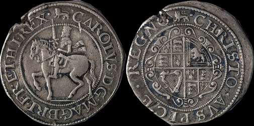 | Bull Oxford 604/D, North 2416, S 2956, PAS: DOR-180F98 = BM 2019 T966/142 this coin. Ansty (Dorset) Civil War Hoard. LL in CAROLLVS, C over G in RELIG. Third discovered of three known (2025). | |