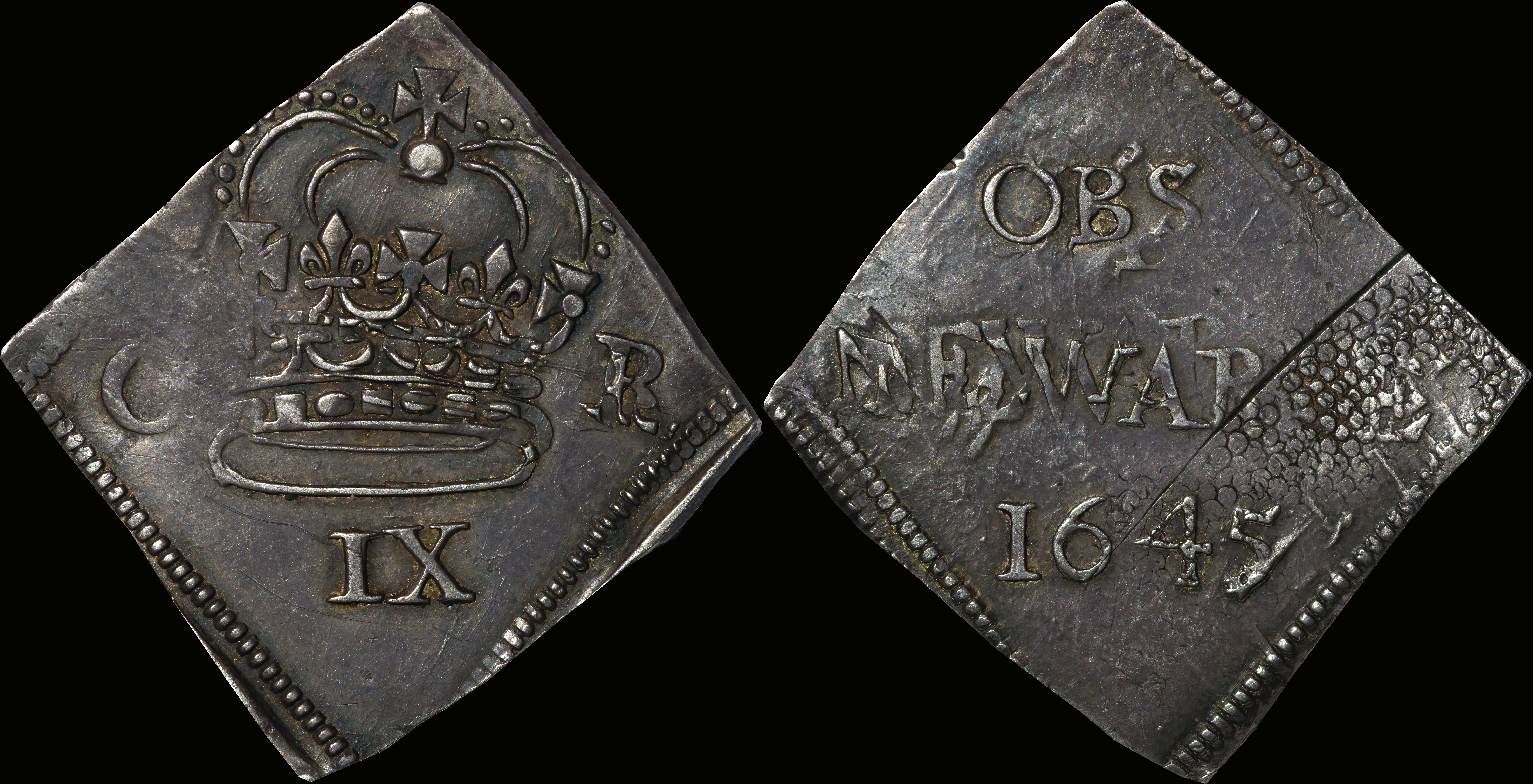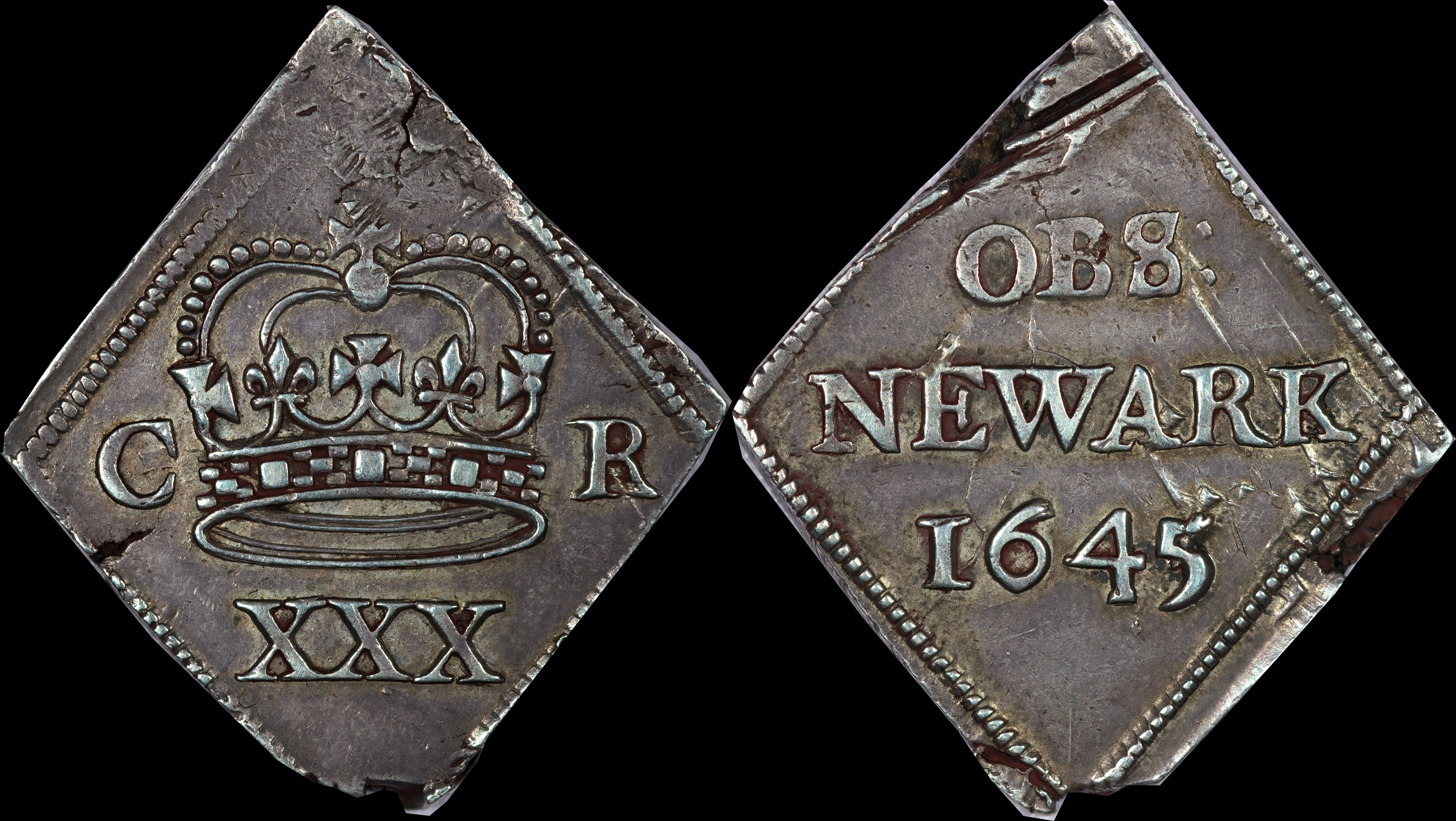 In operation from late 1645 to May 6, 1646 when the town surrendered. Issues can read "OBS NEWARK(E)" (obsidium → "siege"). Original production is estimated at 5,000-10,000 coins with about 100-200 surviving. Issues include Halfcrowns, Shillings, Ninepences, and Sixpences.