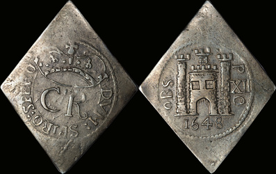 In operation from early 1648 to early 1649 during an 11 month siege, surrendering December 22, 1648. Issues are generally lozenge or octagonal pieces with a crude representation of the castle and a denomination, but appear to also have struck the Fortuna issues without a denomination. Original production is estimated at 250-500 pieces with a denomination, with about 15-22 surviving. Issues include Halfcrowns, Shillings, and a very low number of gold pieces.