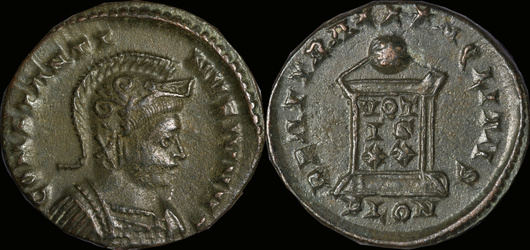 CONSTANTINVS IVN NOB C CAESARVM NOSTRORVM P LON (crescent) |