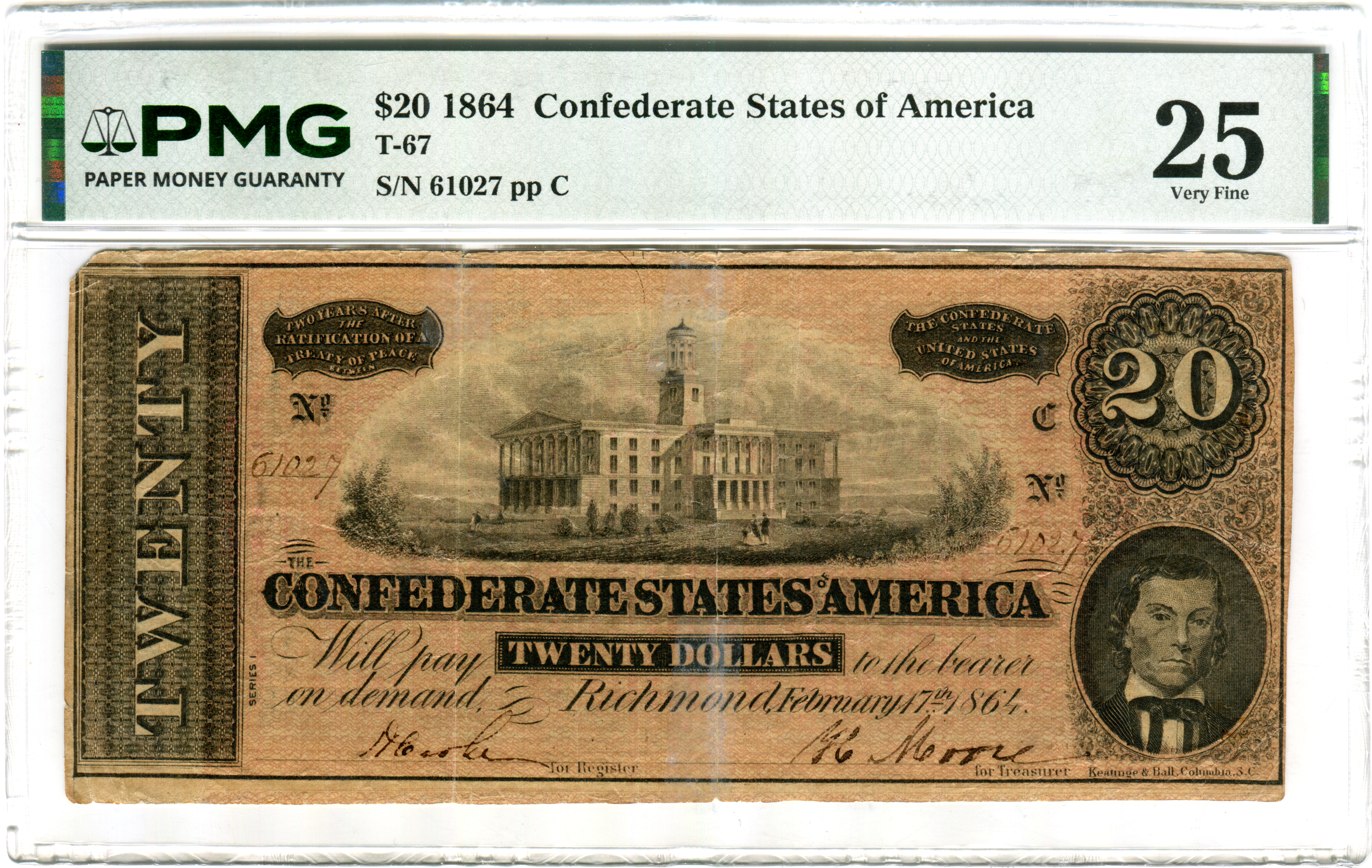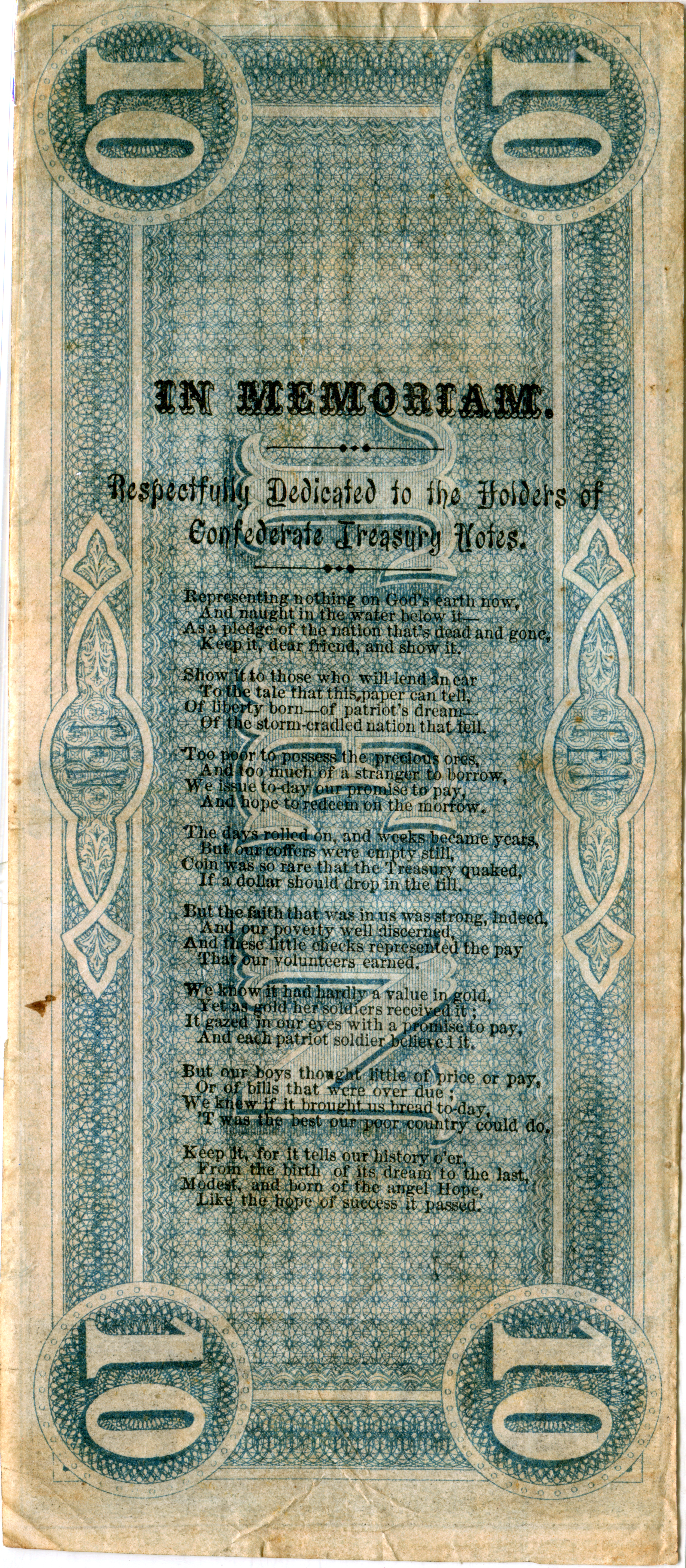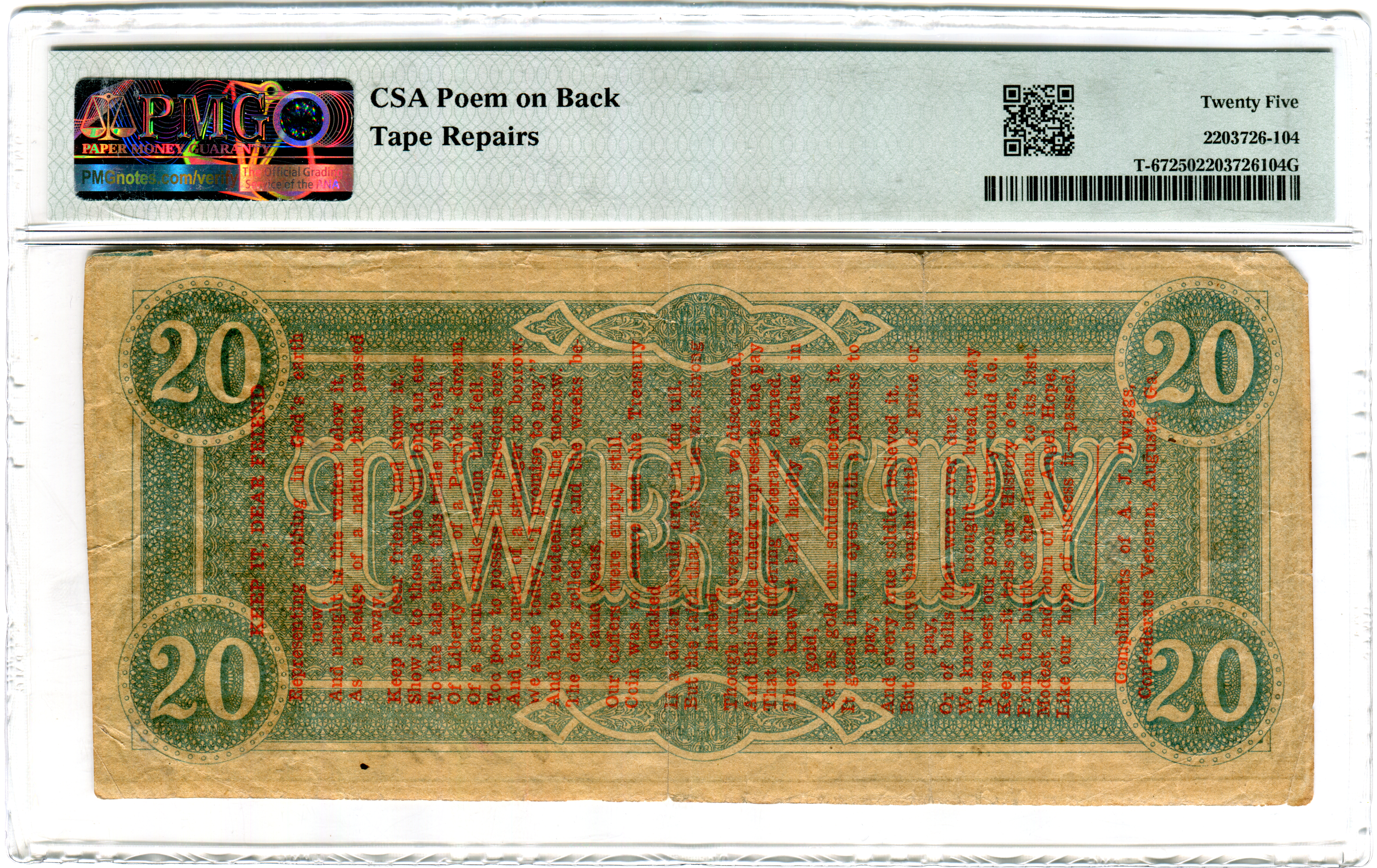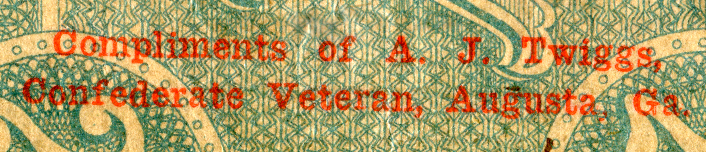 T-67. Poem overprinted on a T-67 note. Compliments of A.J. Twiggs, Confederate Veteran, Augusta, Georgia.