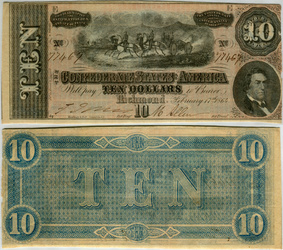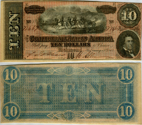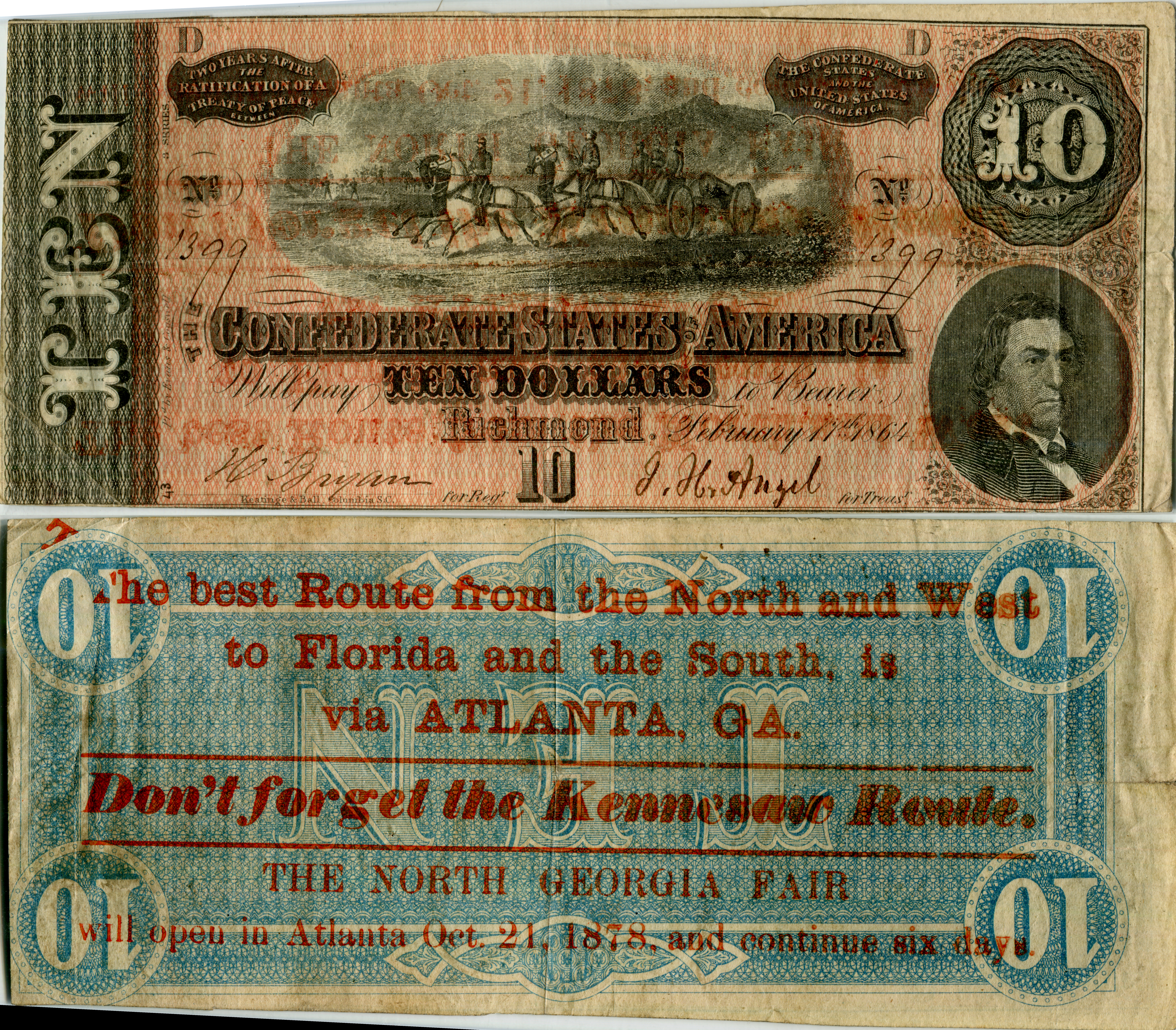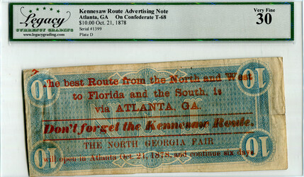 T-68, Cr#545, PF-15. Oct 21, 1878 Kennesaw route railroad advertising on a Confederate $10.