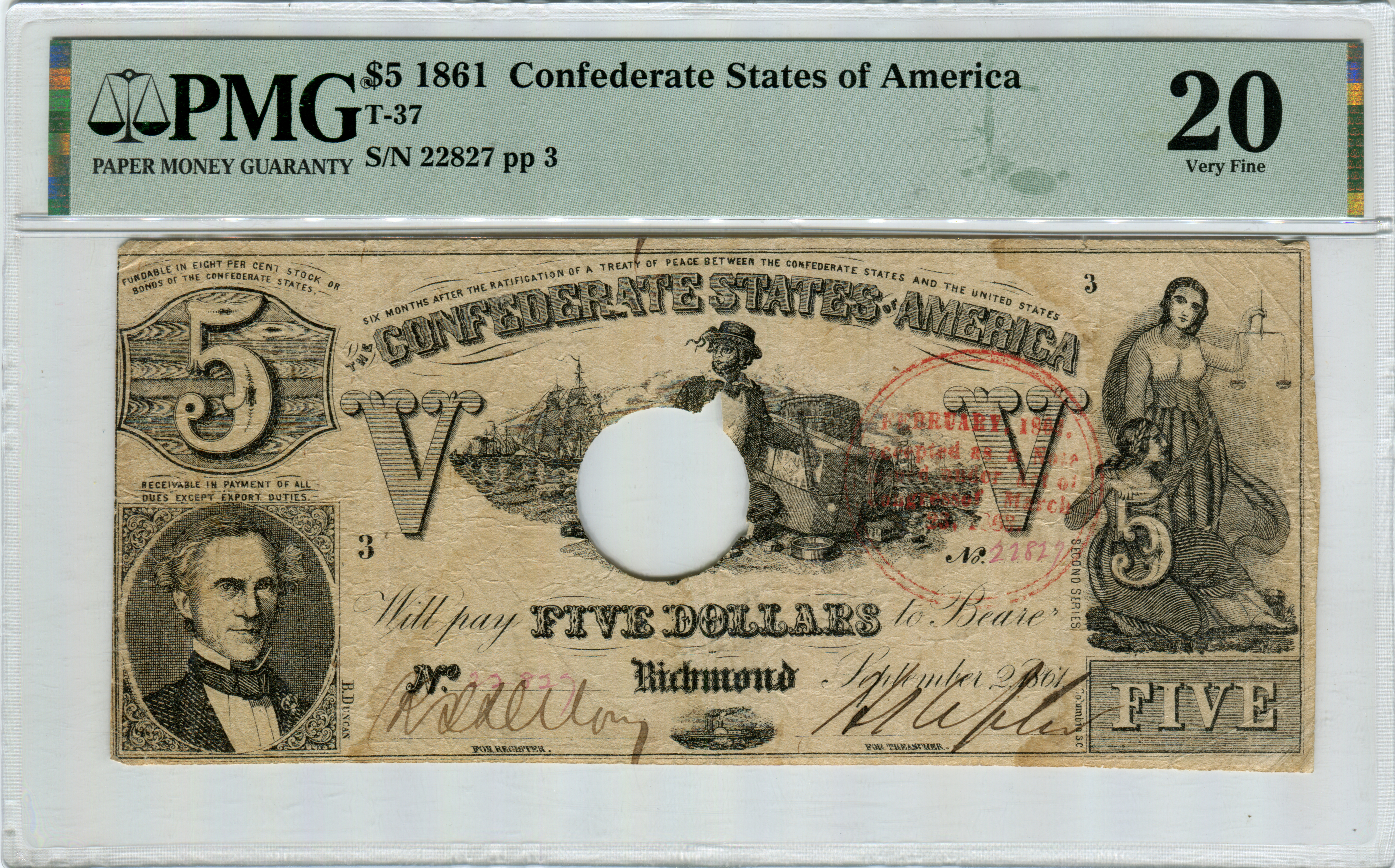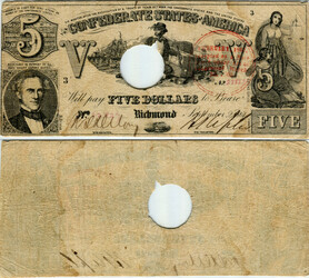 T-37, Cr#285, PF-2 (CR6, FR1). Cancelled, stamped in 1864 with Trans-Mississippi re-issue stamp.