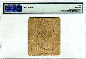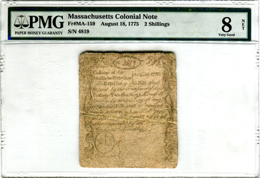 Massachusetts. August 18, 1775. 10,000 printed. Contemporary sewn repair. Engraved and printed by Paul Revere.